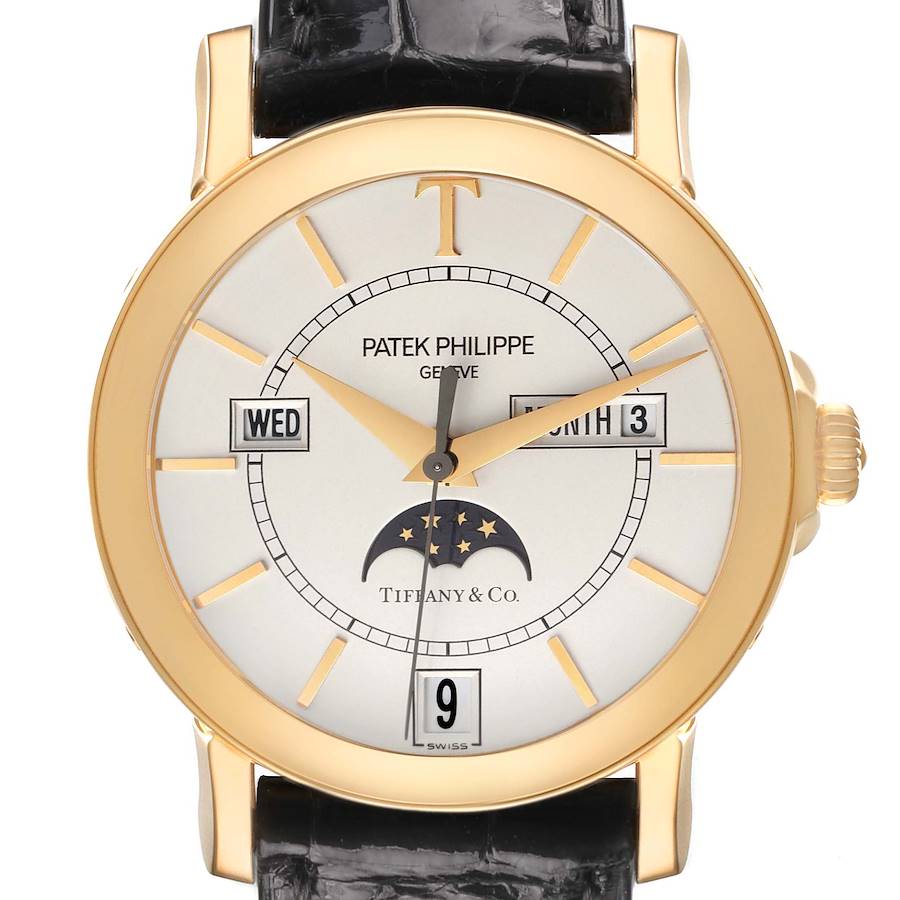 Patek Philippe Tiffany Annual Calendar Yellow Gold Mens Watch 5150 5150J Box Papers. Automatic movement. Rhodium-plated, fausses cotes decoration, straight-line lever escapement, Gyromax balance adjusted to heat, cold, isochronism and 5 positions, shock absorber, self-compensating free-sprung flat balance spring. 18k yellow gold three-part officer-style case 36.0 mm in diameter. hinged case back over transparent crystal to view the movement, extended screwed lugs. Case back engraved with Tiffany and Co flagship store and 1851 to 2001 for 150th anniversary. 18k yellow gold round bezel. Scratch resistant sapphire crystal. Silver dial with raised yellow gold index hour markers. Apertures for the days of the week at 9, the months at 3, date and moon-phase indicators at 6 o'clock. Black leather strap with 18K yellow gold deployant buckle.