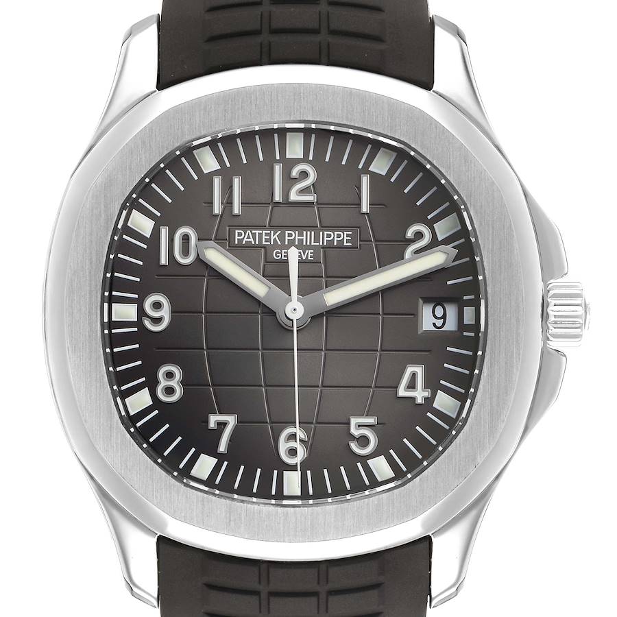Patek Philippe Aquanaut Steel Mens Watch 5167 5167A Box Papers. Automatic self-winding movement. Stainless steel round case 40.0 mm. Transparent exhibition sapphire crystal caseback. Crown guards. Patek Philippe logo on the crown. Stainless steel flat bezel. Scratch resistant sapphire crystal. Embossed black dial with white raised Arabic numerals. Luminescent sword-shaped hands and index hour markers. White center sweeping seconds hand. Date calendar at the 3 o'clock aperture. Outer stick minute markers. "Tropical" composite black strap with a stainless steel fold-over clasp.