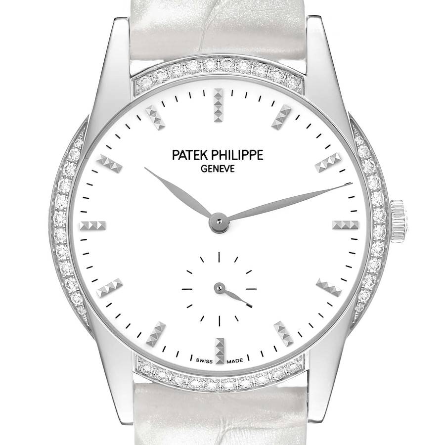 Patek Philippe Calatrava 18k White Gold Diamond 7122G 7122 Box Papers. Manual-winding movement. 18k white gold case 33.0 mm in diameter. Exhibition transperrent sapphire crystal case back. 18k white gold bezel set with Patek factory diamonds. Scratch resistant sapphire crystal. White lacquered dial with gold applied hobnail-patterned hour markers. White gold leaf shaped hands. Small seconds sub-dial at 6 o'clock. White leather strap with 18K white gold tang buckle.