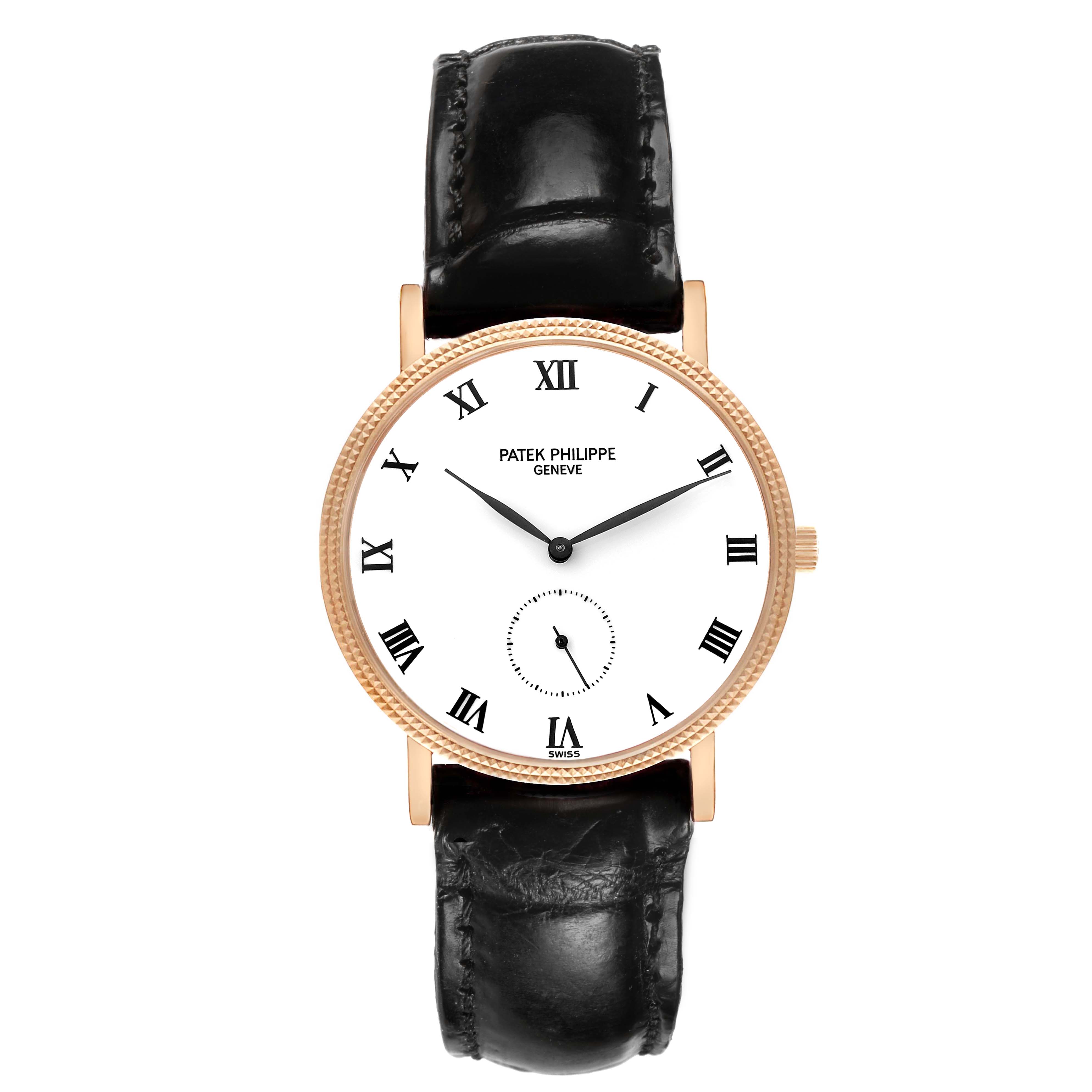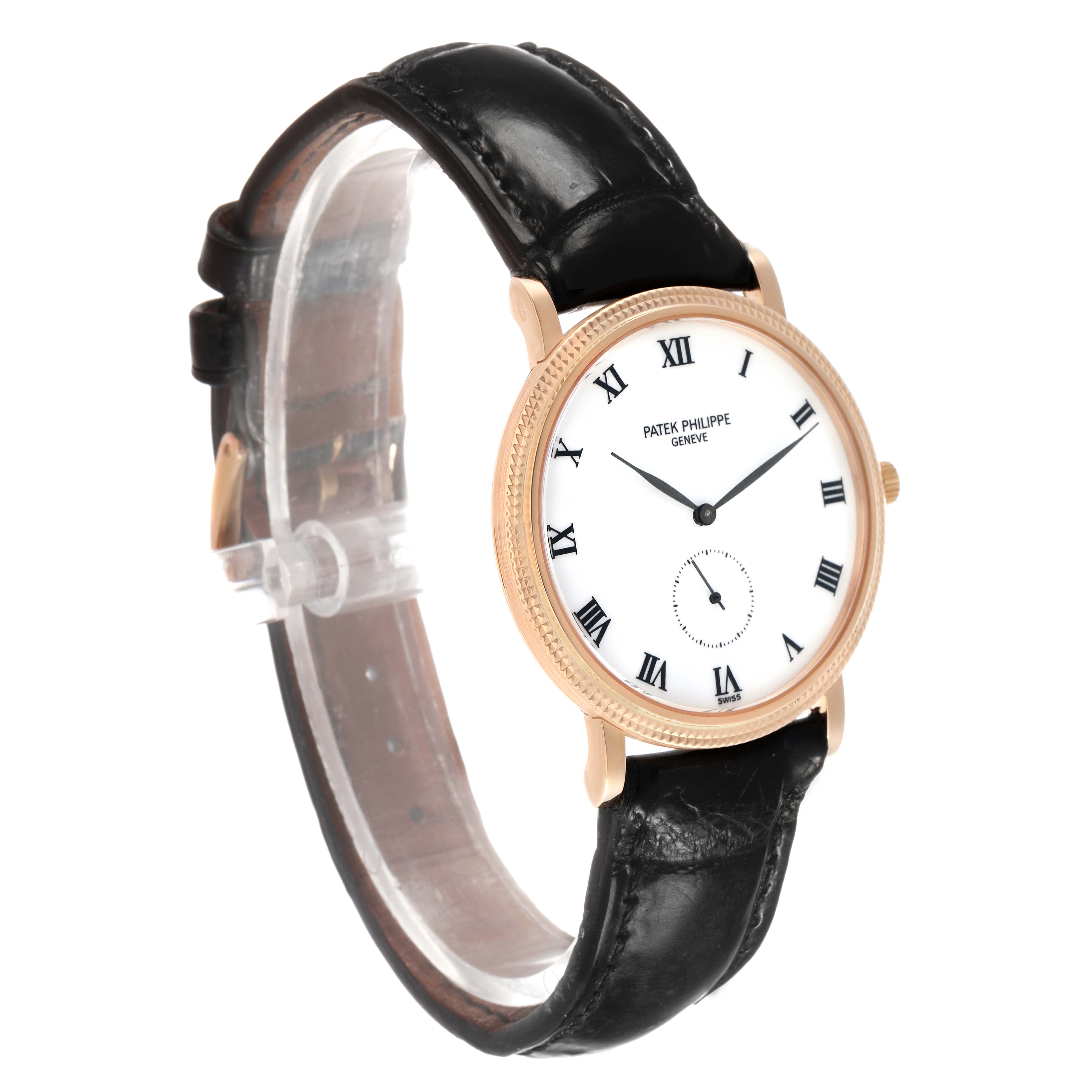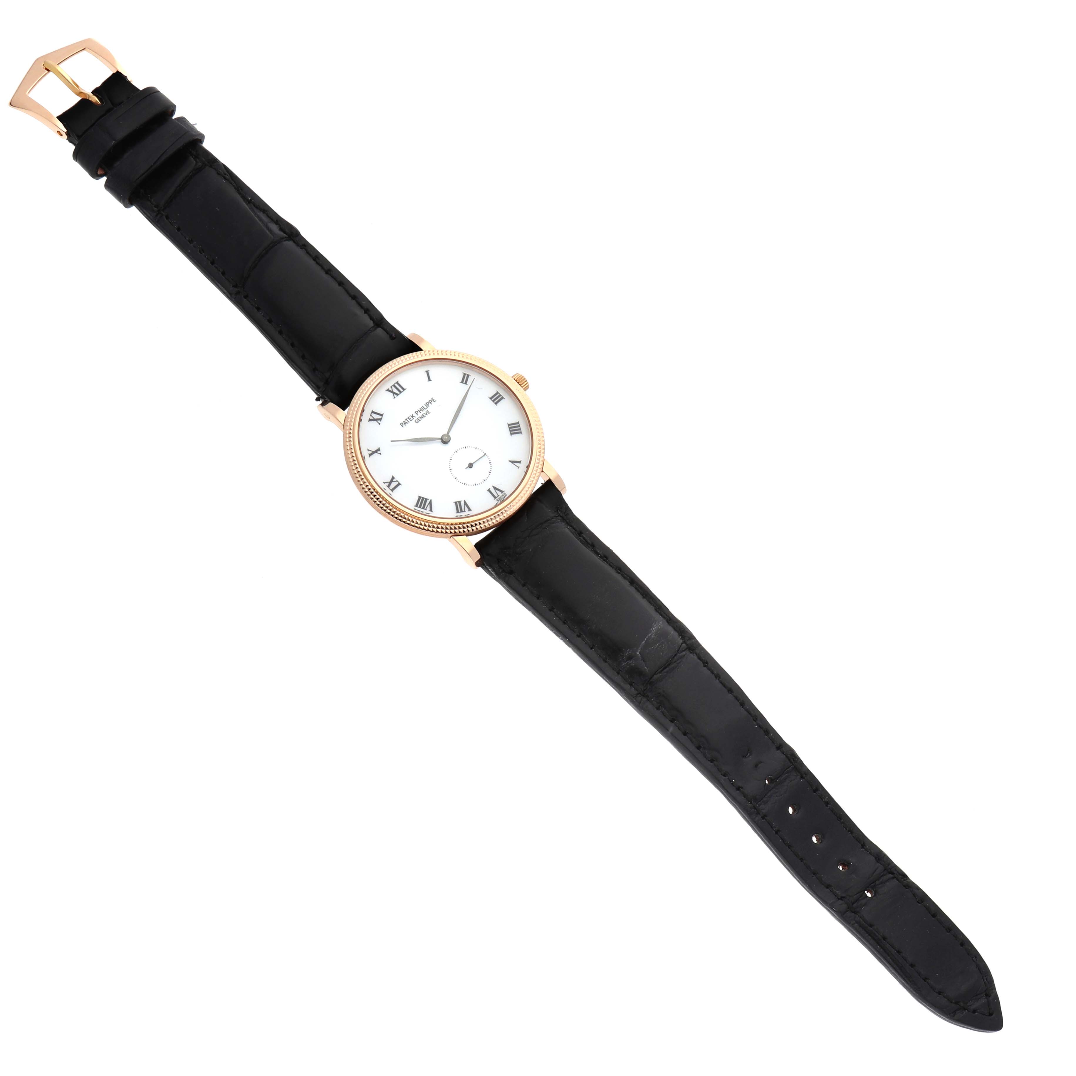 Patek Philippe Calatrava Rose Gold Roman Dial Mens Watch 3919R Papers. Manual winding movement. Rhodium plated, fausses cotes decoration, straight-line lever escapement, Gyromax balance adjusted to heat, cold, isochronism and 5 positions, shock absorber self-compensating free-sprung flat balance spring. Ultra-thin 18k rose gold round case 33.0 mm in diameter. Patek Philippe logo on the 18k rose gold crown. 18k rose gold "Clous de Paris" hobnail pattern bezel. Scratch resistant sapphire crystal. White lacquered dial with painted black Roman numeral hour markers and oxidized feuille hands. Small seconds subdial at 6 o'clock. Custom black leather strap with an 18K rose gold tang buckle.