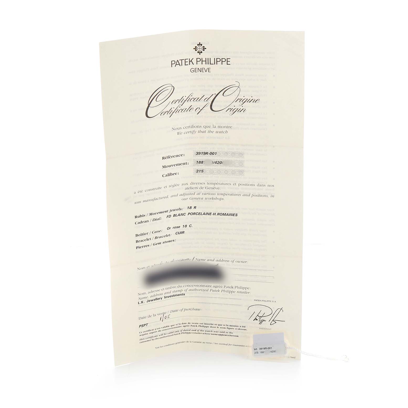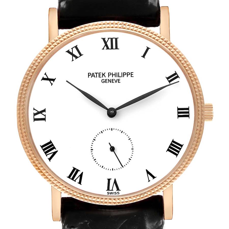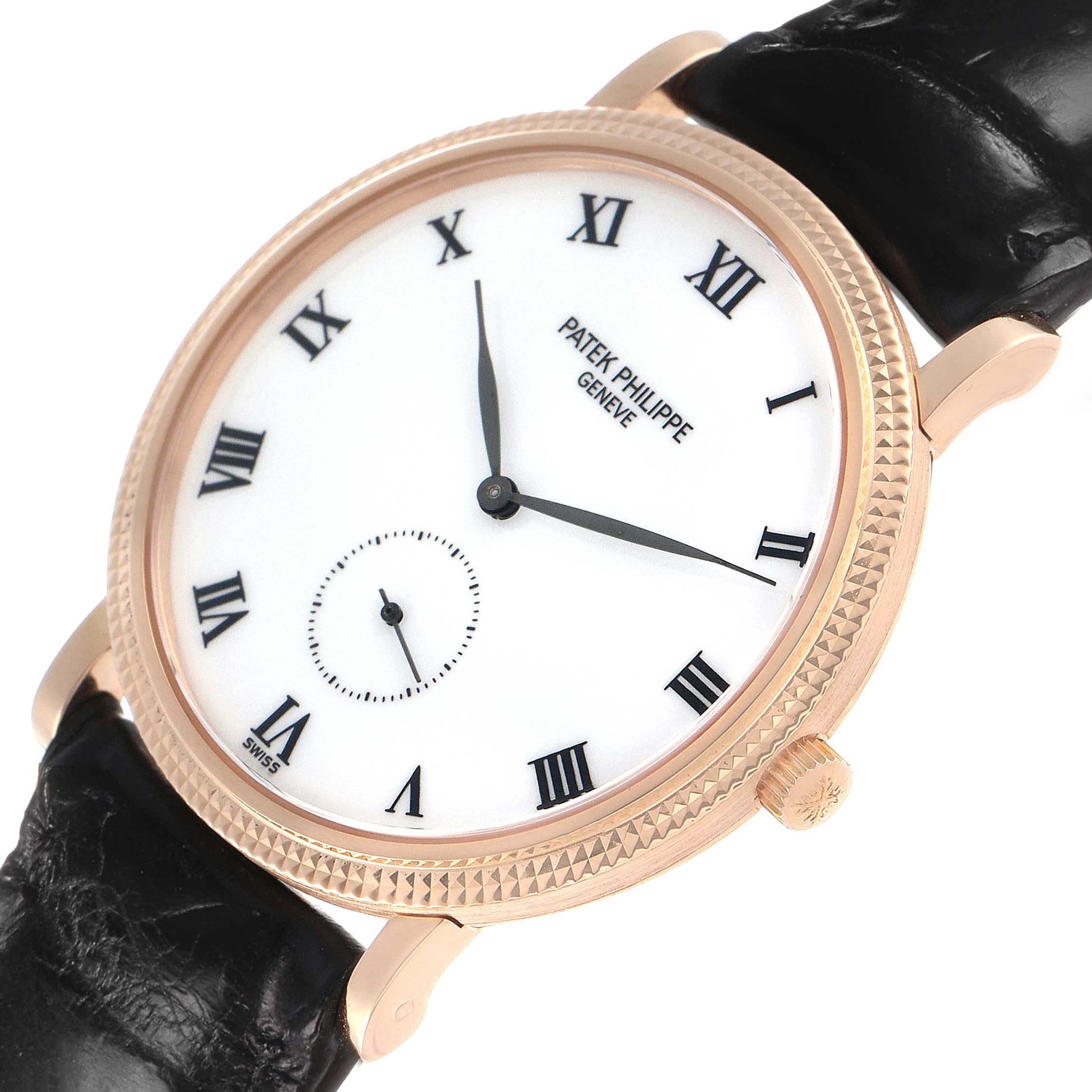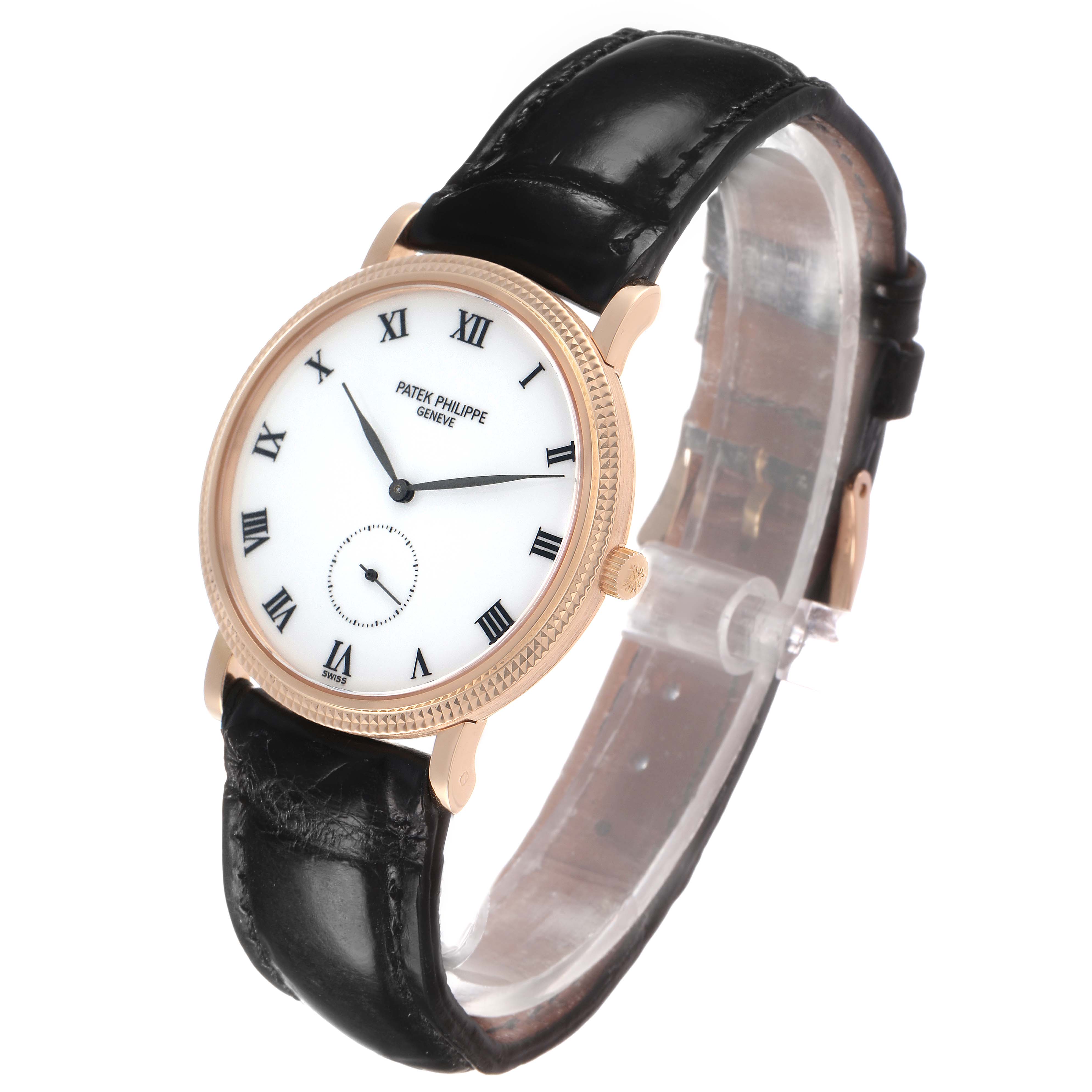 Patek Philippe Calatrava Rose Gold Roman Dial Mens Watch 3919R Papers. Manual winding movement. Rhodium plated, fausses cotes decoration, straight-line lever escapement, Gyromax balance adjusted to heat, cold, isochronism and 5 positions, shock absorber self-compensating free-sprung flat balance spring. Ultra-thin 18k rose gold round case 33.0 mm in diameter. Patek Philippe logo on the 18k rose gold crown. 18k rose gold "Clous de Paris" hobnail pattern bezel. Scratch resistant sapphire crystal. White lacquered dial with painted black Roman numeral hour markers and oxidized feuille hands. Small seconds subdial at 6 o'clock. Custom black leather strap with an 18K rose gold tang buckle.
