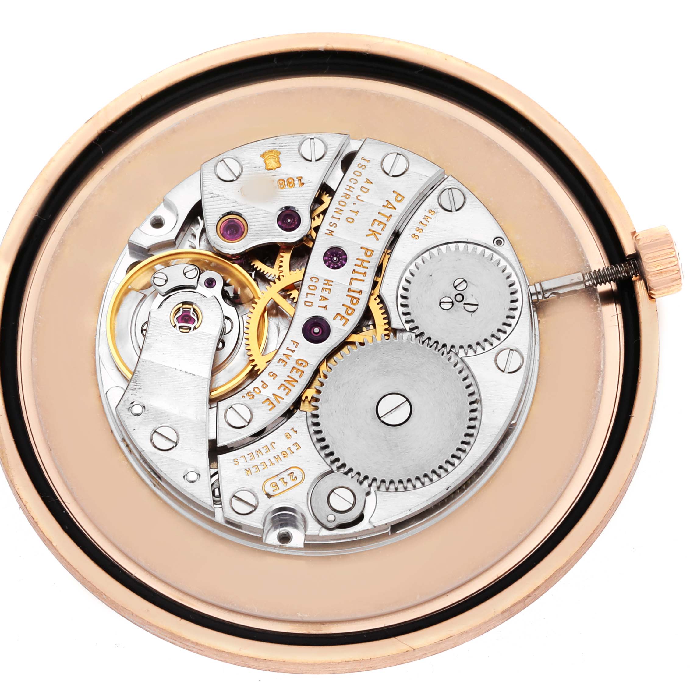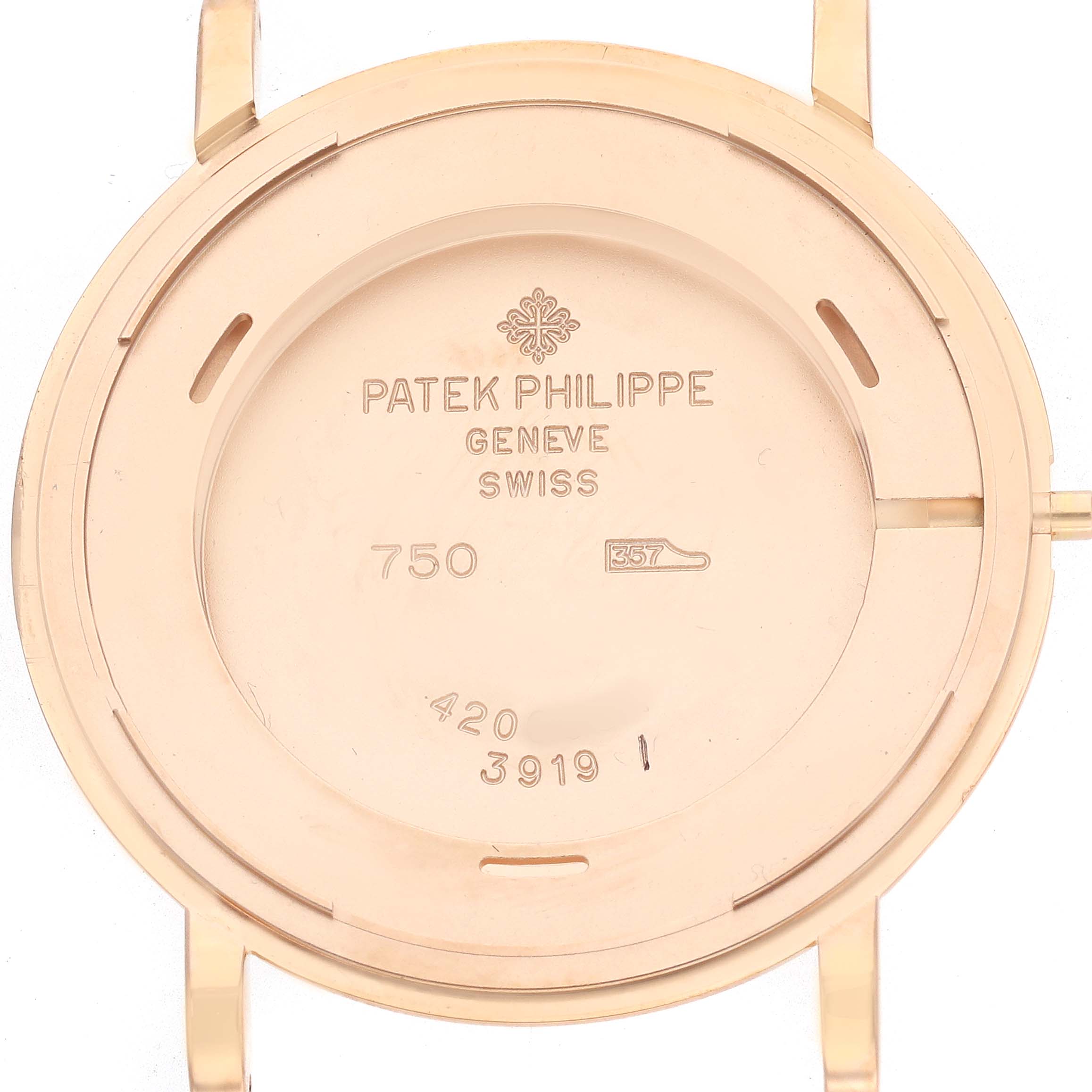 | Case: | Ultra-thin 18k rose gold round case 33.0 mm in diameter. Patek Philippe logo on the 18k rose gold crown. |