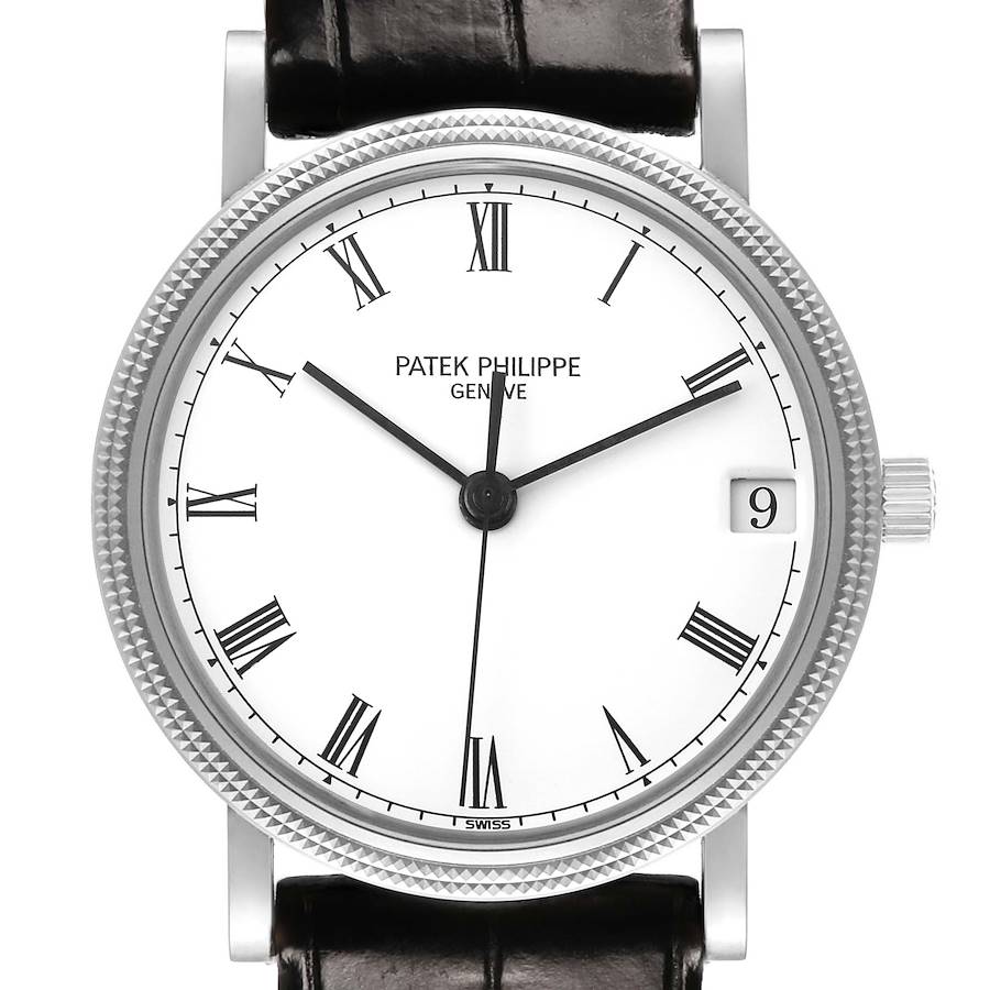 Patek Philippe Calatrava White Gold Automatic Mens Watch 3802 3802G. Automatic self-winding movement. Rhodium-plated, fausses cotes decoration jewels, straight line lever escapement, and a monometallic balance adjusted to heat, cold, isochronism, and 5 positions. Shock absorber and self-compensating flat balance spring gold rotor. 18k white gold round case 33.0 mm in diameter. Patek Philippe logo on the crown. 18k white gold hobnail bezel. Scratch resistant sapphire crystal. White dial with black Roman numeral hour markers. Date window at the 3 o'clock aperture. Outer minute/second track. Black oxidized baton hands. Black leather strap with an 18K white gold tang buckle.