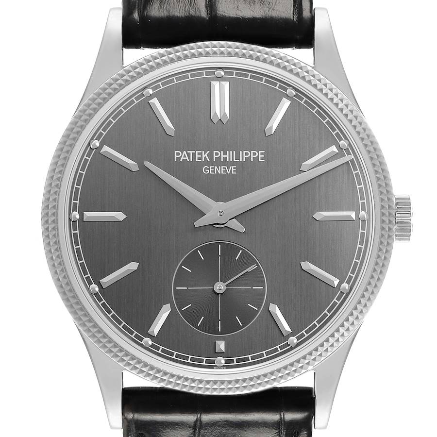 Patek Philippe Calatrava White Gold Grey Dial Mens Watch 6119G Papers. Manual winding movement. 18k white gold round case 39.0 mm in diameter. Transparent exhibition sapphire crystal case back. Patek Philippe logo on the crown. 18k white gold hobnail bezel. Scratch resistant sapphire crystal. Charcoal gray dial with vertical satin finish with raised white gold index hour markers. Small seconds subdial at 6 o'clock. Black leather strap with Patek Philippe 18K white gold tang buckle.