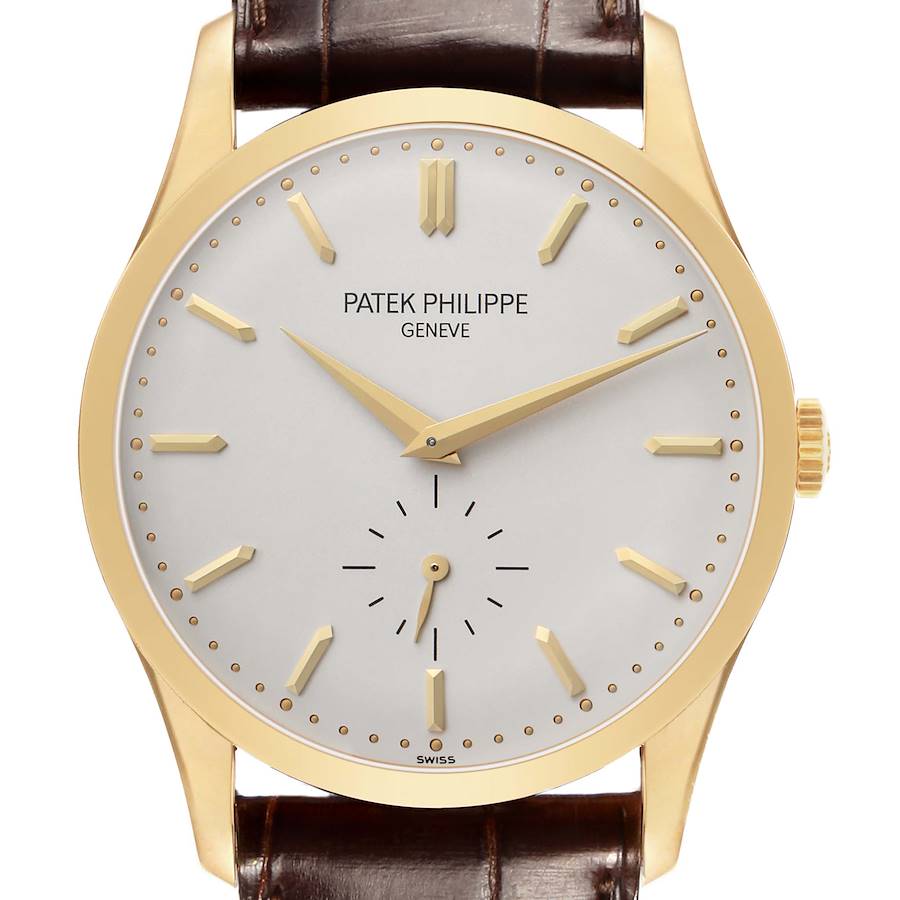 Patek Philippe Calatrava Yellow Gold Silver Dial Mens Watch 5196 5196J. Manual-winding movement. Rhodium-plated, fausses cotes decoration, straight-line lever escapement, Gyromax balance adjusted to heat, cold, isochronism and 5 positions, shock absorber, self-compensating free-sprung flat balance spring. 18k yellow gold round case 37.0 mm in diameter. Snap-on case back, concave lugs. Patek Philippe logo on the 18k yellow gold crown. 18k yellow gold smooth bezel. Scratch resistant sapphire crystal. Silver opaline dial with raised faceted yellow gold index hour markers and yellow gold dauphine center hands. Pearled minute markers around outer rim. Small seconds subdial at 6 o'clock with a yellow gold feuille hand. Brown leather strap with an 18K yellow gold tang buckle.