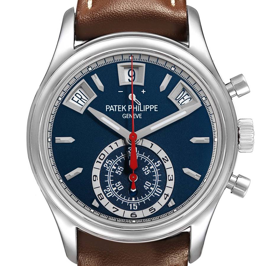 Patek Philippe Complications Annual Calendar Chronograph Watch 5960 Box Papers. Automatic self-winding movement, beats at 28,800 vph, composed out of 456 parts, contains 40 Jewels & has an approximate power reserve of 45-55 hours. White gold round case 40.5 mm in diameter. Transparent exhibition sapphire crystal case back. Two pushers operate the chronograph functions. Patek Philippe logo on the crown. White gold sloped bezel. Scratch resistant sapphire crystal. Blue dial with blackened white gold index hour markers and hands. Annual calendar complication displaying the date calendar at 12 o'clock. Weekday aperture at 10 o'clock. Month aperture at 2 o'clock. Subdial at the 6 o'clock position doubles as the 60-minute and 12-hour chronograph register. Leather strap with 18k white gold tang buckle