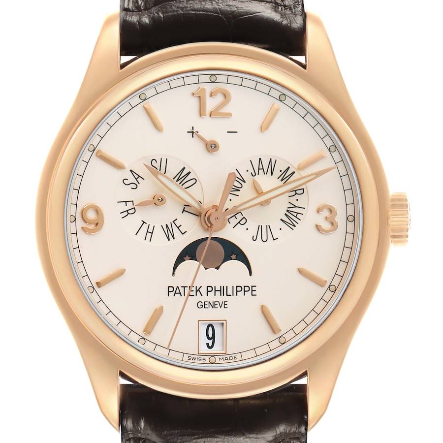 Patek Philippe Complications Annual Calendar Moon Phases Rose Gold 5146R 5146. Automatic self-winding mechanical movement. Day and month by hands. Date in an aperture. Sweep seconds hand. Annual calendar and moon phase functions. Composed of over 355 parts. 18K rose gold round case 39.0 mm in diameter. Transparent exhibition sapphire crystal case back. Patek Philippe logo on the 18k rose gold crown. . Scratch resistant sapphire crystal. Cream laquered dial with raised rose gold baton hour markers and Arabic numerals at 3, 9, and 12. Center sweep seconds hand. Annual calendar complication displaying the day, month, and date. Fan form sector for moon phases. Power reserve indicator at 12. Brown leather strap with rose gold deployant clasp.