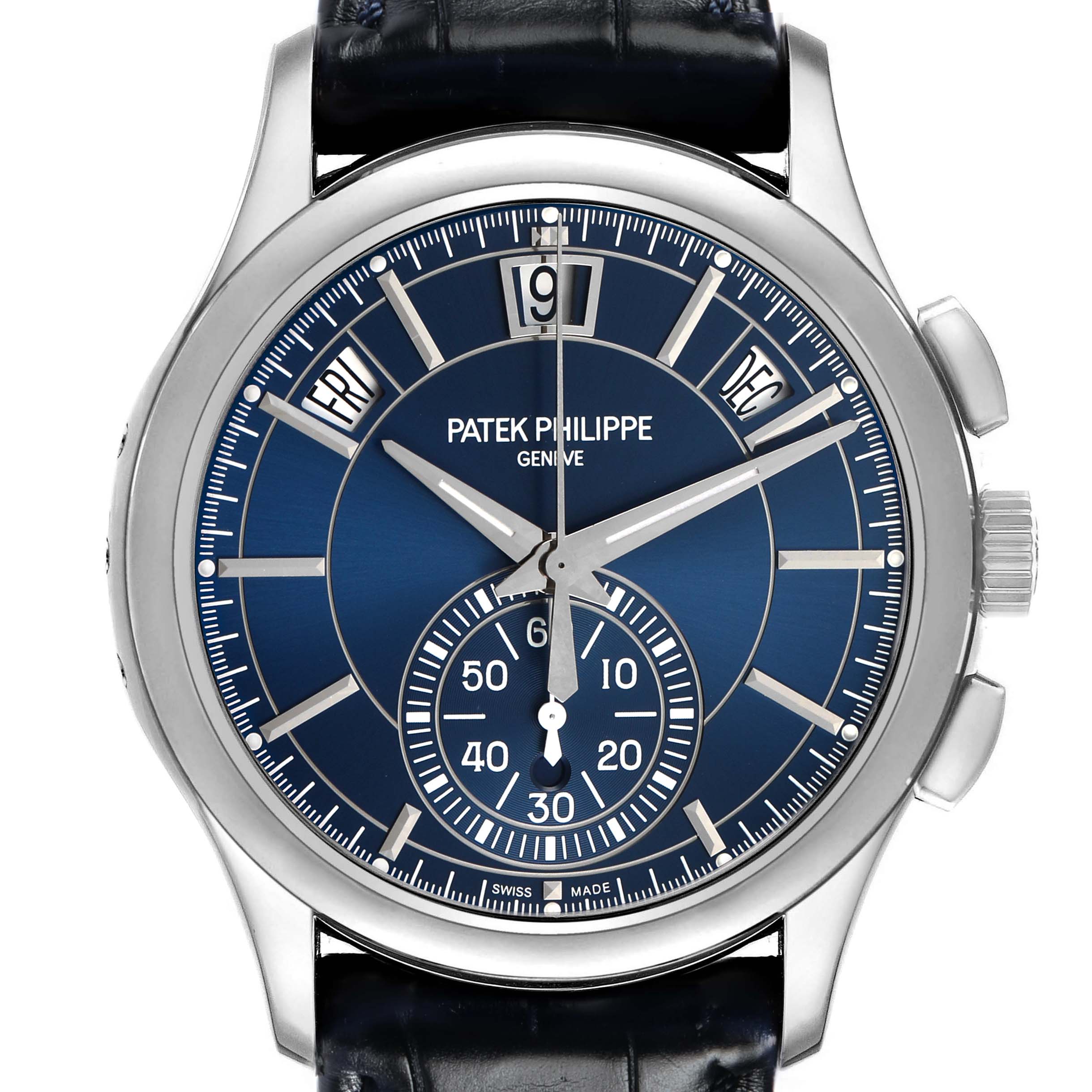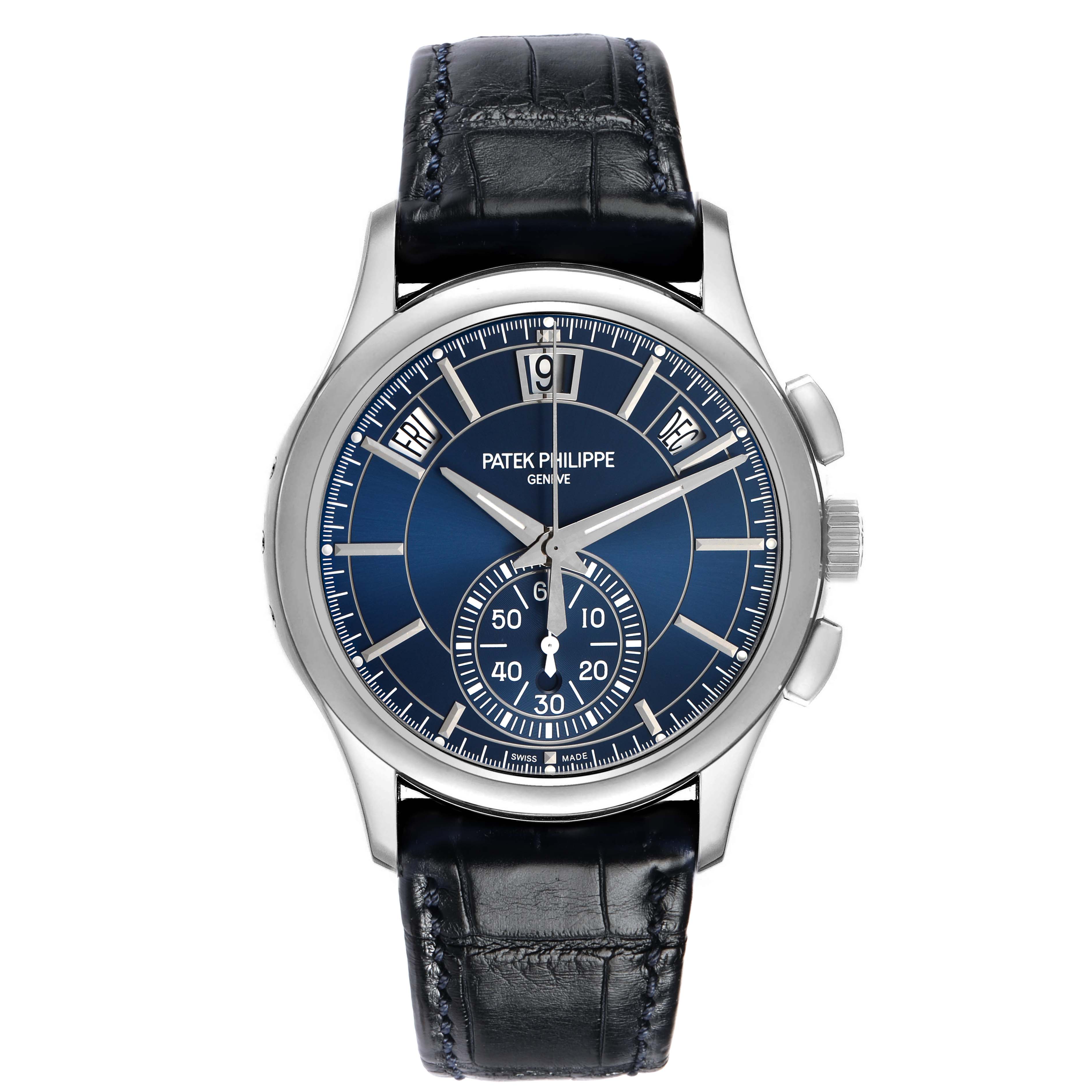 | Dial: | Blue dial with applied white gold baton hour markers. White gold epee hands. Annual calendar complication displaying the Day, Date & Month through windows located beneath the 10, 12 and 2 o'clock postions. Chronograph sub-dial at the 6 o'clock position. |