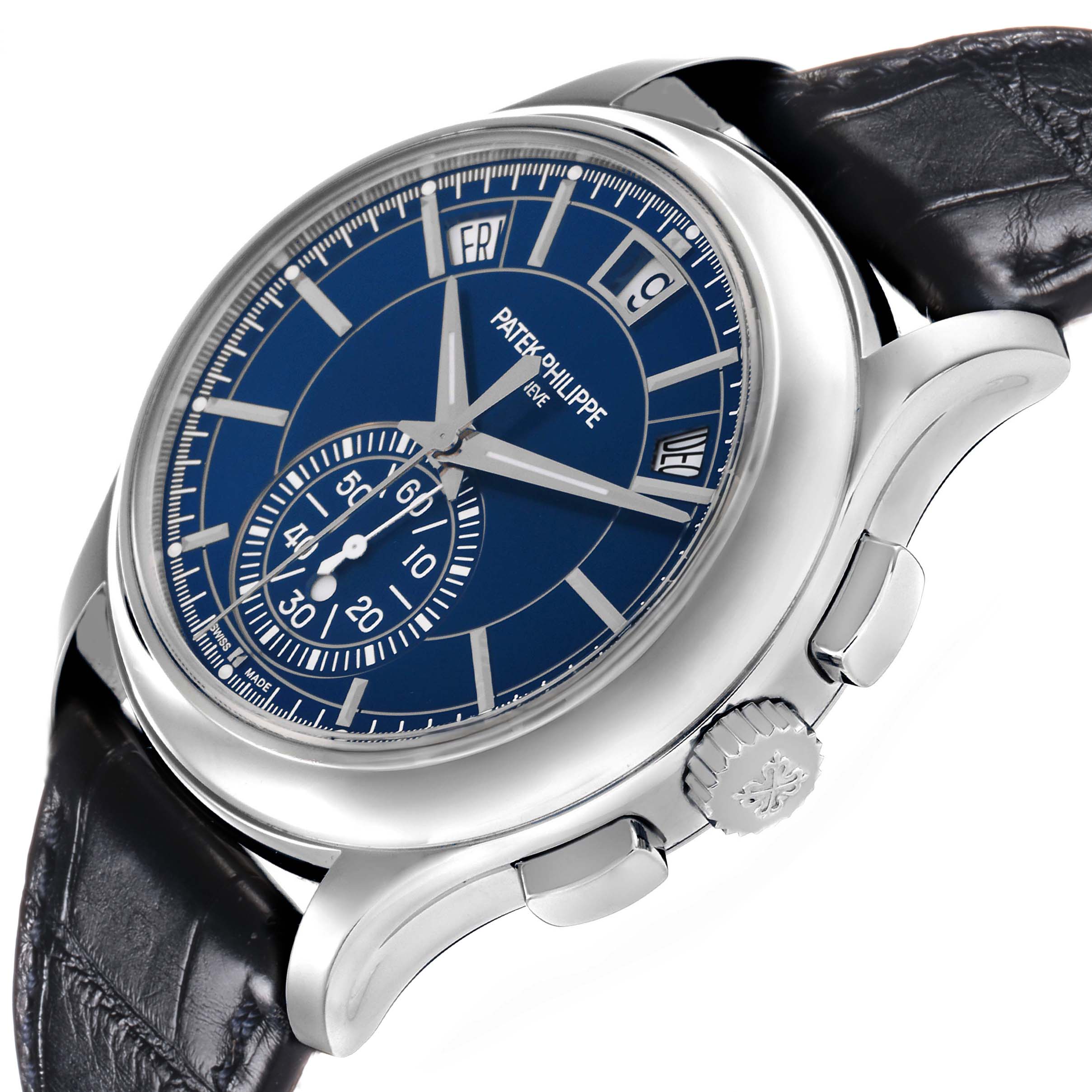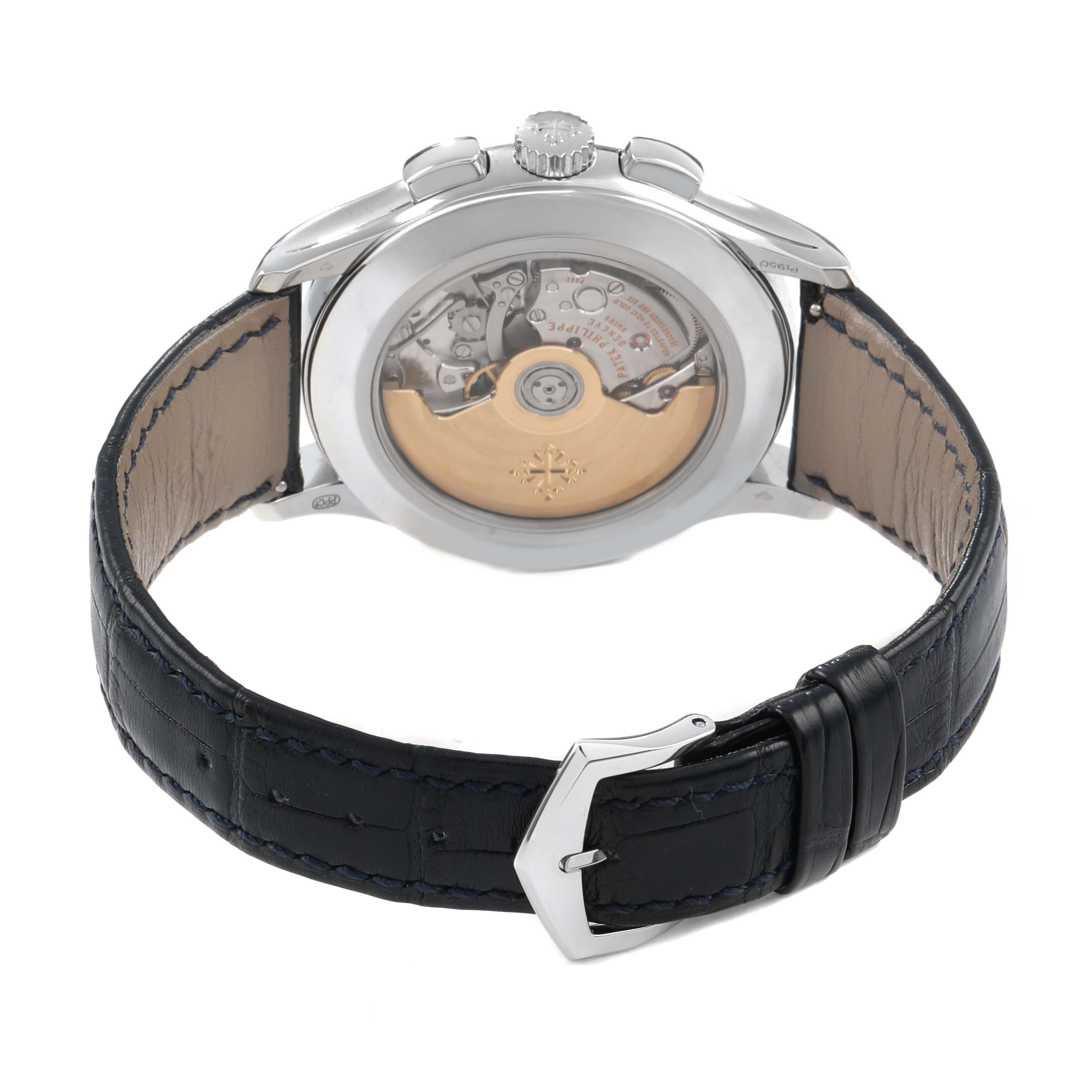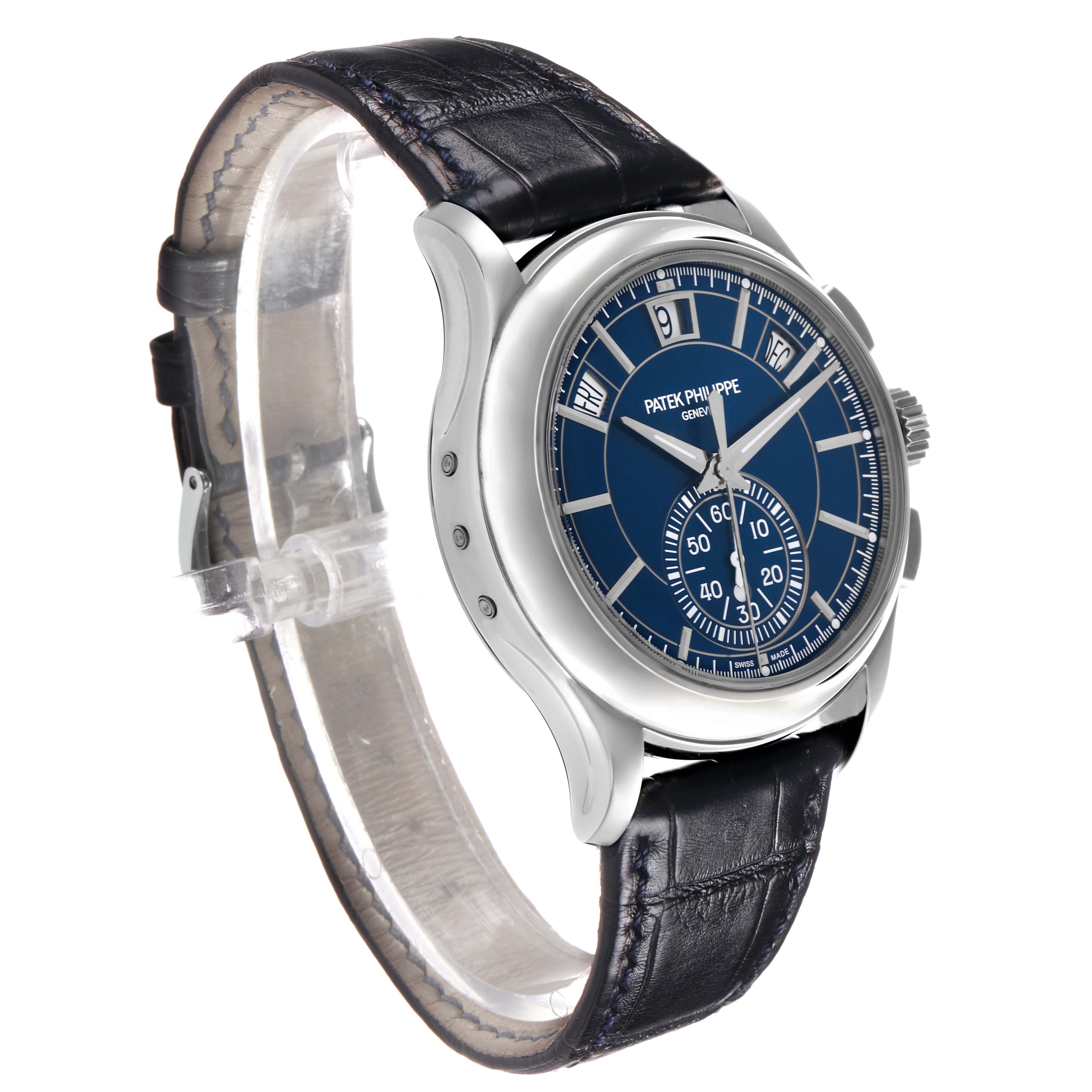 Patek Philippe Complications Annual Calendar Platinum Mens Watch 5905 Box Papers. Automatic self-winding flyback chronograph. Platinum case 42.0 mm in diameter. Diamond set at 6 o’clock. Exhibition sapphire crystal case back. Platinum bezel. Scratch resistant sapphire crystal. Blue dial with applied white gold baton hour markers. White gold epee hands. Annual calendar complication displaying the Day, Date & Month through windows located beneath the 10, 12 and 2 o'clock postions. Chronograph sub-dial at the 6 o'clock position. Blue leather strap with platinum tang buckle.