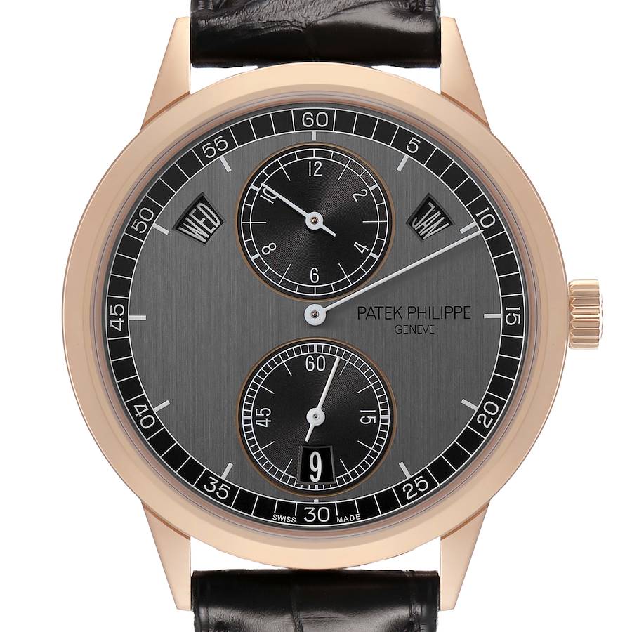 Patek Philippe Complications Annual Calendar Regulator Rose Gold Watch 5235. Automatic self-winding movement, with 22k gold off-center minirotor. 18k rose gold round case 40.5 mm in diameter. Transparent exhibition sapphire crystal caseback. Patek Philippe logo on the 18k rose gold crown. 18k rose gold bezel. Scratch resistant sapphire crystal. Two-tone graphite and ebony black, vertical satin-finish dial with printed white index hour markers and white baton hand. Annual calendar complication displaying the Day & Month through windows located beneath the 10 and 2 o'clock positions. 12-hour subdial located at 12 o'clock and a small seconds subdial at 6 o'clock with a date calendar window. White outer minute marker track. Black leather strap with an 18K rose gold tang buckle.