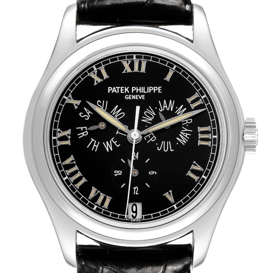 Patek Philippe Complications Annual Calendar White Gold Mens Watch 5035G. Automatic movement. Functions: annual calendar; date, day, month. Gyromax balance, shock absorber, self-compensating free-sprung flat balance spring, 21K gold rotor, Geneva stamp. 18k white gold case 37.0 mm in diameter. Transparrent exhibition sapphire crystal case back. . Scratch resistant sapphire crystal. Black dial with roman numerals. Center sweep seconds hand. Annual Calendar complication displaying the Day, Month, Date. Black leather strap with 18k white gold tang buckle.