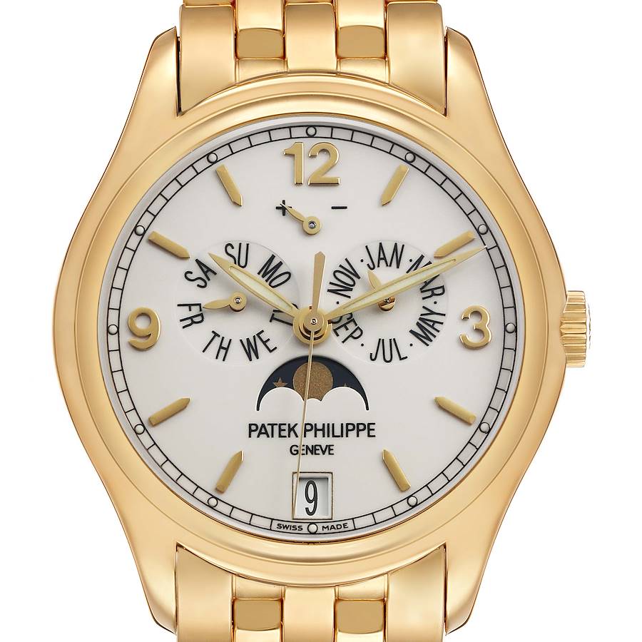 Patek Philippe Complications Annual Calendar Yellow Gold Watch 5146J Box Papers. Automatic self-winding mechanical movement. 18K yellow gold round case 39.0 mm in diameter. Transparent exhibition sapphire crystal caseback. Patek Philippe logo on the 18k yellow gold crown. . Scratch resistant sapphire crystal. Cream lacquered dial with applied yellow gold baton hour markers and raised Arabic numerals at 3, 9, and 12 o'clock. Luminescent 18k yellow gold-outlined leaf-shaped hands and a center sweeping seconds hand. Weekday subdial at 10 o'clock. Month subdial at 2 o'clock. Moonphase cutout and date calendar window at 6 o'clock. Power reserve indicator at 12 o'clock. Outer minute track. Cream lacquered dial with applied yellow gold baton hour markers and raised Arabic numerals at 3, 9, and 12 o'clock. Luminescent 18k yellow gold-outlined leaf-shaped hands and a center sweeping seconds hand. Weekday subdial at 10 o'clock. Month subdial at 2 o'clock. Moonphase cutout and date calendar window at 6 o'clock. Power reserve indicator at 12 o'clock. Outer minute track.