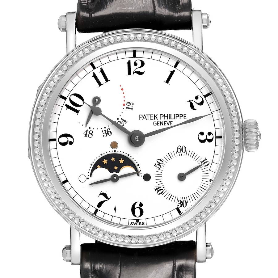 Patek Philippe Complications Moonphase White Gold Mens Watch 5015g 5015. Automatic self-winding movement. 18k white gold case 35 mm in diameter. Hinged case back with sapphire display underneath. 18k white gold hobnail bezel. Scratch resistant sapphire crystal. White porcelain dial with painted black Arabic numerals. Black spade leaf hands. Small seconds subdial at 4 o'clock. Moonphase complication at 8 o'clock. Power reserve between 10 and 11 o'clock. Black leather strap with 18k white gold tang buckle.
