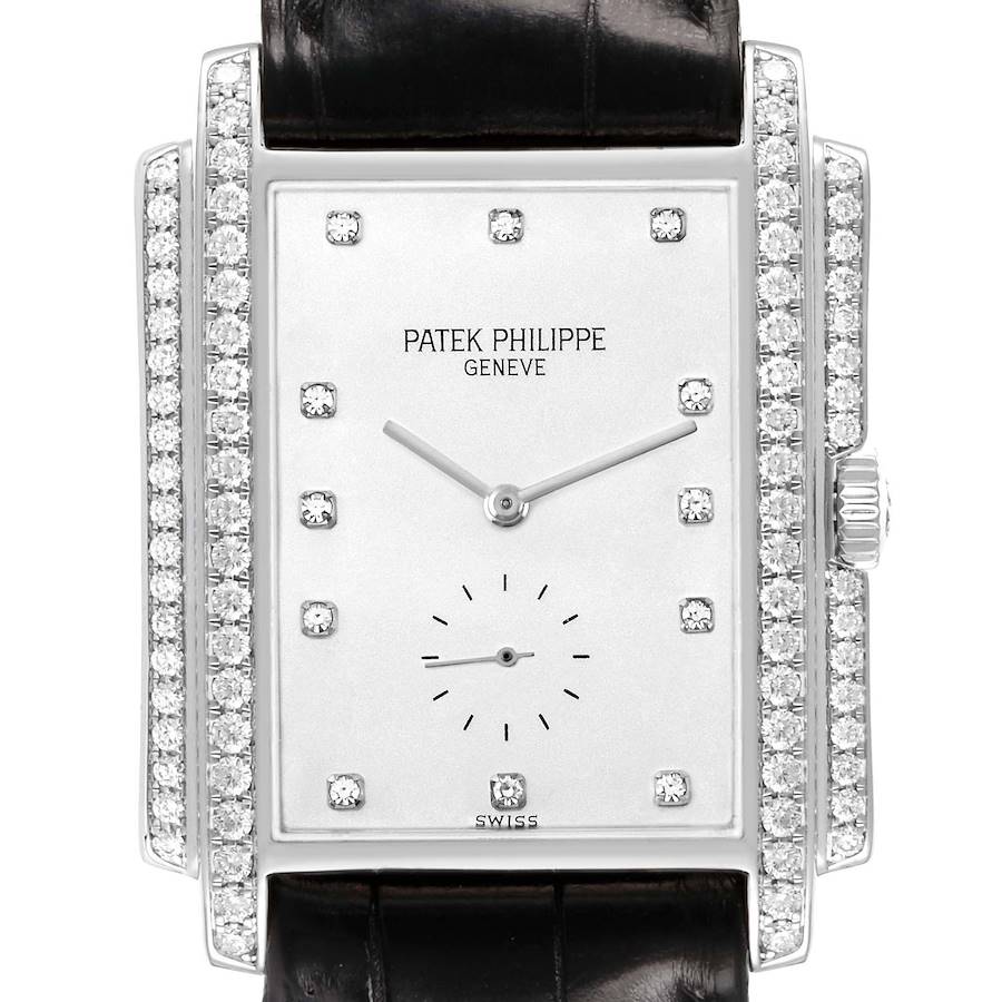 Patek Philippe Gondolo 18k White Gold Diamond Mens Watch 5025. Manual winding movement. 18k white gold rectangular case 30.0 x 37.5 mm case. Diamond-set sides and lugs. 18K white gold stepped diamond bezel. Scratch resistant sapphire crystal. White dial with diamond hour markers and white gold baton hands. Black leather strap with 18k white gold tang buckle.