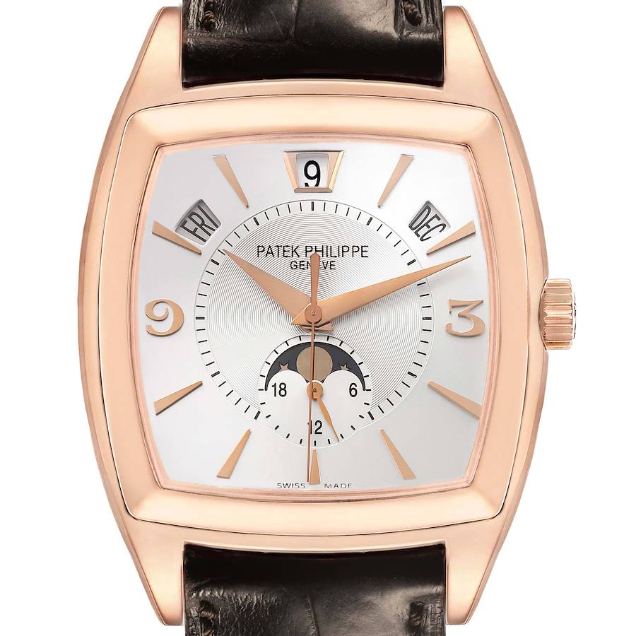 Patek Philippe Gondolo Annual Calendar Rose Gold Mens Watch 5135 5135R. Automatic self-winding movement. Functions: annual calendar; date, day, month; moon phases and a.m./p.m. 18K rose gold tonneau-shaped case 51.0 x 38.0 mm. Transparent exhibition sapphire crystal caseback. Patek Philippe logo on the 18k rose gold crown. . Scratch resistant sapphire crystal. Silver dial with raised rose gold index hour markers and Arabic numerals at 3 and 9 o'clock. Rose gold dauphine hands. Raised Arabic numerals at 3 and 9 o'clock. Inner stick minute track. Center sweep seconds hand. Annual calendar complication displaying the weekday, month, date, and the moonphase. Black leather strap with an 18K rose gold tang buckle.