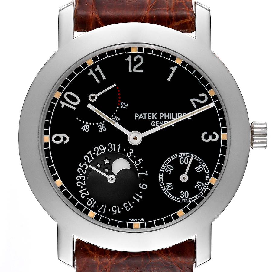 Patek Philippe Moonphase Power Reserve White Gold Watch 5055 Box Papers. Automatic self-winding movement. Self-compensating balance spring, solid gold rotor, 48-hour power reserve and engraved with the Geneva Seal. 18K white gold round case 36.0 mm in diameter. Screw-down transparent exhibition sapphire crystal case back. Quick set buttons at 5 and 8 o'clock. 18K white gold smooth bezel. Scratch resistant sapphire crystal. Black dial with white Arabic numeral hour markers. White gold baton hands with luminous inserts. White outer minute track with five minute markers. Subsidiary dial at 4 for running seconds, and 7 for and date. Fan form power reserve indicator at 10 o'clock. Brown leather strap with an 18k white gold deployant clasp.