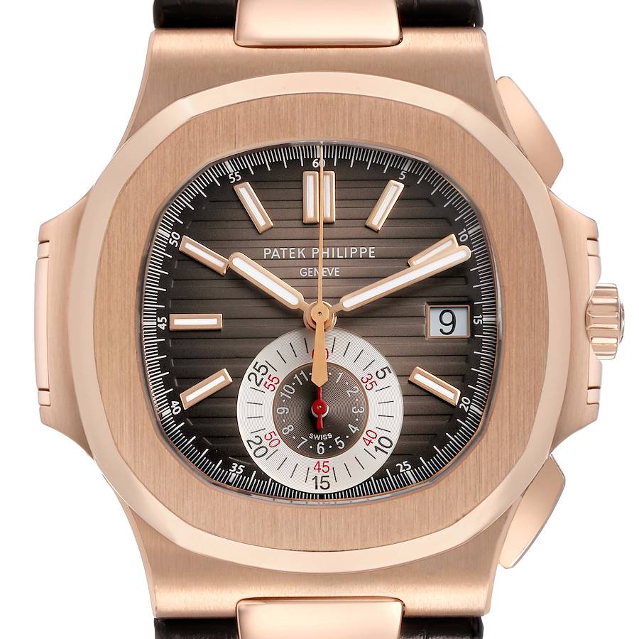 Patek Philippe Nautilus Chronograph Rose Gold Mens Watch 5980R 5980 Box Papers. Automatic self-winding chronograph movement. 18K rose gold cushion-shaped case 40.5 mm in diameter. Transparent exhibition sapphire crystal caseback. Two pushers operate the chronograph function. Patek Philippe emblem on the crown. 18K rose gold bezel. Scratch resistant sapphire crystal. Black-brown horizontal embossed dial with luminescent rose gold applied baton hour markers and hands. Rose gold sweeping seconds hand. Date calendar window at the 3 o'clock aperture. Subdial at 6 o'clock -- displaying small seconds, 60 minutes, and 12 hour counters. Outer minute marker track. Brown leather strap with 18K rose gold double push-button deployant buckle.