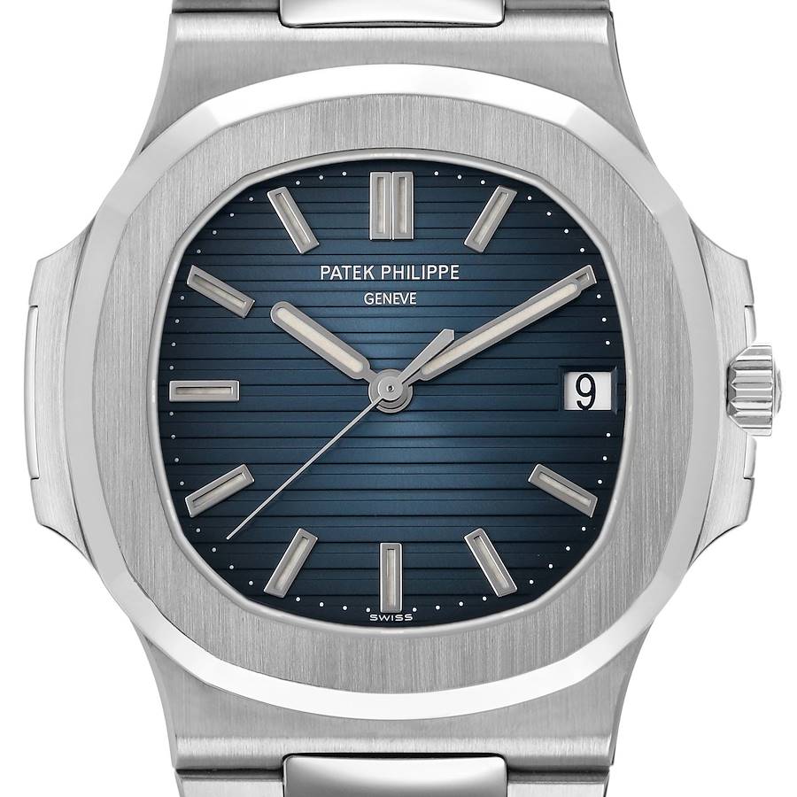 Patek Philippe Nautilus Steel Mens Watch 5711 5711A Box Papers. Automatic self-winding movement. Stainless steel cushion shape case 40 mm. Transparent Exhibition sapphire crystal case back. Stainless steel smooth bezel. Scratch resistant sapphire crystal. Gradient navy blue, horizontal embossed, dial with applied luminescent white gold baton hour markers and hands. Date calendar window at the 3 o'clock aperature. Outer dot minute markers. Stainless steel bracelet with a flip lock double deployant clasp. Fits a 7" wrist.