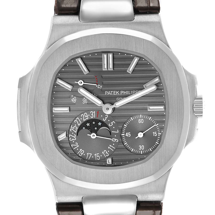 Patek Philippe Nautilus White Gold Moonphase Mens Watch 5712G Box Papers. Automatic self-winding movement. Ultra-thin Patek Philippe Caliber 240 PS IRM C LU beats at 21,600 vph, contains 29 jewels, composed of 265 parts with an approximate power reserve of 38 hours. 18k white gold cushion-shaped case 40.0 x 40.0 mm. Transparent exhibition sapphire crystal caseback. Patek Philippe logo on the crown. 18k white gold smooth bezel. Scratch resistant sapphire crystal. Slate grey dial with applied luminescent white gold baton hour markers and hands. Small seconds subdial at 4 o'clock. Moonphase and date indicator at 7 o'clock. Power reserve display located between 10 and 11 o'clock. Brown leather strap with an 18k white gold double push-button deployant clasp.