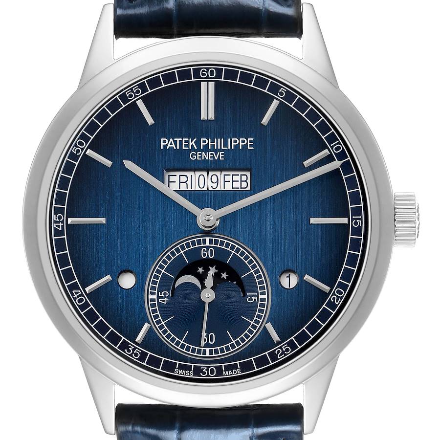 Patek Philippe Perpetual Calendar Platinum Blue Dial Watch 5236 Box Papers. Automatic self-winding movement with perpetual calendar and moonphase function. Platinum round case 41.3 mm in diameter. Transparent exhibition sapphire crystal caseback. Patek Philippe logo on the crown. Platinum smooth bezel. Scratch resistant sapphire crystal. Blue dial with white gold baton hour markers and hands. Perpetual calendar complication displaying the Day, Date, and Month through windows located beneath the 12 o'clock position. Sub-dial at the 6 o'clock position doubles as the Moonphase &small second hand. Blue leather strap with platinum deployant buckle.