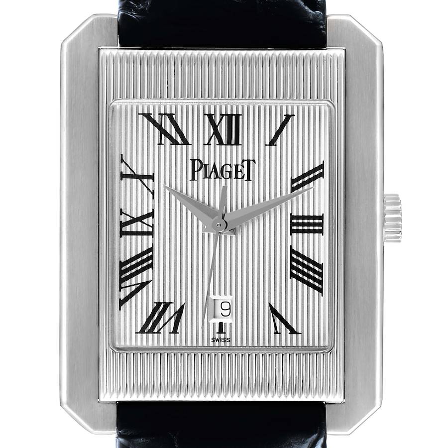 Piaget Protocole XL Silver Roman Dial White Gold Mens Watch 26100. Self-winding automatic movement. 18k white gold case 31.0 x 40.0mm. 18k whitegold bezel. Scratch resistant sapphire crystal. Silvered and guilloché textured finish with black Roman numerals. Date window at 6 o'clock. Black leather strap with 18k white gold tang buckle.