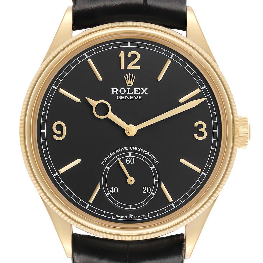 Rolex 1908 Yellow Gold Black Dial Mens Watch 52508 Unworn. Automatic self-winding movement. 18k yellow gold round case 39.0 mm in diameter. Rolex logo on the 18k yellow gold crown. Transparent exhibition sapphire crystal caseback. 18k yellow gold partly smooth, partly fluted divided bezel. Scratch resistant sapphire crystal. Intense black dial with raised index and Arabic numeral hour markers. Yellow gold baton and Breguet hands. An outer minute track. Running small seconds subdial at 6 o'clock. Black leather strap with an 18K yellow gold double deployant clasp.