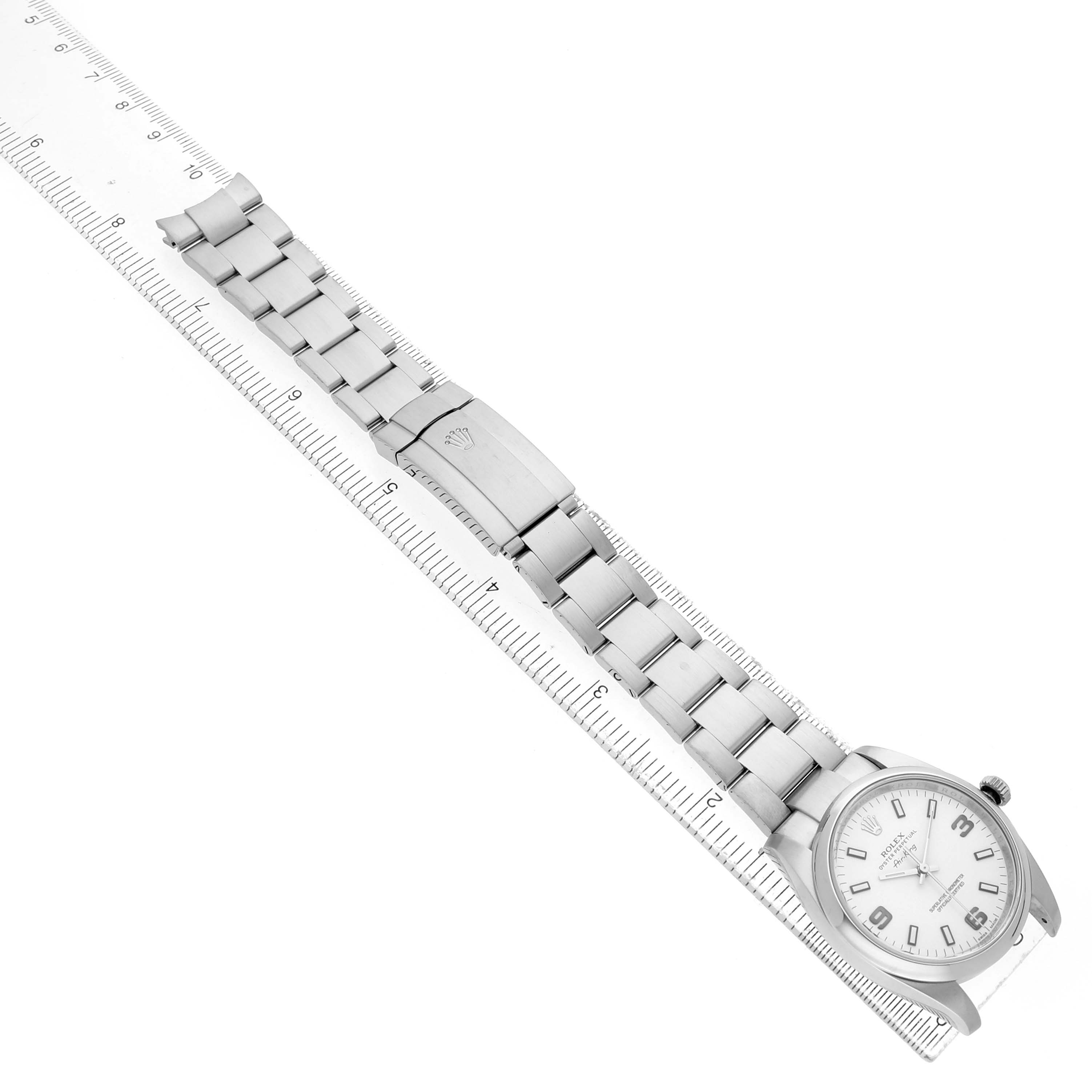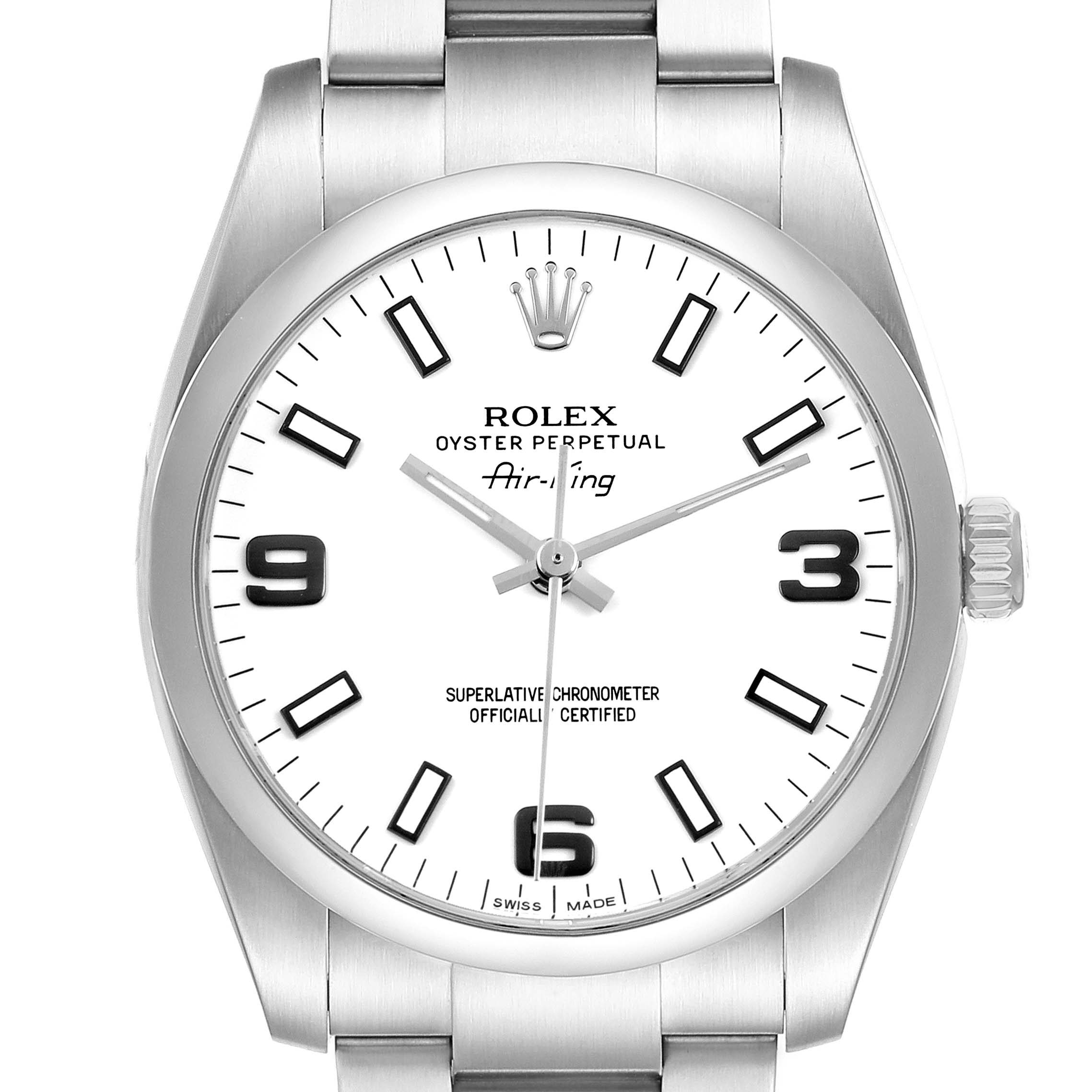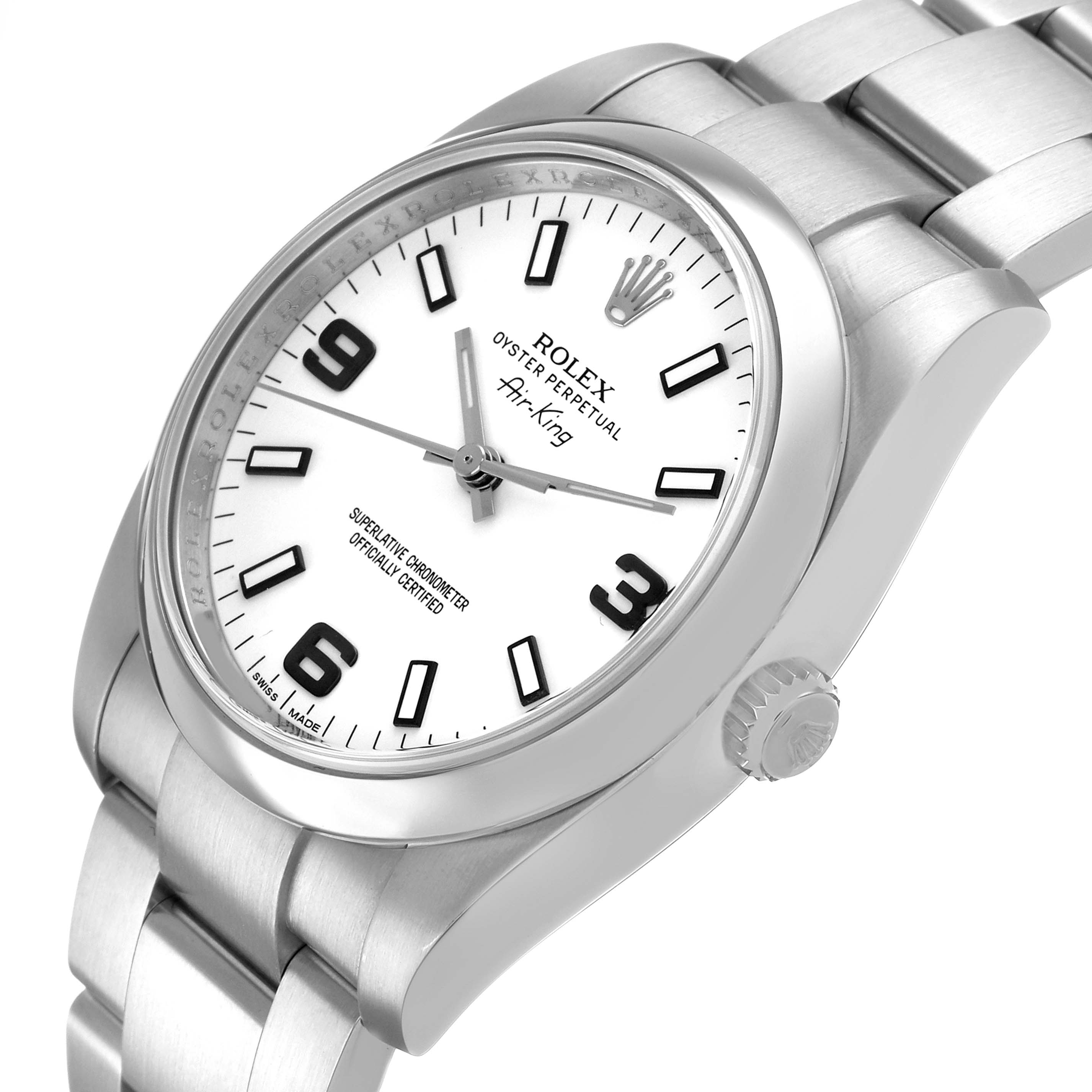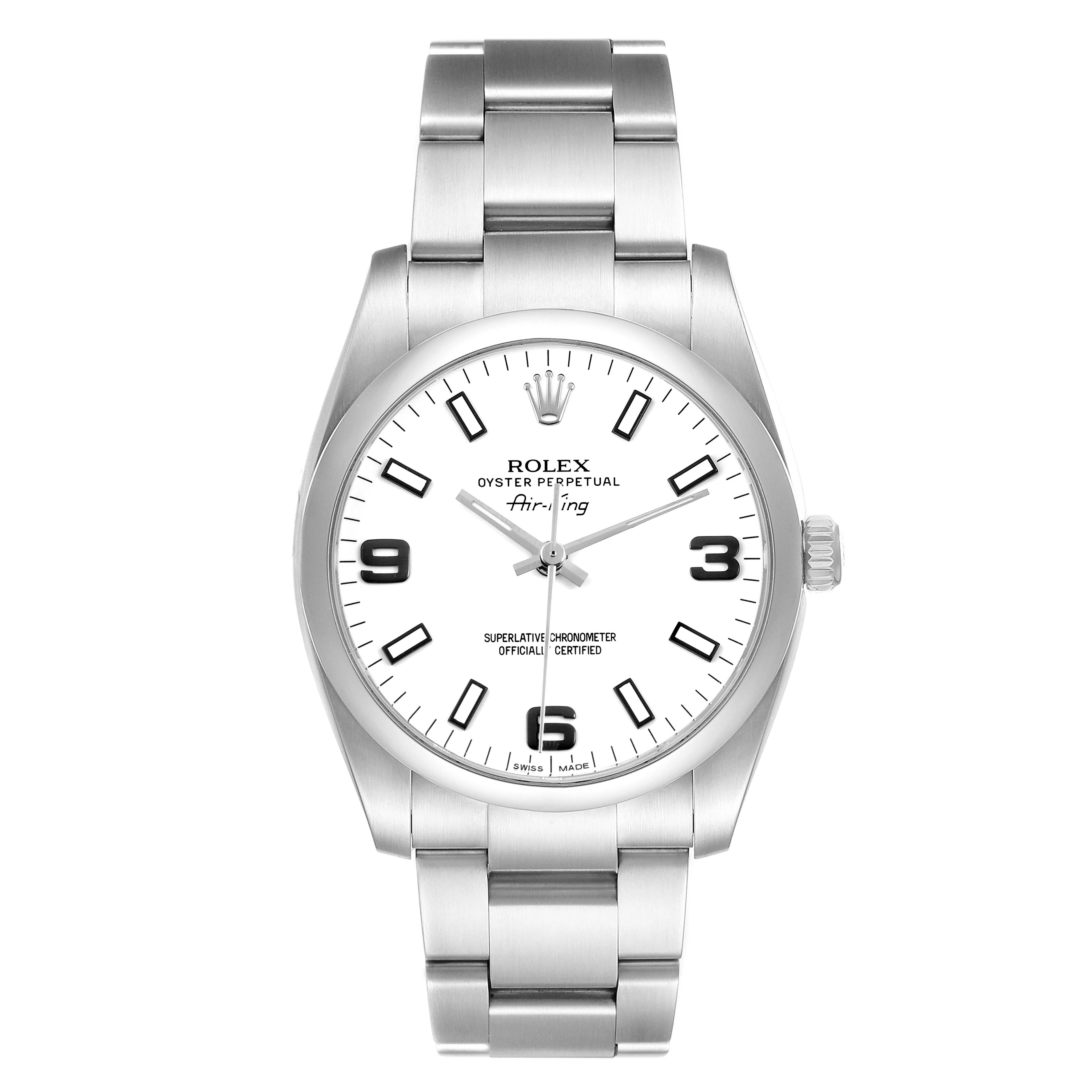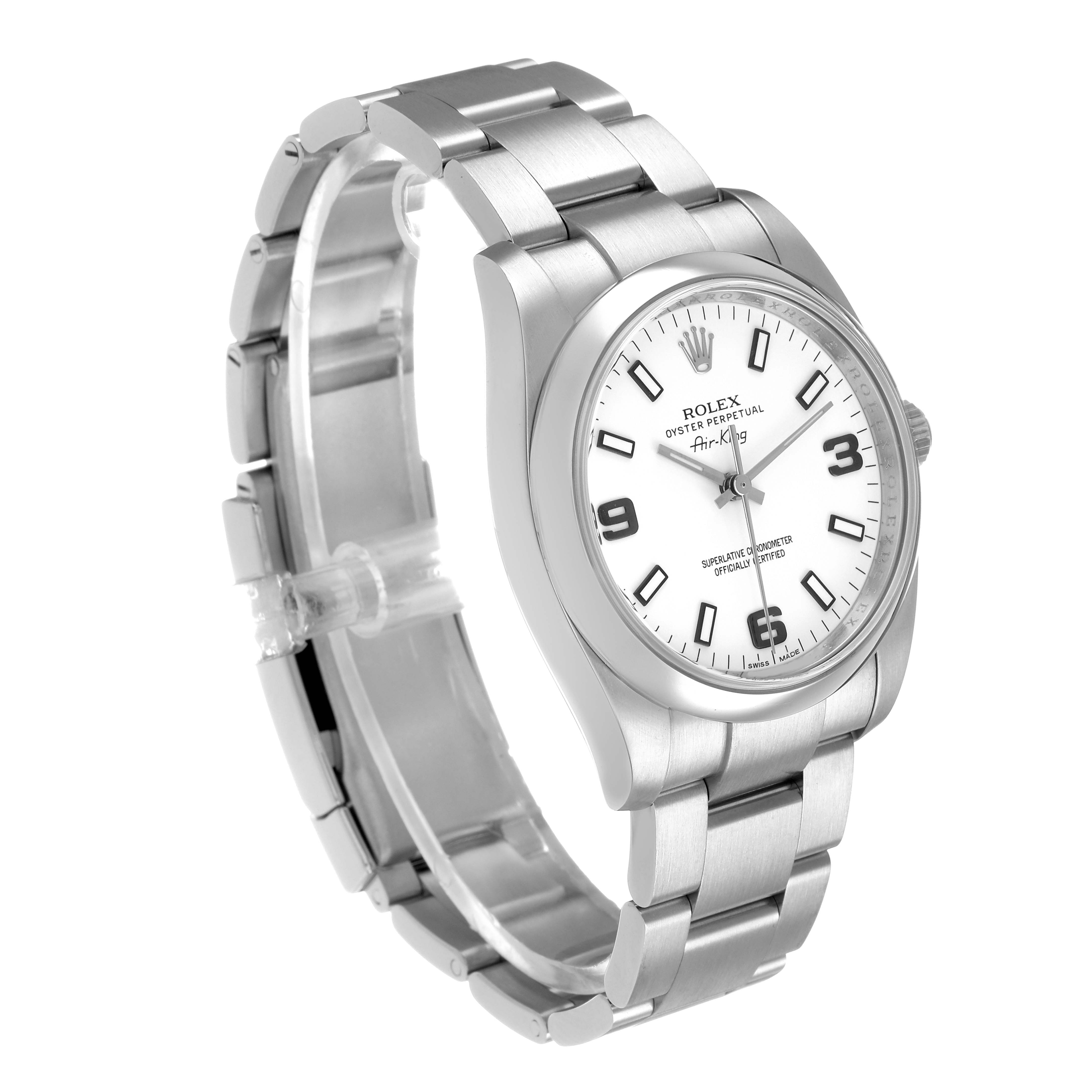 Rolex Air King 34 Steel White Dial Mens Watch 114200 Box Card. Officially certified chronometer self-winding movement. Stainless steel oyster case 34.0 mm in diameter. Rolex logo on the crown. Stainless steel smooth domed bezel. Scratch resistant sapphire crystal. White dial with luminescent baton hands and hour markers. Raised blackened Arabic numerals at 3, 6, and 9 o'clock. Stainles steel oyster bracelet with a fold-over clasp. Fits a 7 1/4" wrist.
