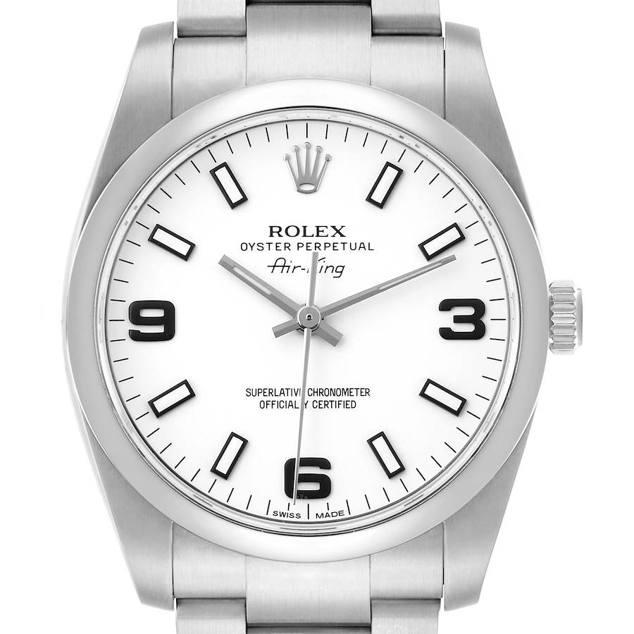 Rolex Air King 34mm White Dial Steel Mens Watch 114200 Card. Officially certified chronometer self-winding movement. Stainless steel oyster case 34.0 mm in diameter. Rolex logo on the crown. Stainless steel smooth domed bezel. Scratch resistant sapphire crystal. White dial with luminescent baton hands and hour markers. Raised blackened Arabic numerals at 3, 6, and 9 o'clock. Stainles steel oyster bracelet with a fold-over clasp. Fits up to a 7 1/4" wrist.