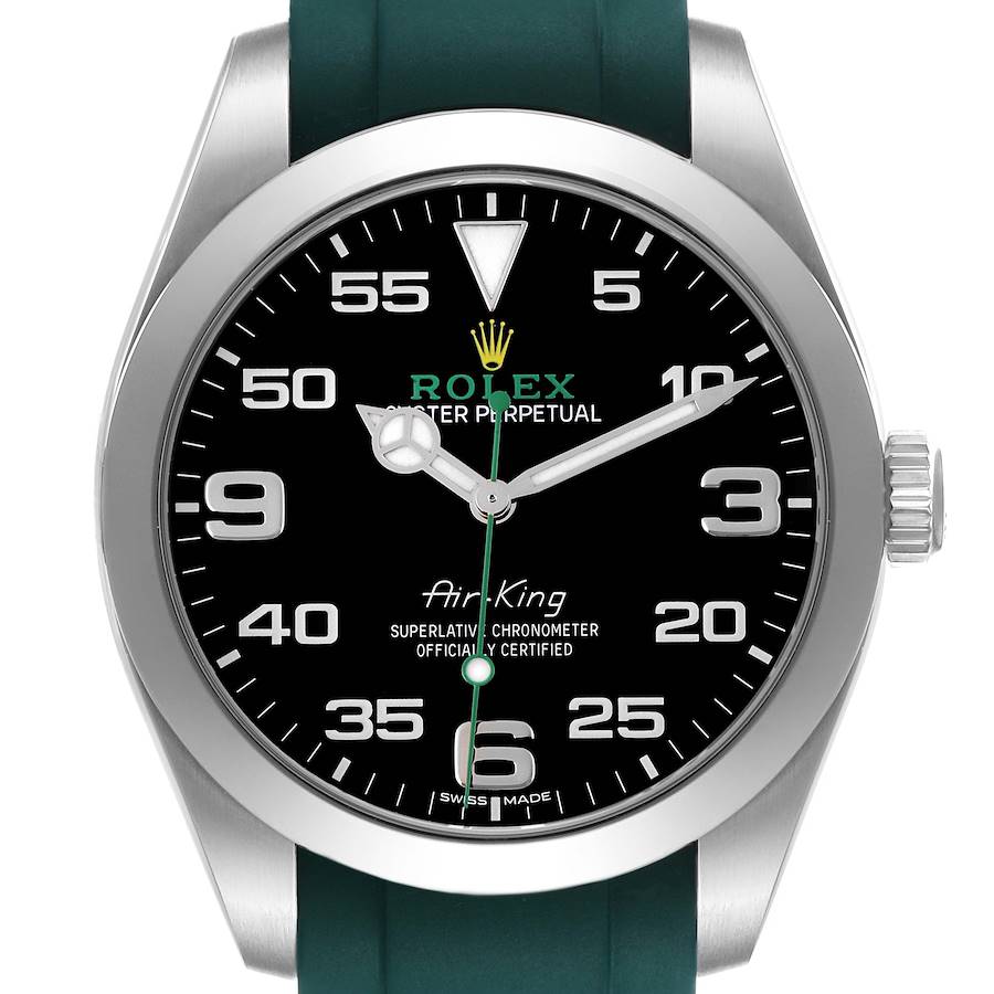 Rolex Air King 40 Green Hand Black Dial Steel Mens Watch 116900. Officially certified chronometer automatic self-winding movement. Stainless steel oyster case 40.0 mm in diameter. Rolex logo on the crown. Stainless steel smooth domed bezel. Scratch resistant sapphire crystal. Black dial with Arabic numerals at the five-minute marks and Mercedes hands. Raised Arabic numerals at 3, 6, and 9 o'clock. Yellow crown and green "Rolex" text. Green luminescent lollipop-tipped centre seconds hand. Outer stick minute markers. Custom green rubber strap.