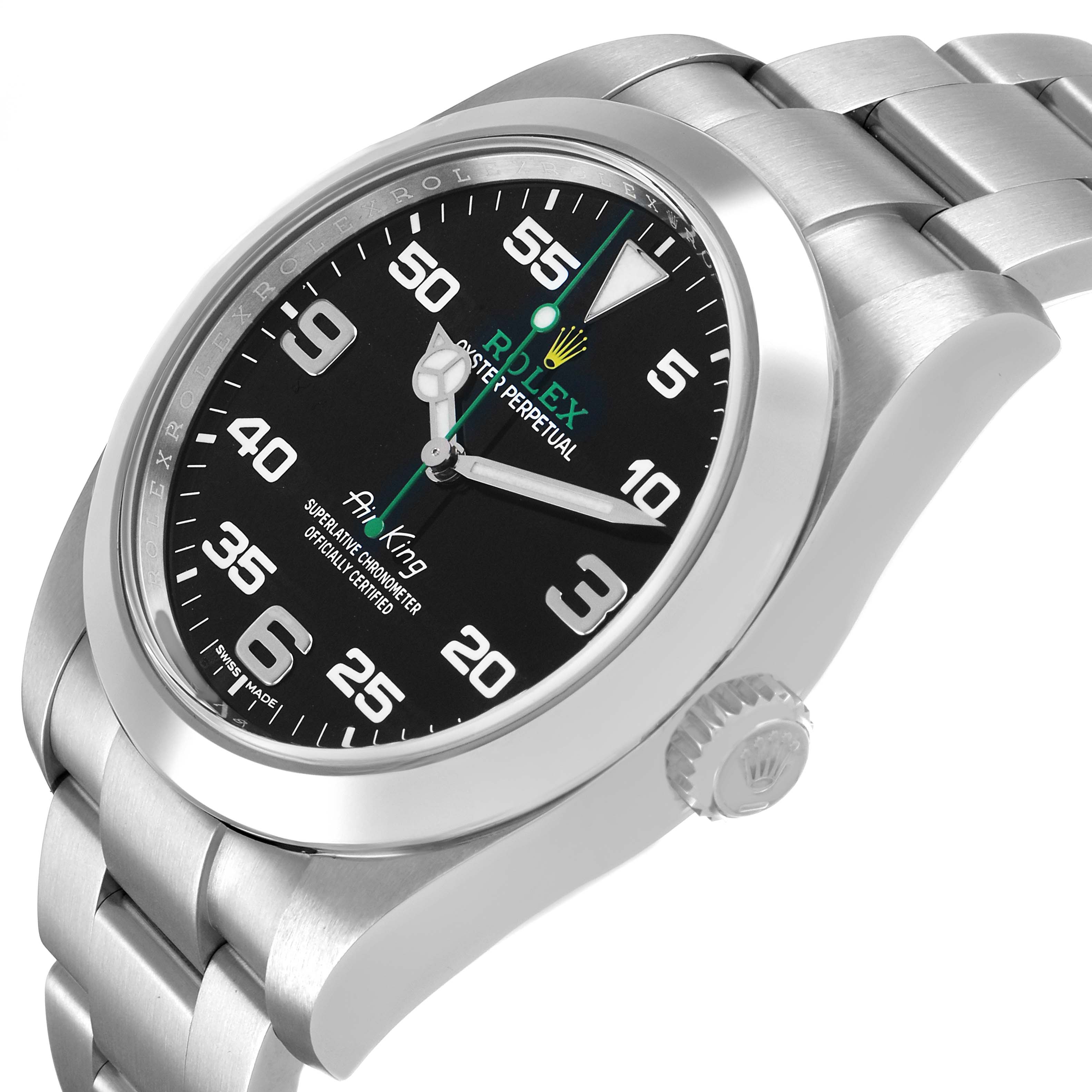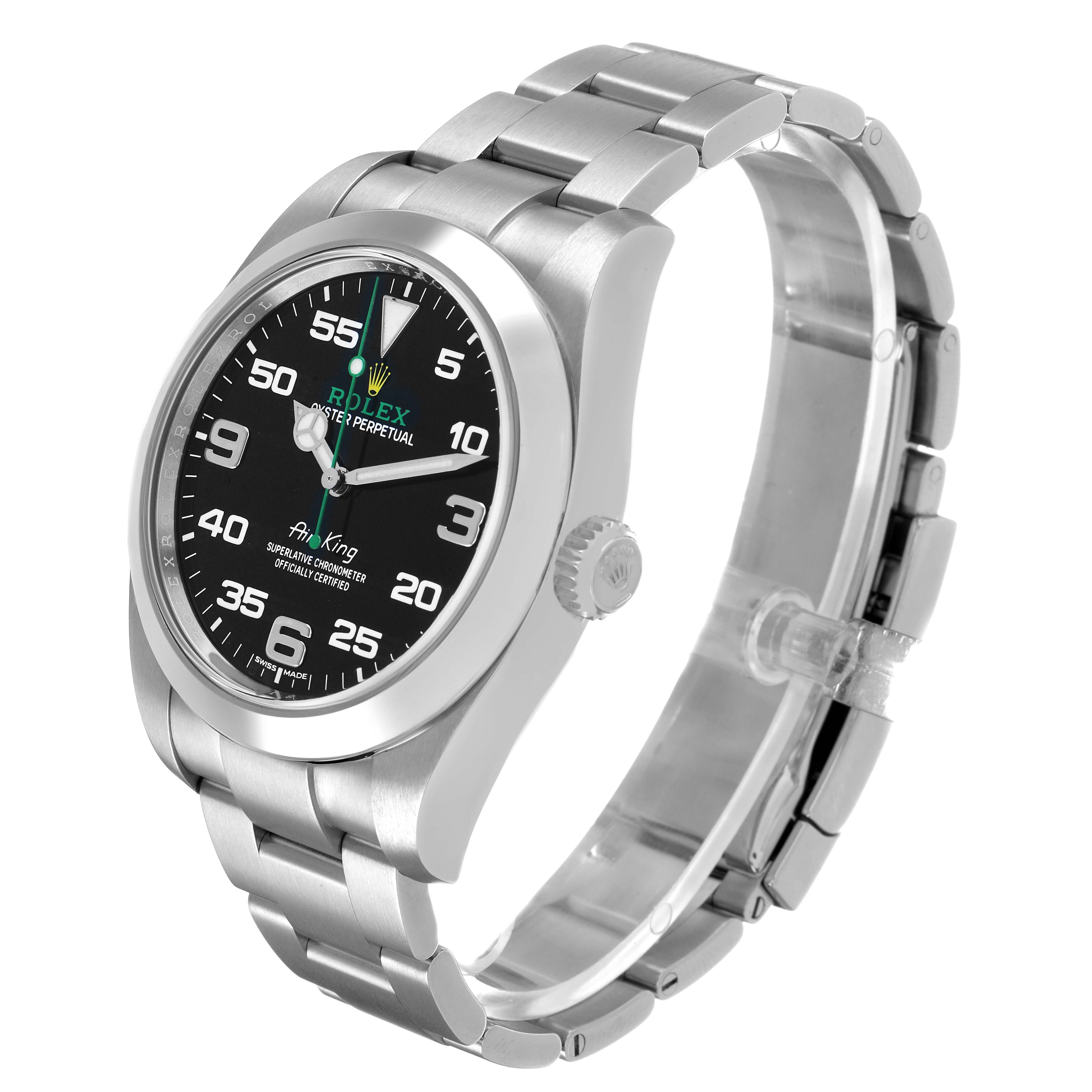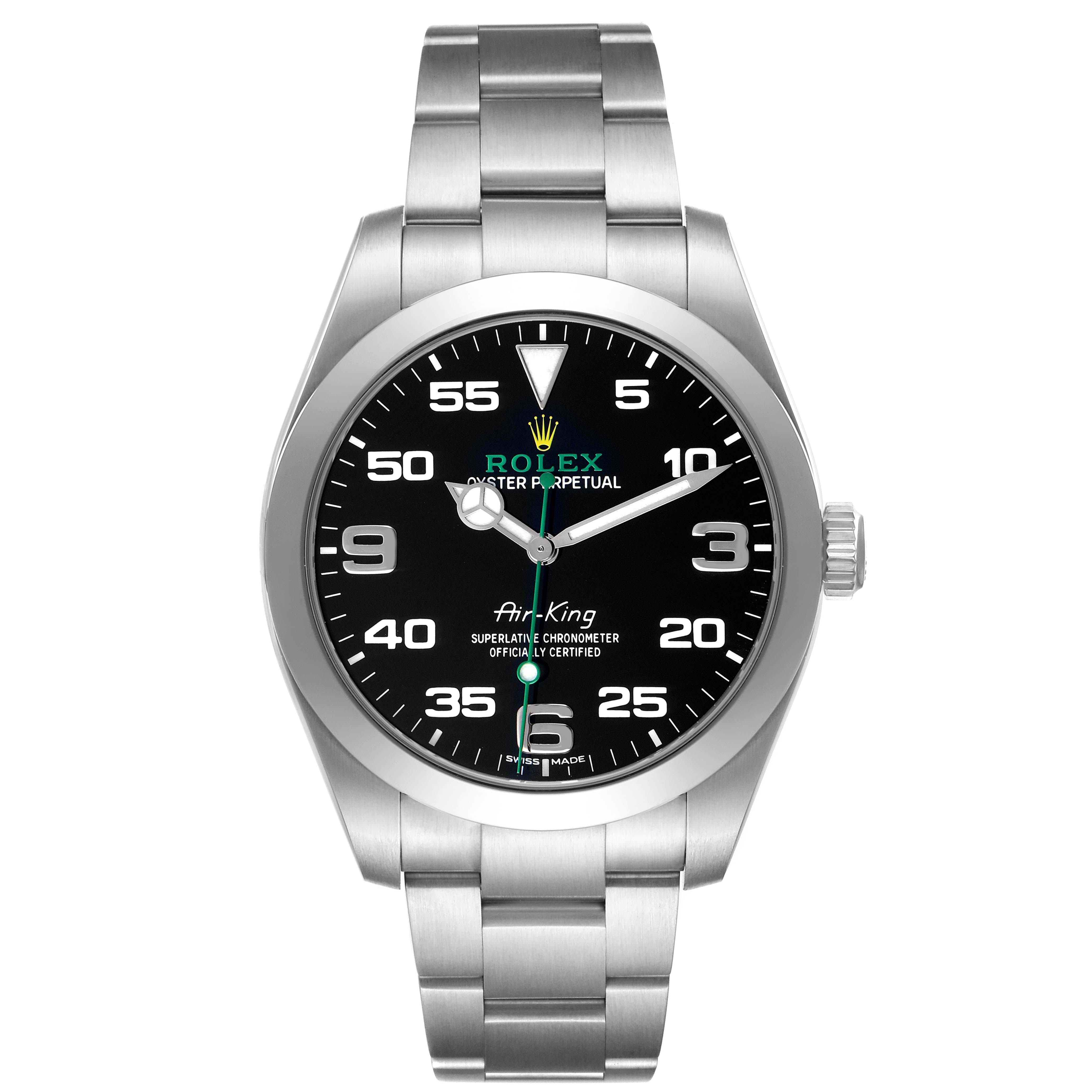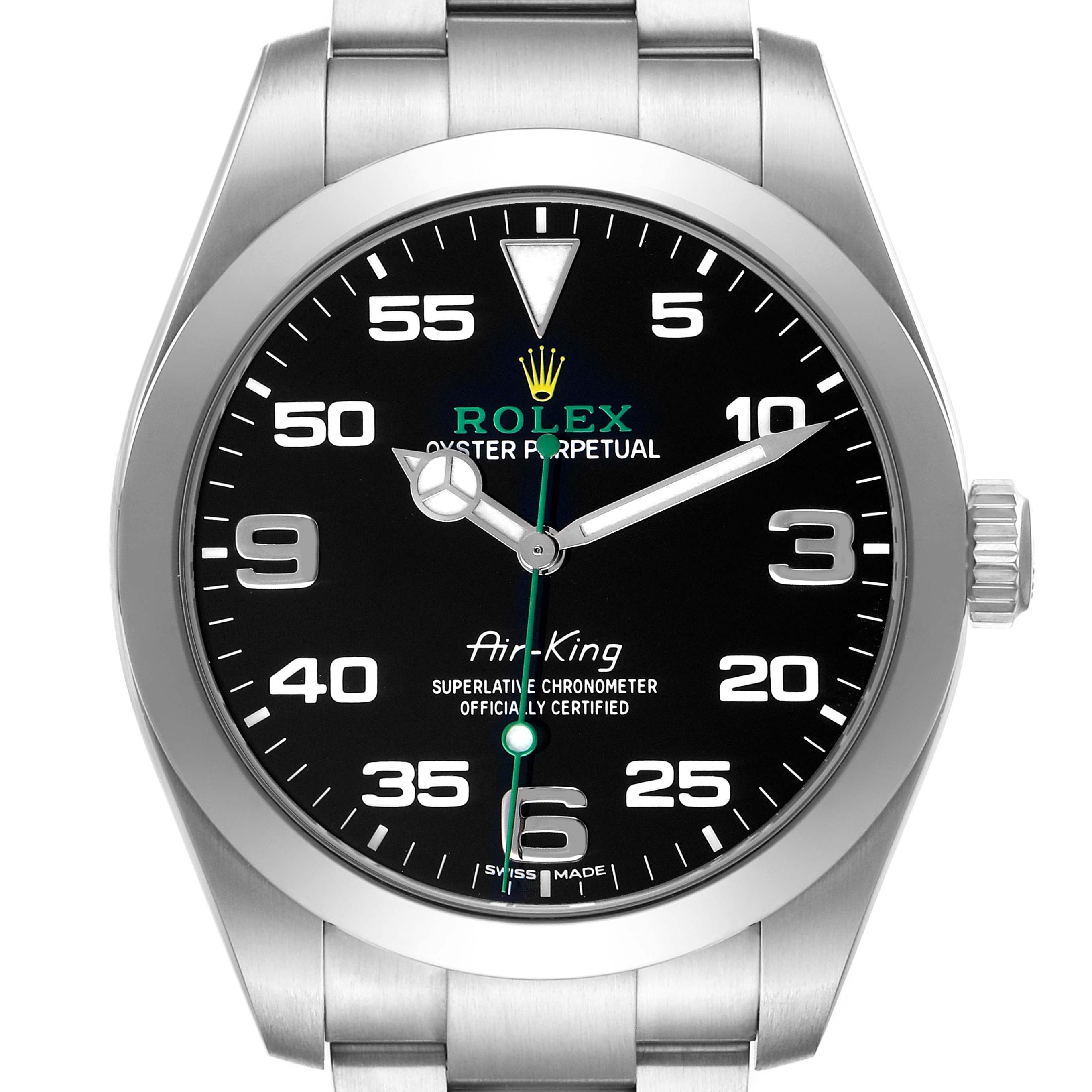 Rolex Air King Steel Green Hand Black Dial Mens Watch 116900 Box Card. Officially certified chronometer automatic self-winding movement. Stainless steel oyster case 40.0 mm in diameter. Rolex logo on the crown. Stainless steel smooth domed bezel. Scratch resistant sapphire crystal. Black dial with Arabic numerals at the five-minute marks and Mercedes hands. Raised Arabic numerals at 3, 6, and 9 o'clock. Yellow crown and green "Rolex" text. Green luminescent lollipop-tipped centre seconds hand. Outer stick minute markers. Stainless steel oyster bracelet with an oysterlock clasp. Fits a 7 1/2" wrist.