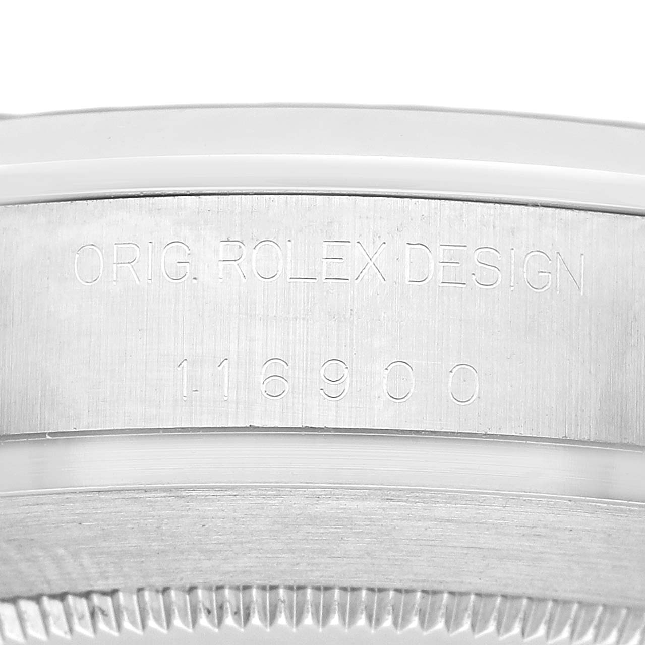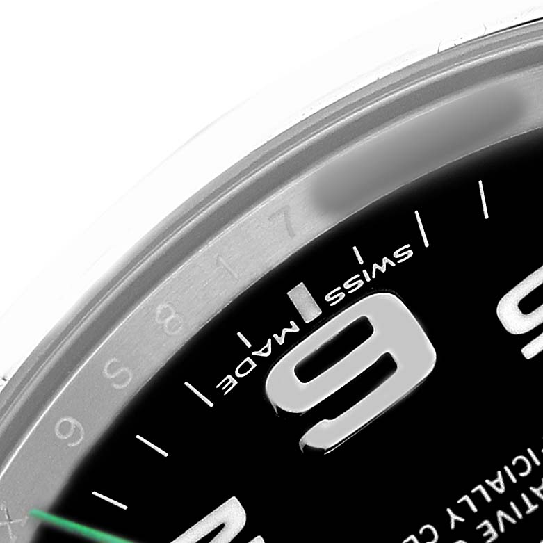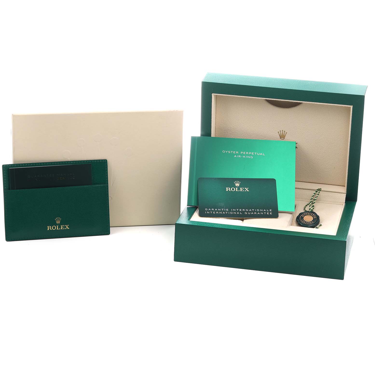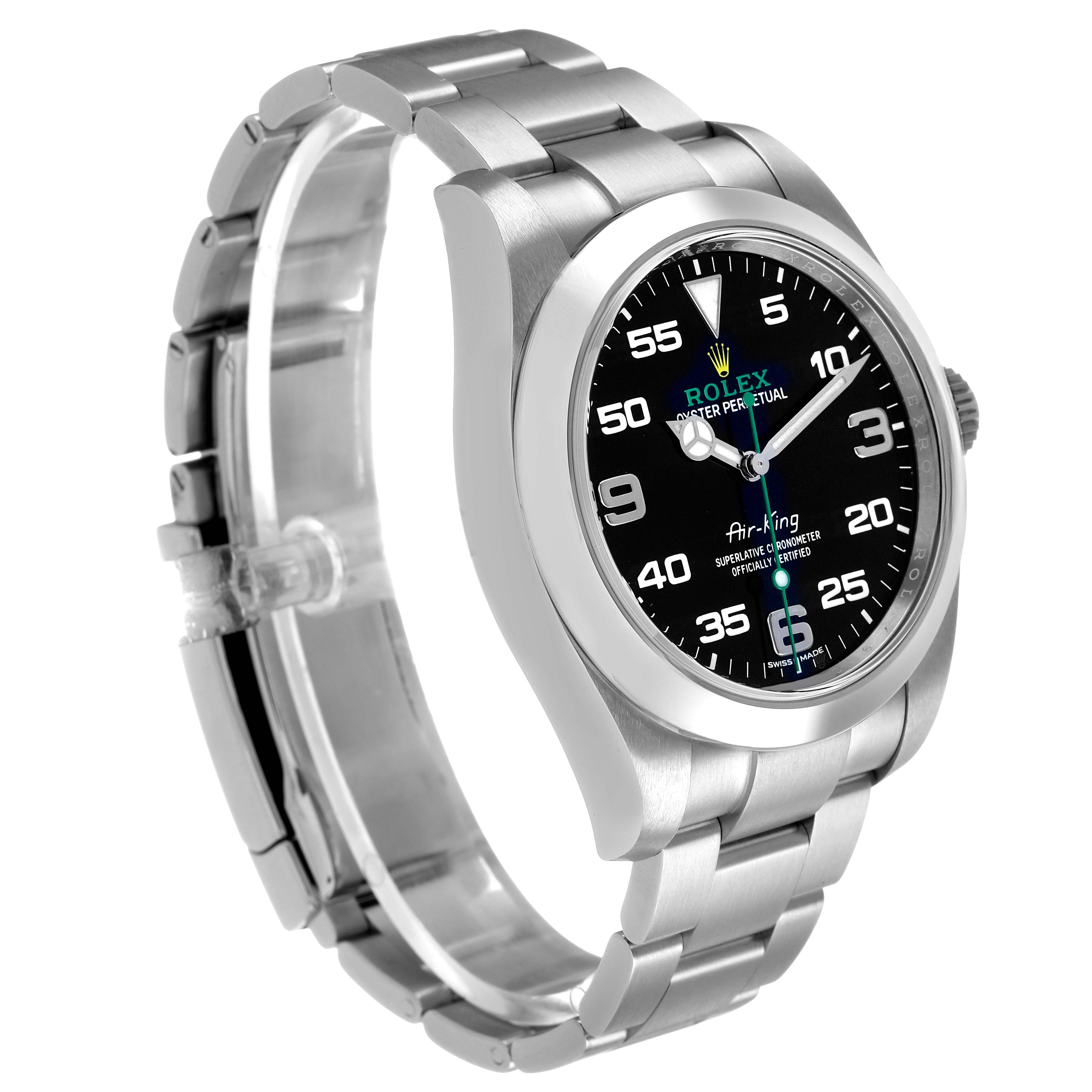 Rolex Air King Steel Green Hand Black Dial Mens Watch 116900 Box Card. Officially certified chronometer automatic self-winding movement. Stainless steel oyster case 40.0 mm in diameter. Rolex logo on the crown. Stainless steel smooth domed bezel. Scratch resistant sapphire crystal. Black dial with Arabic numerals at the five-minute marks and Mercedes hands. Raised Arabic numerals at 3, 6, and 9 o'clock. Yellow crown and green "Rolex" text. Green luminescent lollipop-tipped centre seconds hand. Outer stick minute markers. Stainless steel oyster bracelet with an oysterlock clasp. Fits a 7 1/2" wrist.