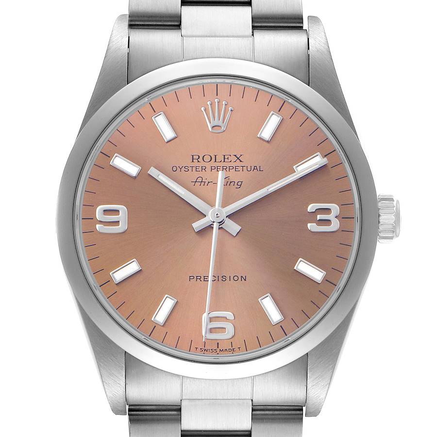 Rolex Air King Steel Salmon Dial Smooth Bezel Mens Watch 14000. Automatic self-winding movement. Stainless steel oyster case 34.0 mm in diameter. Rolex logo on the crown. Stainless steel smooth bezel. Scratch resistant sapphire crystal. Salmon dial with luminescent baton hour markers and hands. Raised Arabic numerals at 3, 6, and 9 o'clock. Stainless steel oyster bracelet with a fold-over clasp. Fits a 7 1/4" wrist.
