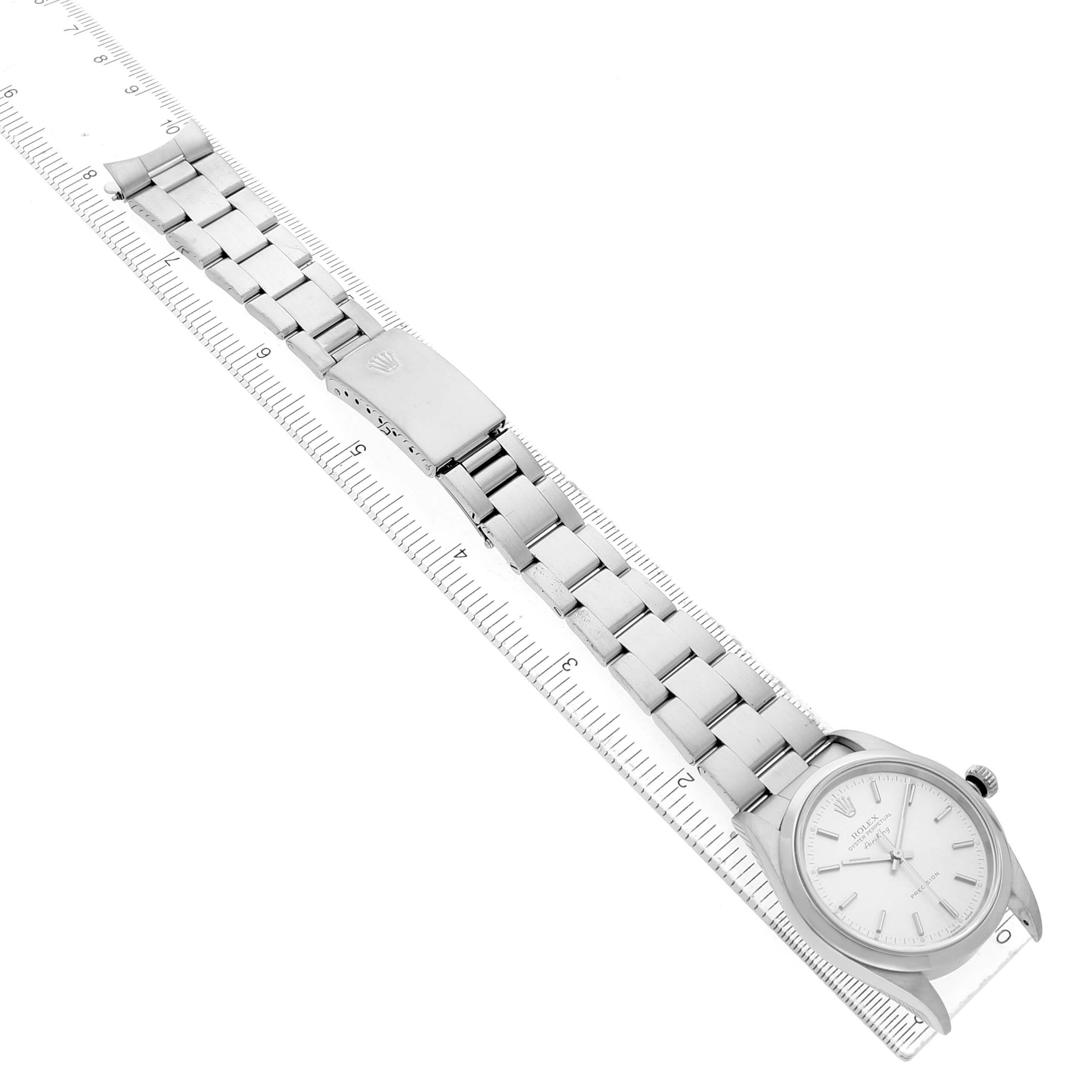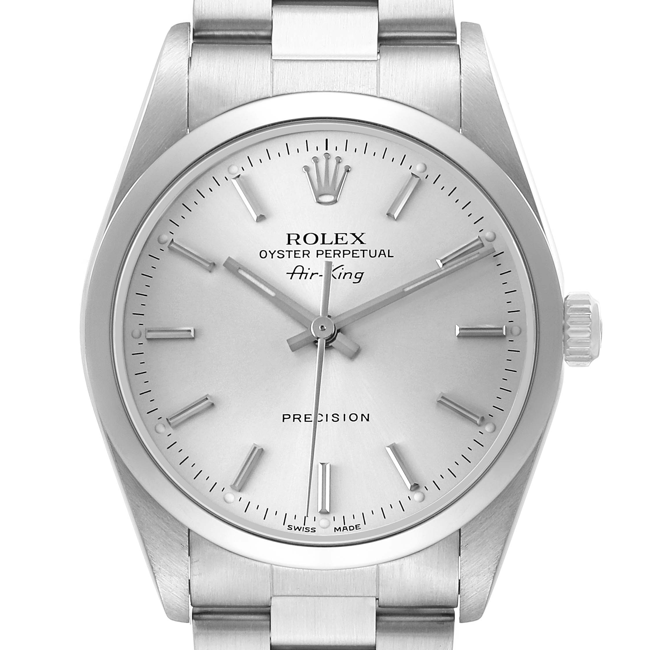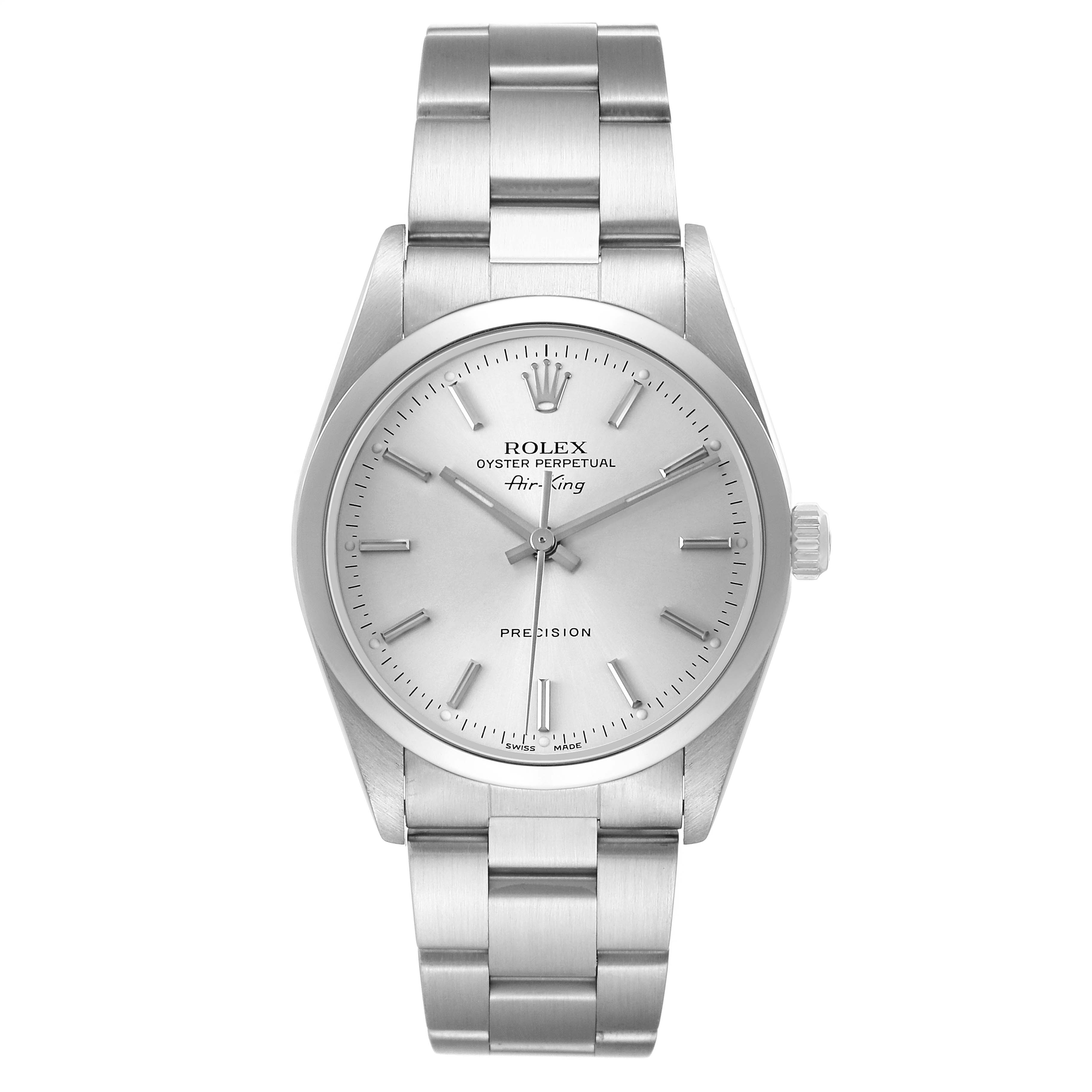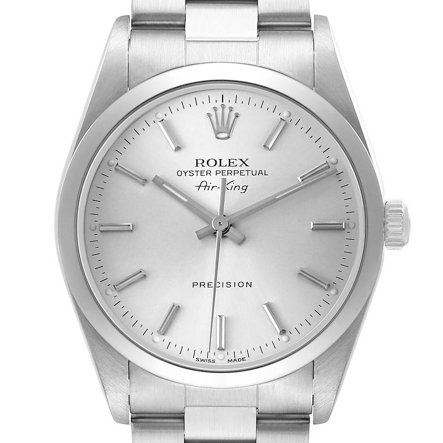 Rolex Air King Steel Silver Dial Smooth Bezel Mens Watch 14000. Automatic self-winding movement. Stainless steel oyster case 34.0 mm in diameter. Rolex logo on the crown. Stainless steel smooth domed bezel. Scratch resistant sapphire crystal. Silver dial with luminescent baton hands and hour markers. Outer minute and 1/2-second markers. Stainless steel oyster bracelet with a fold-over clasp. Fits a 7 1/2" wrist.