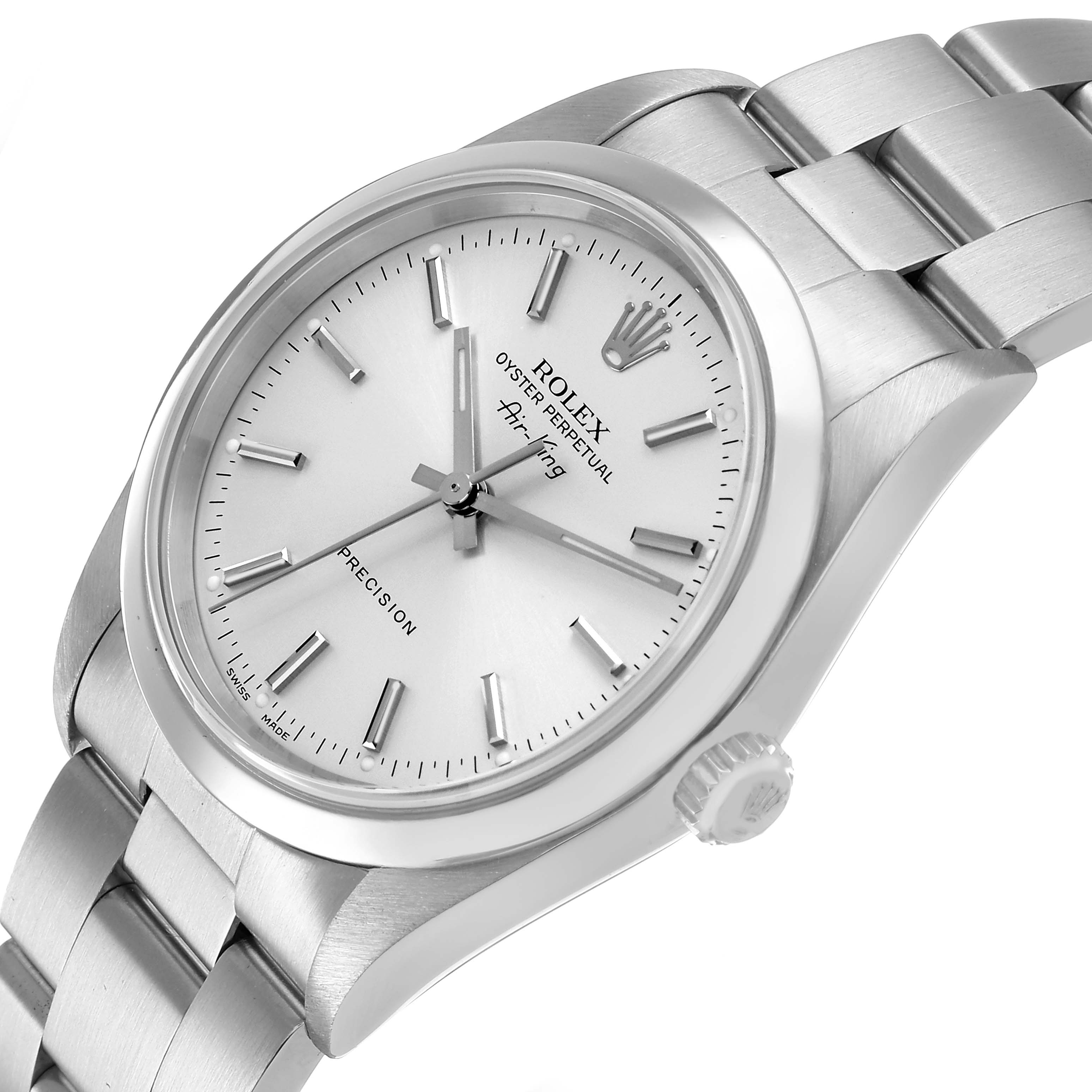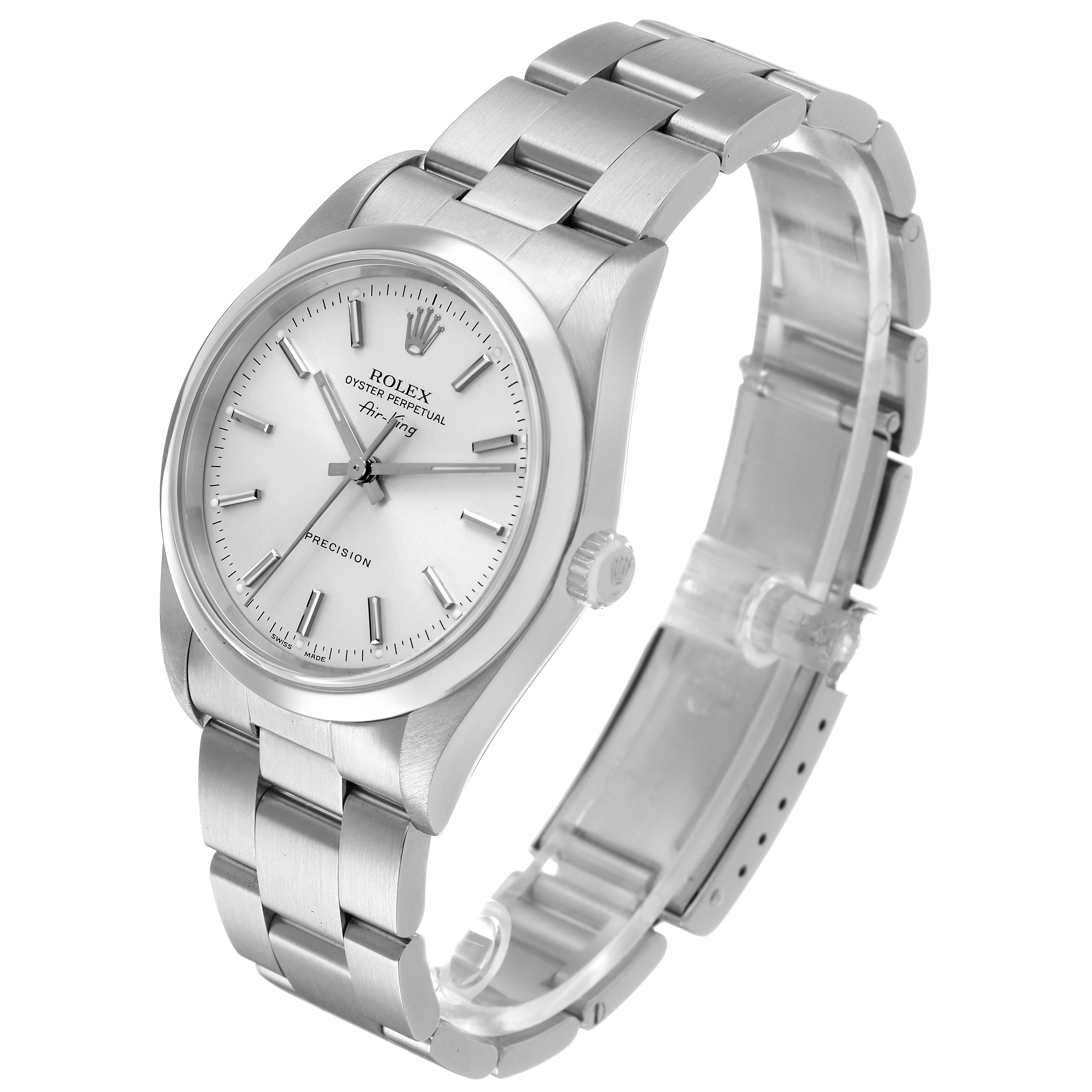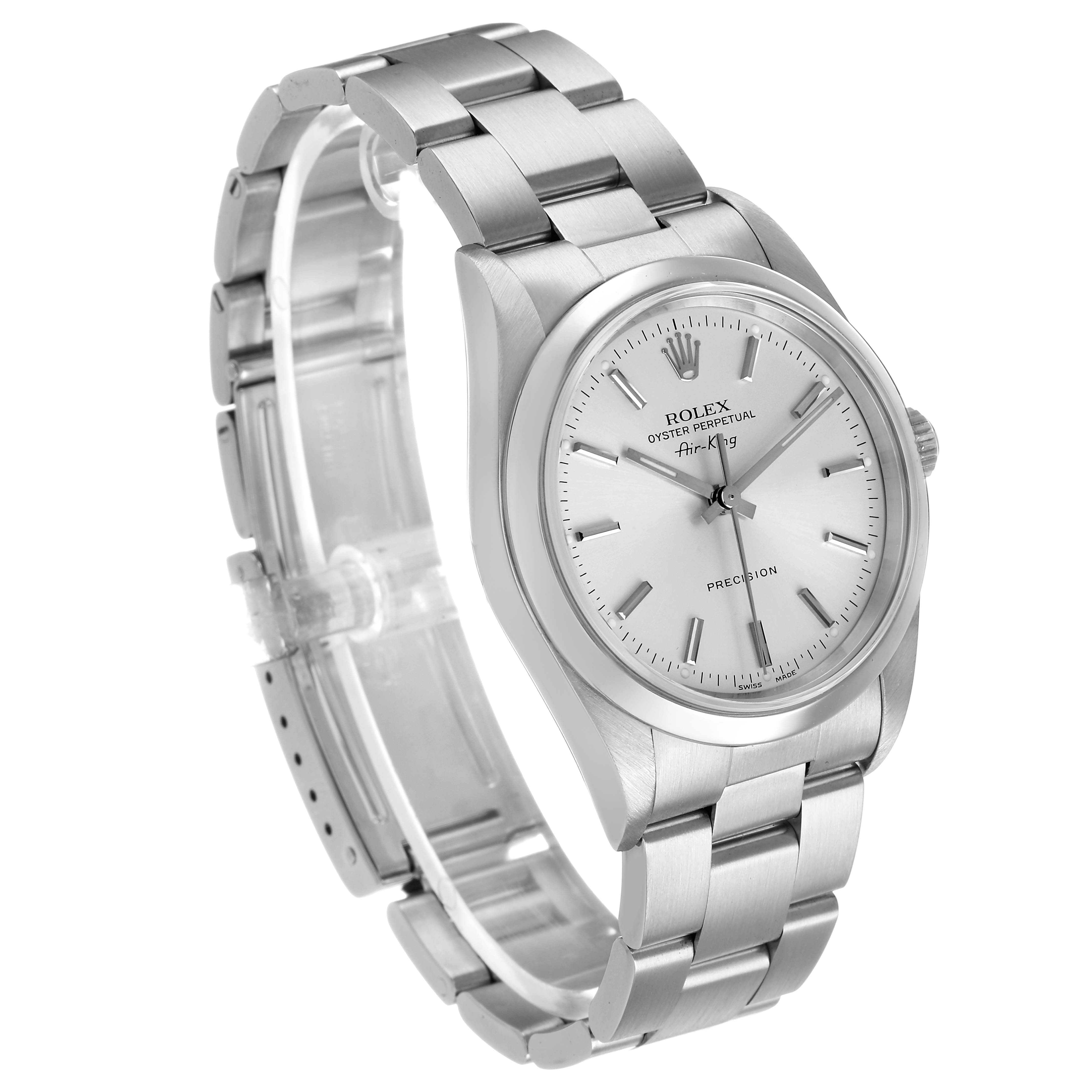 Rolex Air King Steel Silver Dial Smooth Bezel Mens Watch 14000. Automatic self-winding movement. Stainless steel oyster case 34.0 mm in diameter. Rolex logo on the crown. Stainless steel smooth domed bezel. Scratch resistant sapphire crystal. Silver dial with luminescent baton hands and hour markers. Outer minute and 1/2-second markers. Stainless steel oyster bracelet with a fold-over clasp. Fits a 7 1/2" wrist.