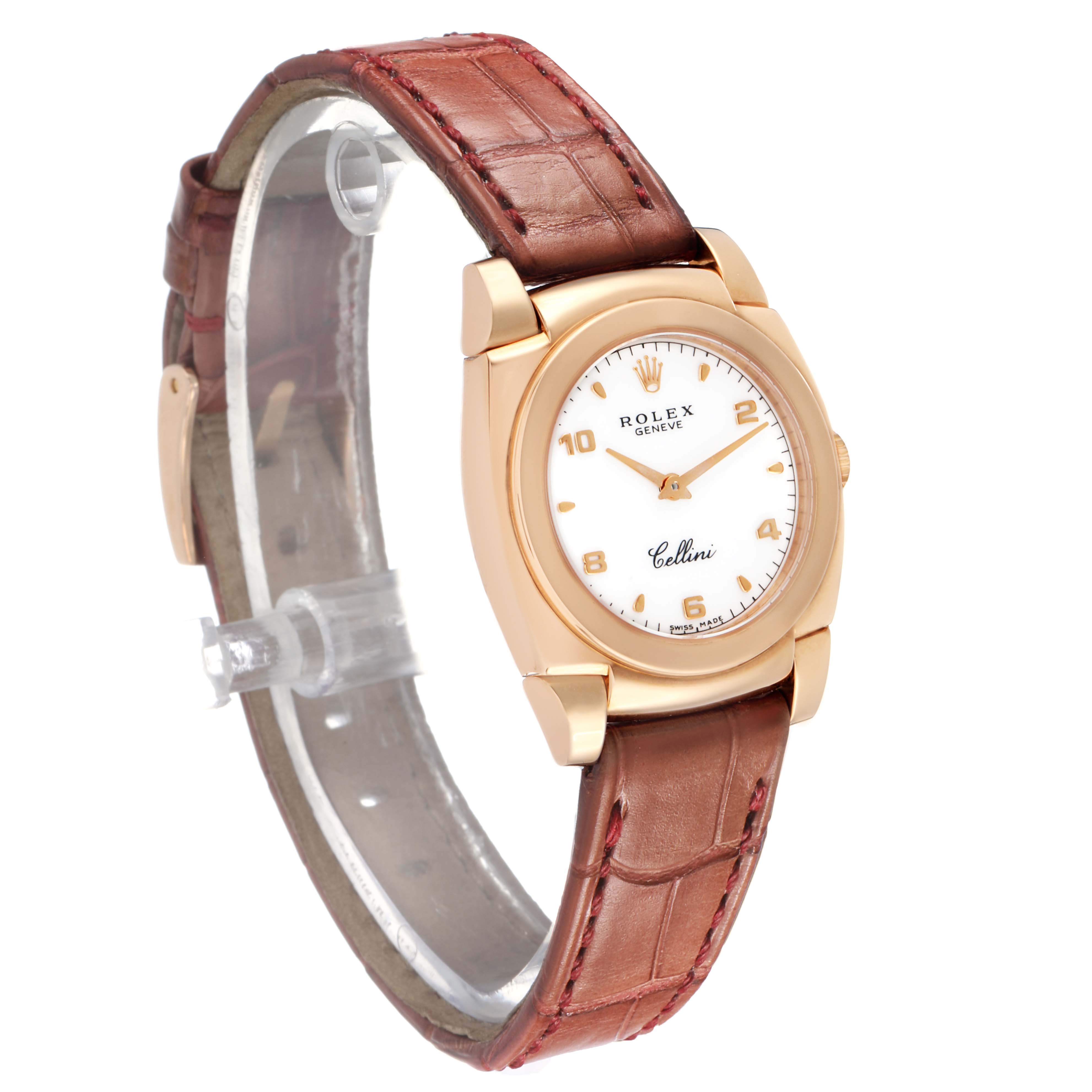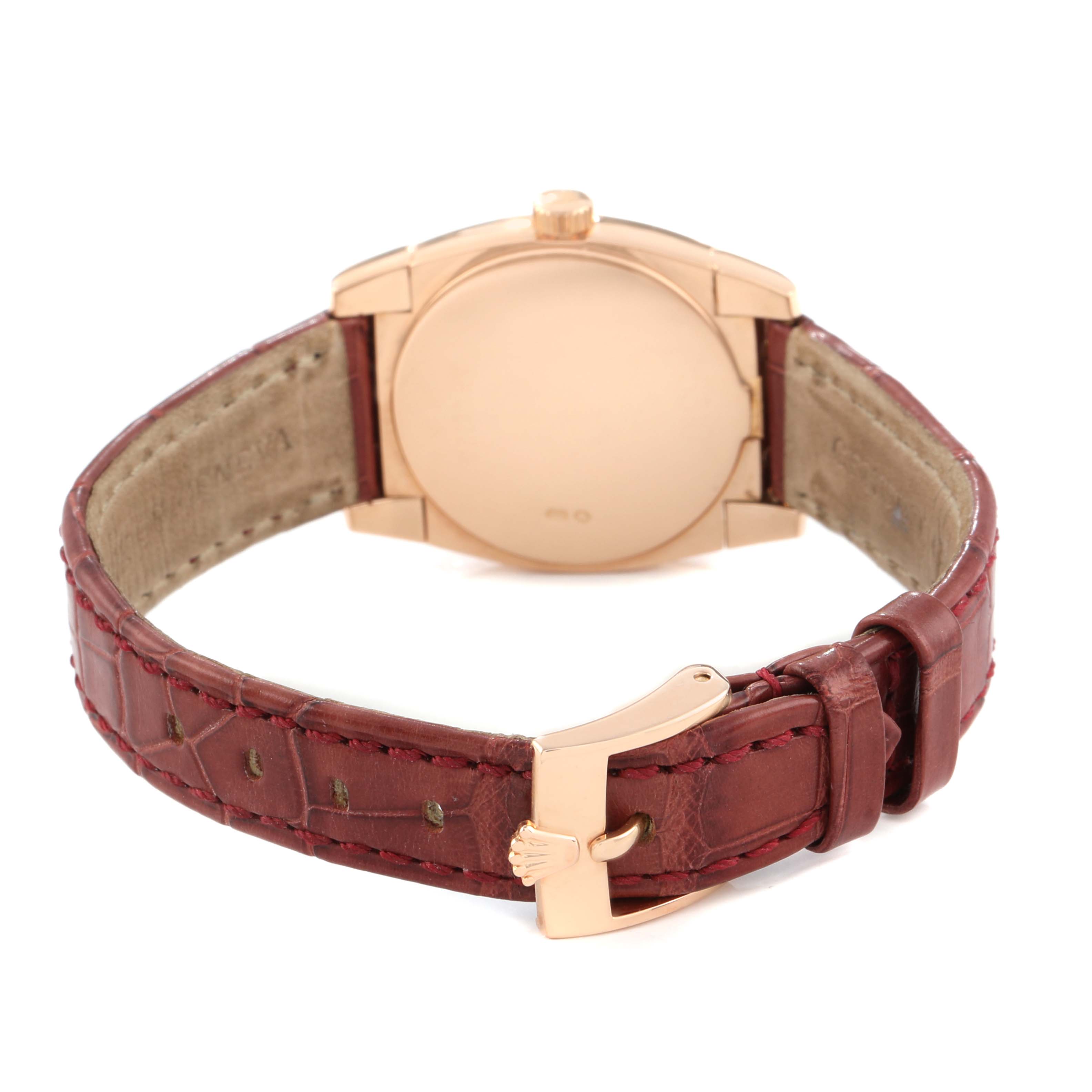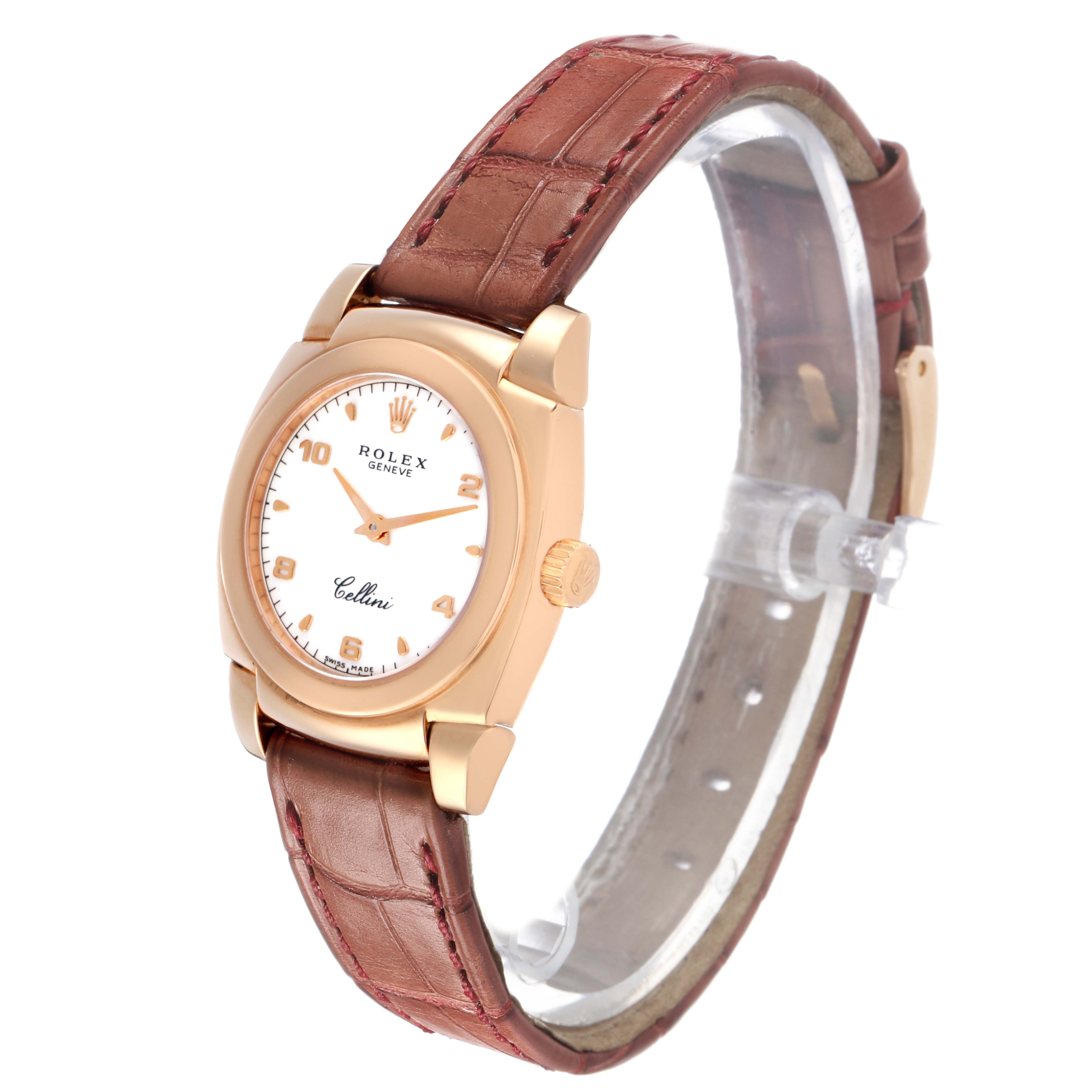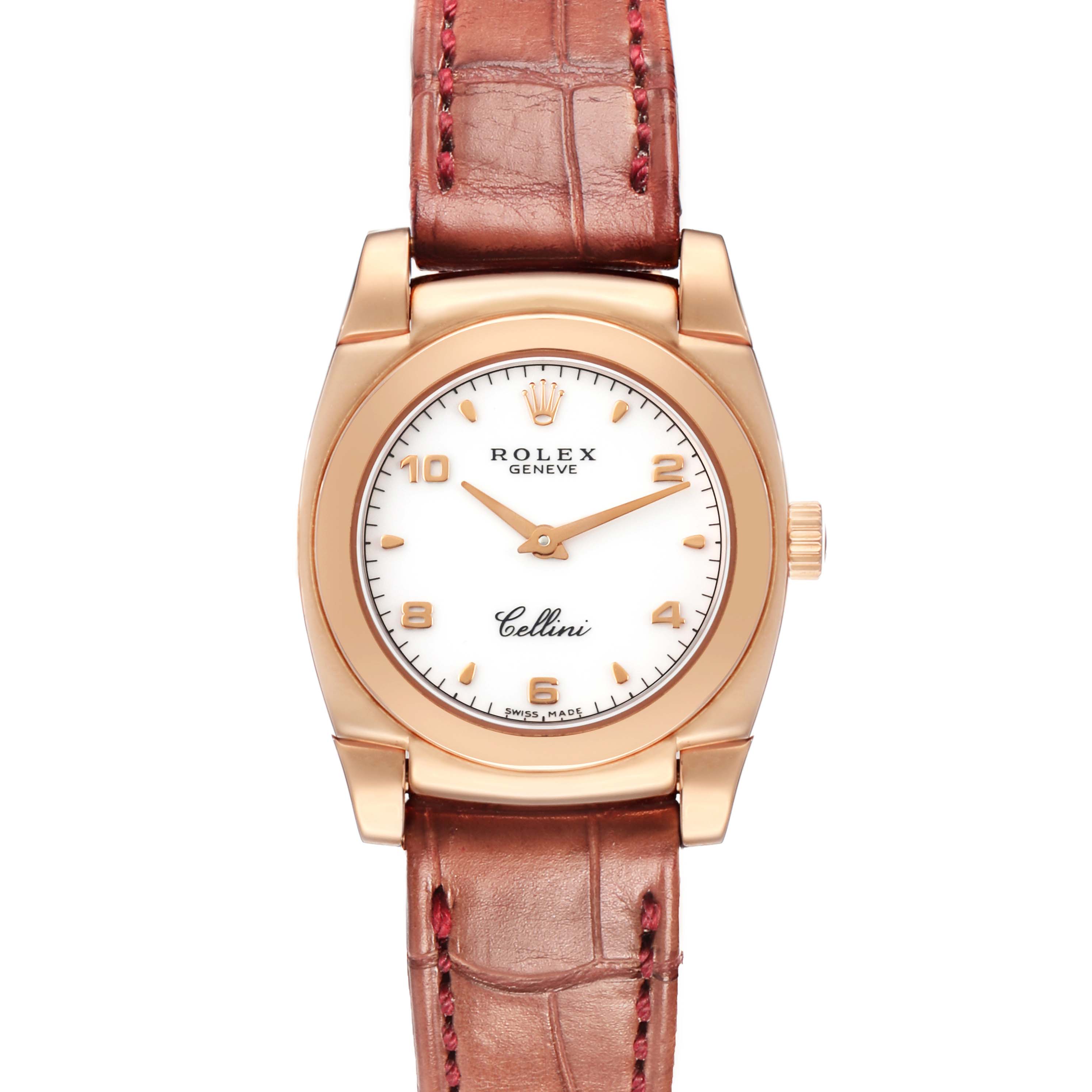 Rolex Cellini Cestello Rose Gold White Dial Ladies Watch 5310. Manual winding movement. 18k rose gold case 26.0 mm in diameter. Rolex logo on a crown. . Scratch resistant sapphire crystal. Flat profile. White dial with arabic numerals and teadrop hour markers. Brown leather strap with 18k rose gold tang buckle. Additional maroon leather strap.