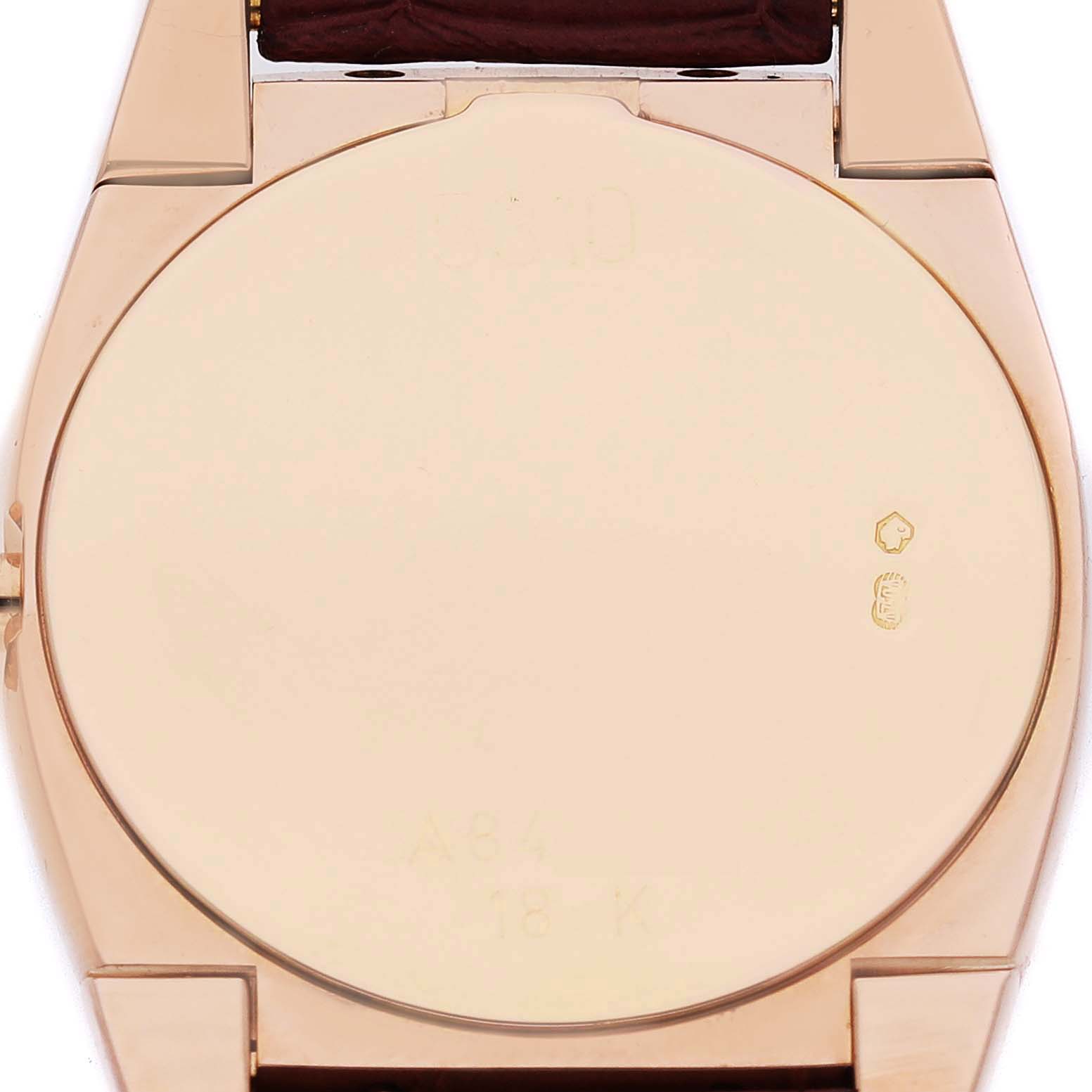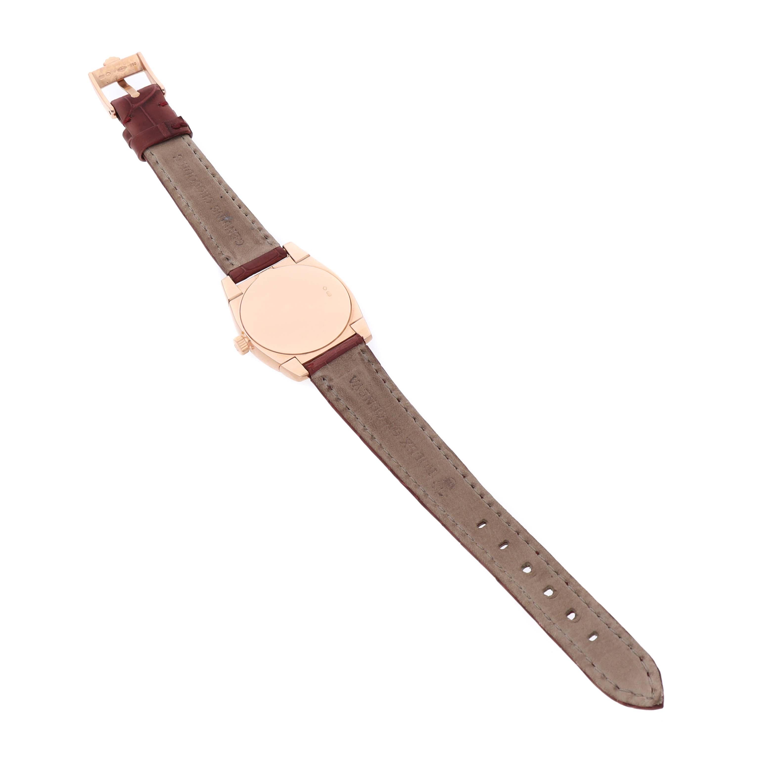 | Bracelet: | Brown leather strap with 18k rose gold tang buckle. Additional maroon leather strap. |