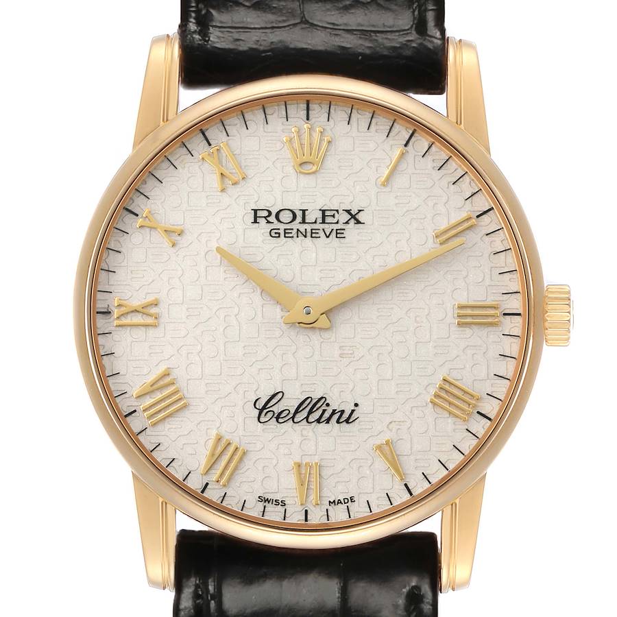 Rolex Cellini Classic Yellow Gold Ivory Anniversary Dial Mens Watch 5116 Papers. Manual winding movement. 18k yellow gold slim round case 31.8mm in diameter. Rolex logo on the crown. . Scratch resistant sapphire crystal. Flat profile. Ivory jubilee anniversary dial with raised yellow gold Roman numerals and outer stick minute markers. Yellow gold dauphine hands. Black leather strap with an 18k yellow gold tang buckle.
