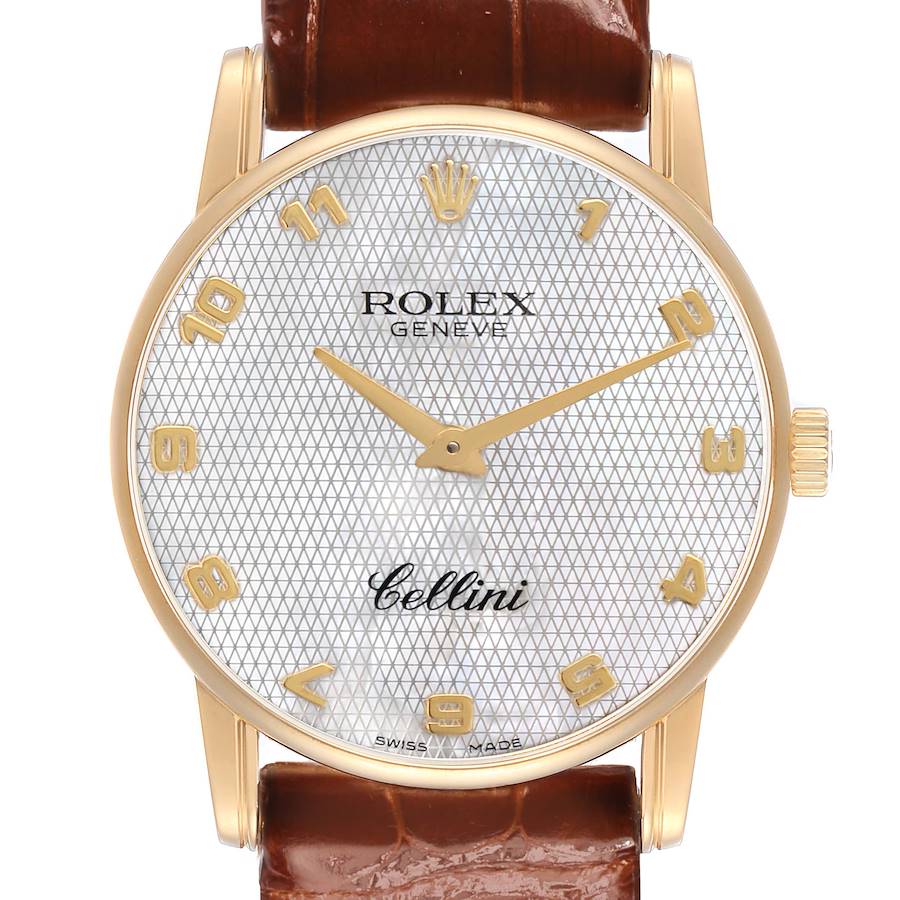 | Case: | 18k yellow gold slim round case 31.8mm in diameter. Rolex logo on the crown. |
