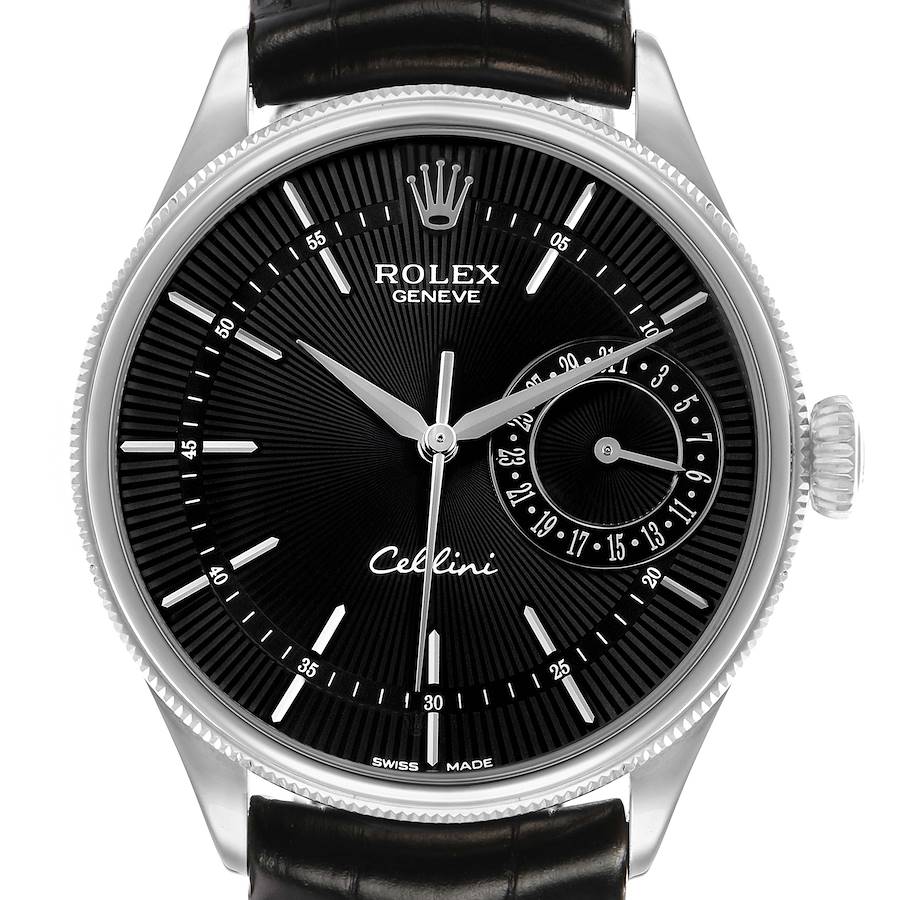 Rolex Cellini Date White Gold Automatic Black Dial Mens Watch 50519. Automatic self-winding movement. Officially certified Swiss chronometer (COSC). Paramagnetic blue Parachrom hairspring. Bidirectional self-winding via Perpetual rotor. 18K white gold round case 39 mm in diameter. Rolex logo on the crown. . Scratch resistant sapphire crystal. Black sunburst guilloche dial with raised white gold baton hour markers. Fine printed minute/seconds track. Date subdial at 3 o'clock. Black alligator leather strap with 18K white gold tang buckle.