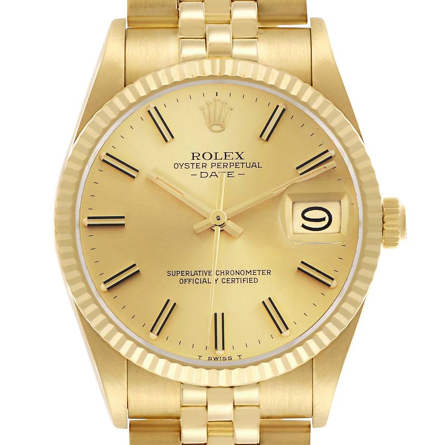 Rolex Date 14k Yellow Gold Vintage Mens Watch 15037. Officially certified chronometer self-winding movement. 14k yellow gold oyster case 34.0 mm in diameter. Rolex logo on the crown. 14k yellow gold fluted bezel. Acrylic crystal with a cyclops magnifier. Champagne dial with yellow gold baton hands and hour markers. Date calendar at the 3 o'clock aperture. 14k yellow gold jubilee bracelet with a fold-over clasp. Fits up to a 7 3/4" wrist.