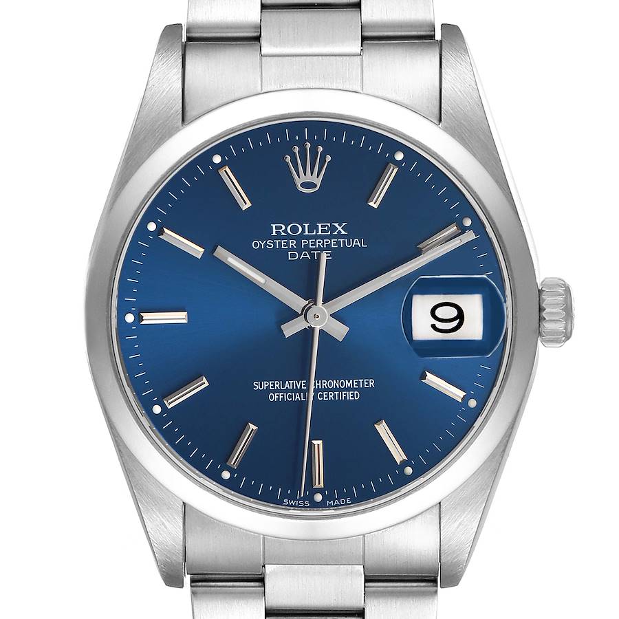Rolex Date 34 Blue Dial Smooth Bezel Steel Mens Watch 15200. Officially certified chronometer automatic self-winding movement. Stainless steel oyster case 34.0 mm in diameter. Rolex logo on the crown. Stainless steel smooth domed bezel. Scratch resistant sapphire crystal with a cyclops magnifier. Blue dial with steel baton hour markers and luminescent hands. Date calendar at the 3 o'clock aperture. Outer stick minute markers. Stainless steel oyster bracelet with a folding clasp. Fits a 7 1/4" wrist.
