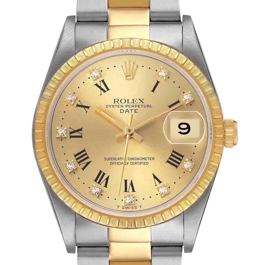 Rolex Date Champagne Roman Diamond Dial Steel Yellow Gold Mens Watch 15223. Officially certified chronometer self-winding movement with quickset date function. Stainless steel and 18K yellow gold oyster case 34.0 mm in diameter. Rolex logo on the crown. 18K yellow gold engine turned bezel. Scratch resistant sapphire crystal with a cyclops magnifier. Champagne dial with black Roman numeral hour markers accented with original Rolex factory diamonds. Yellow gold baton hands. Date window at the 3 o'clock aperture. Stainless steel and 18K yellow gold jubilee bracelet with a fold-over clasp. Fits a 7 1/4" wrist.