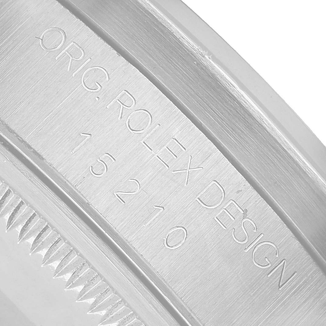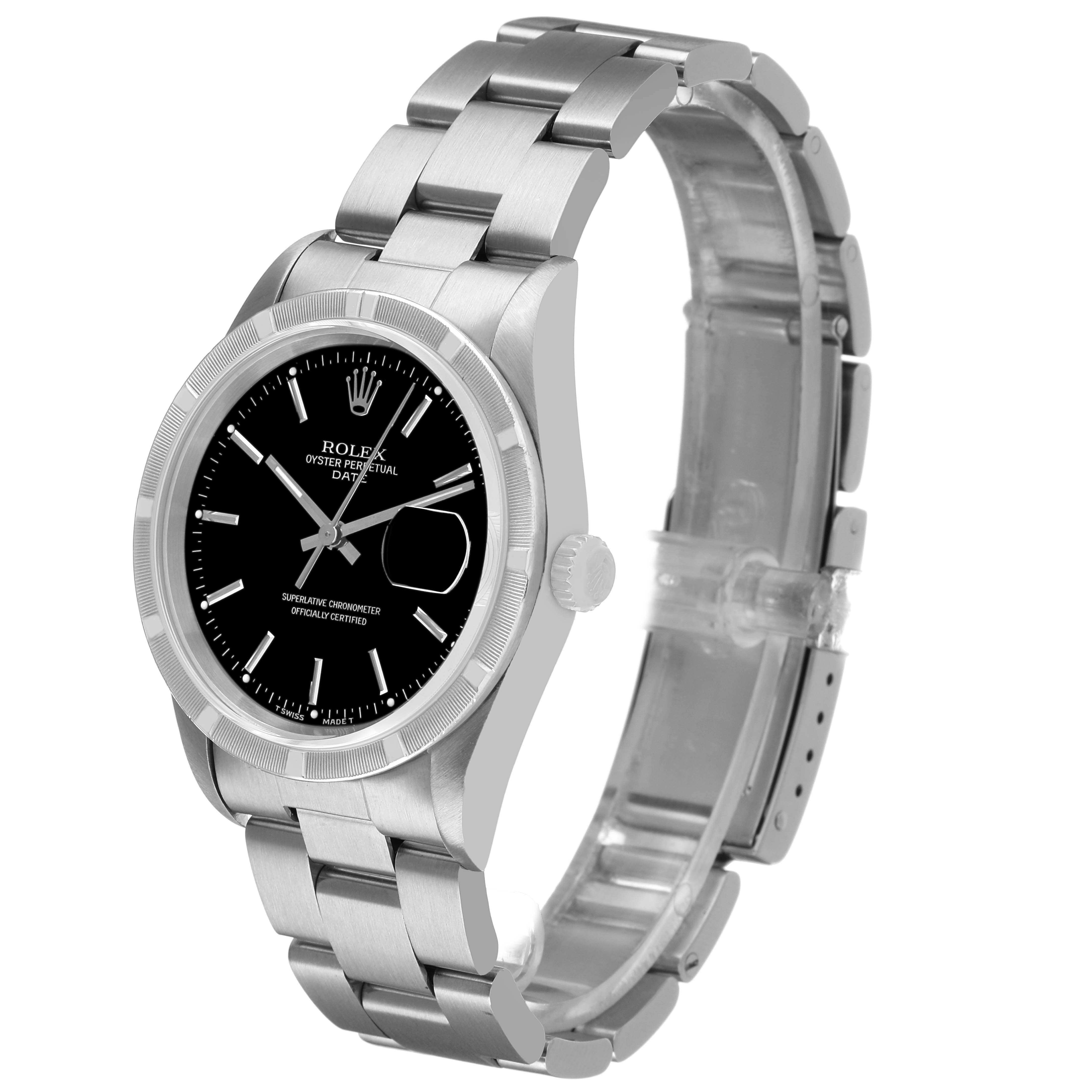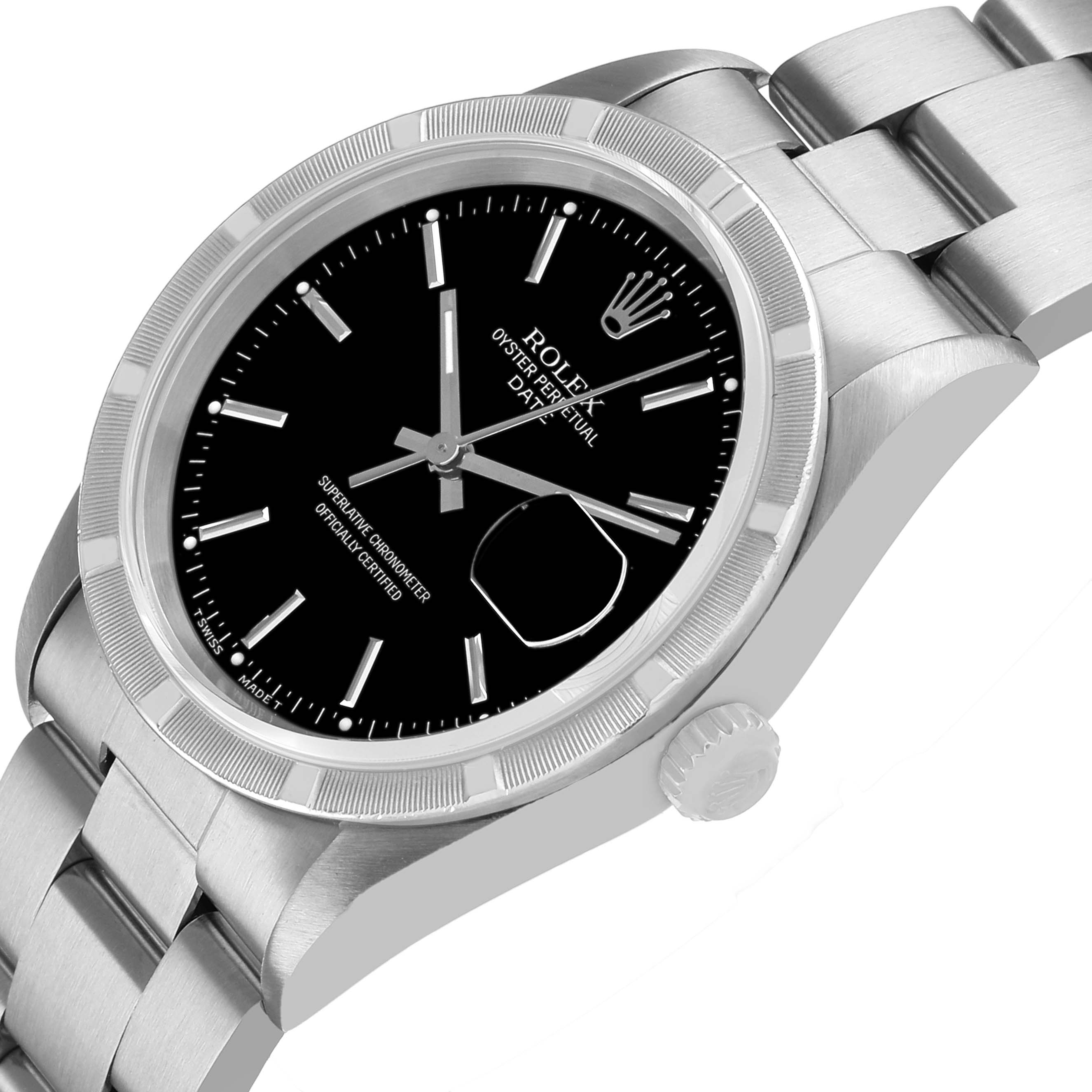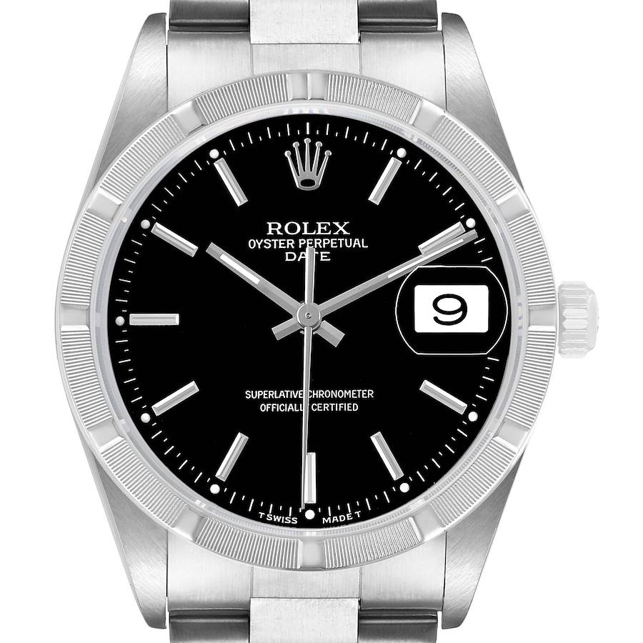 Rolex Date Steel Black Dial Engine Turned Bezel Mens Watch 15210. Officially certified chronometer automatic self-winding movement. Stainless steel oyster case 34.0 mm in diameter. Rolex logo on the crown. Stainless steel engine-turned bezel. Scratch resistant sapphire crystal with a cyclops magnifier. Black dial with luminescent baton hour markers and hands. Date calendar at the 3 o'clock aperture. Stainless steel oyster bracelet with a fold-over clasp. Fits a 7 1/2" wrist.