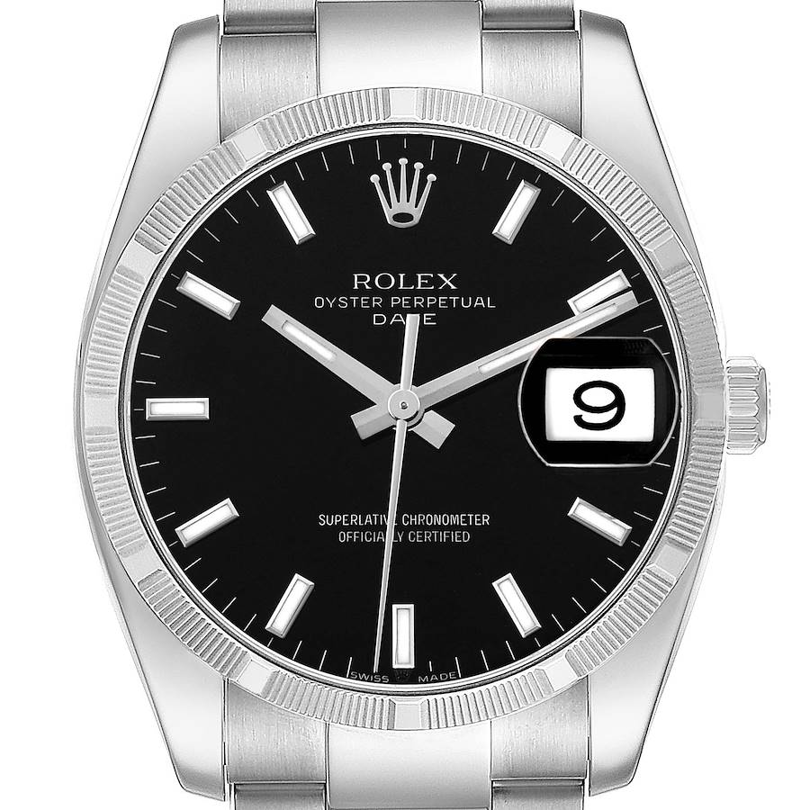 Rolex Date Steel Black Dial Mens Watch 115210 Card. Officially certified chronometer self-winding movement with quickset date. Stainless steel case 34.0 mm in diameter. High polished lugs. Rolex logo on a crown. Stainless steel engine turned bezel. Scratch resistant sapphire crystal with cyclops magnifier. Black dial with luminous baton hour markers. Minute markers around the outer rim. Date window at 3 o'clock aperture. Stainless steel oyster bracelet with a oysterlock clasp. Fits 7 1/4" wrist.