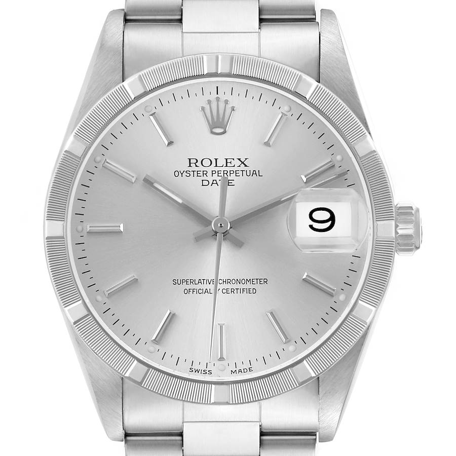 Rolex Date Steel Engine Turned Bezel Silver Dial Mens Watch 15210. Officially certified chronometer automatic self-winding movement. Stainless steel oyster case 34.0 mm in diameter. Rolex logo on the crown. Stainless steel engine-turned bezel. Scratch resistant sapphire crystal with a cyclops magnifier. Silver dial with baton hands and hour markers. Outer minute and 1/2 second stick markers. Date calendar at the 3 o'clock aperture. Stainless steel oyster bracelet with a fold-over clasp. Fits a 7 1/2" wrist.