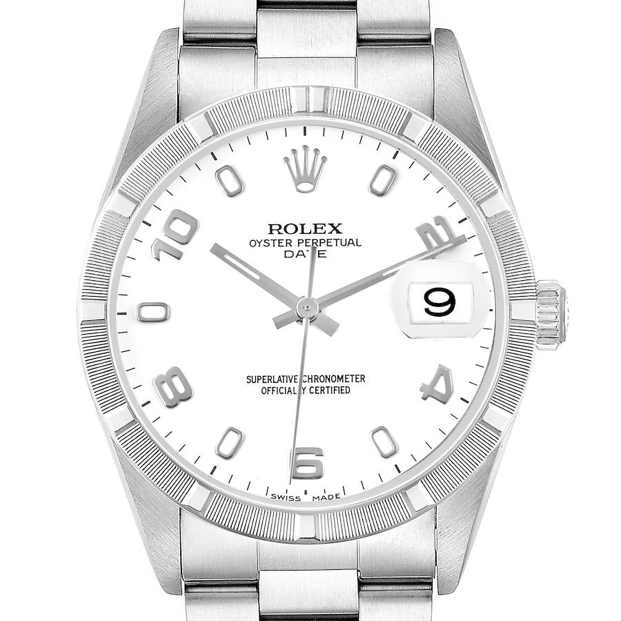 Rolex Date Steel White Dial Engine Turned Bezel Mens Watch 15210. Officially certified chronometer self-winding movement. Stainless steel oyster case 34.0 mm in diameter. Rolex logo on the crown. Stainless steel engine turned bezel. Scratch resistant sapphire crystal with cyclops magnifier. White dial with applied luminous baton hour markers and Arabic numerals. Date window at 3 o'clock aperture. Stainless steel oyster bracelet with fold over clasp. Fits a 7" wrist.