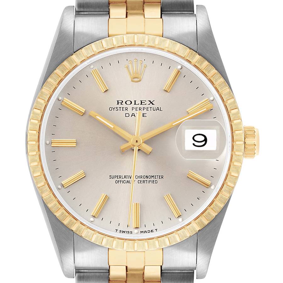 Rolex Date Steel Yellow Gold Silver Dial Mens Watch 15223 Box Papers. Officially certified chronometer automatic self-winding movement. Stainless steel and 18K yellow gold oyster case 34.0 mm in diameter. Rolex logo on the 18k yellow gold crown. 18K yellow gold engine turned bezel. Scratch resistant sapphire crystal with a cyclops magnifier. Patinaed silver dial with yellow gold baton hour markers and luminescent-inlayed hands. Date calendar at the 3 o'clock aperture. Stainless steel and 18K yellow gold oyster bracelet with a fold-over clasp. Fits a 7" wrist.