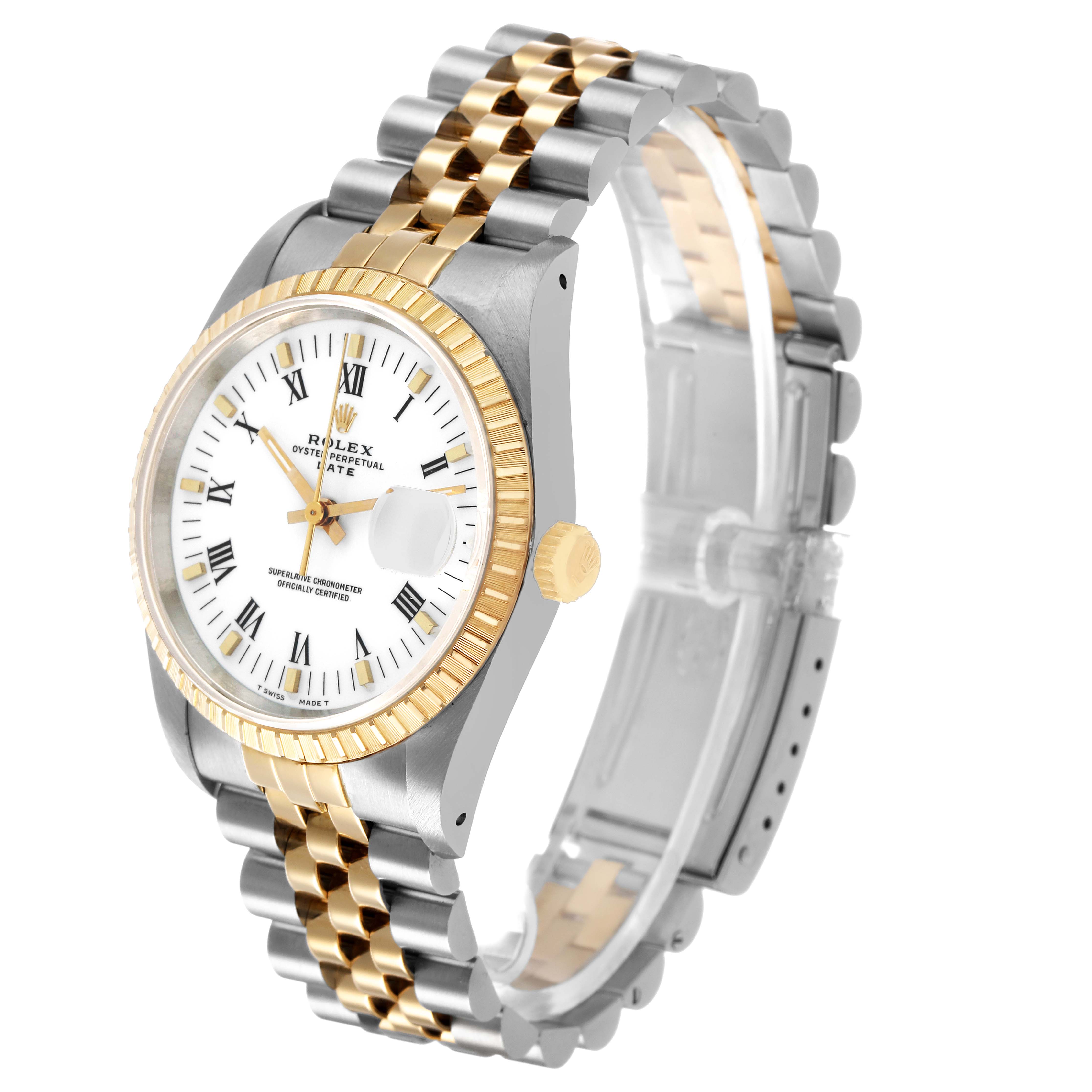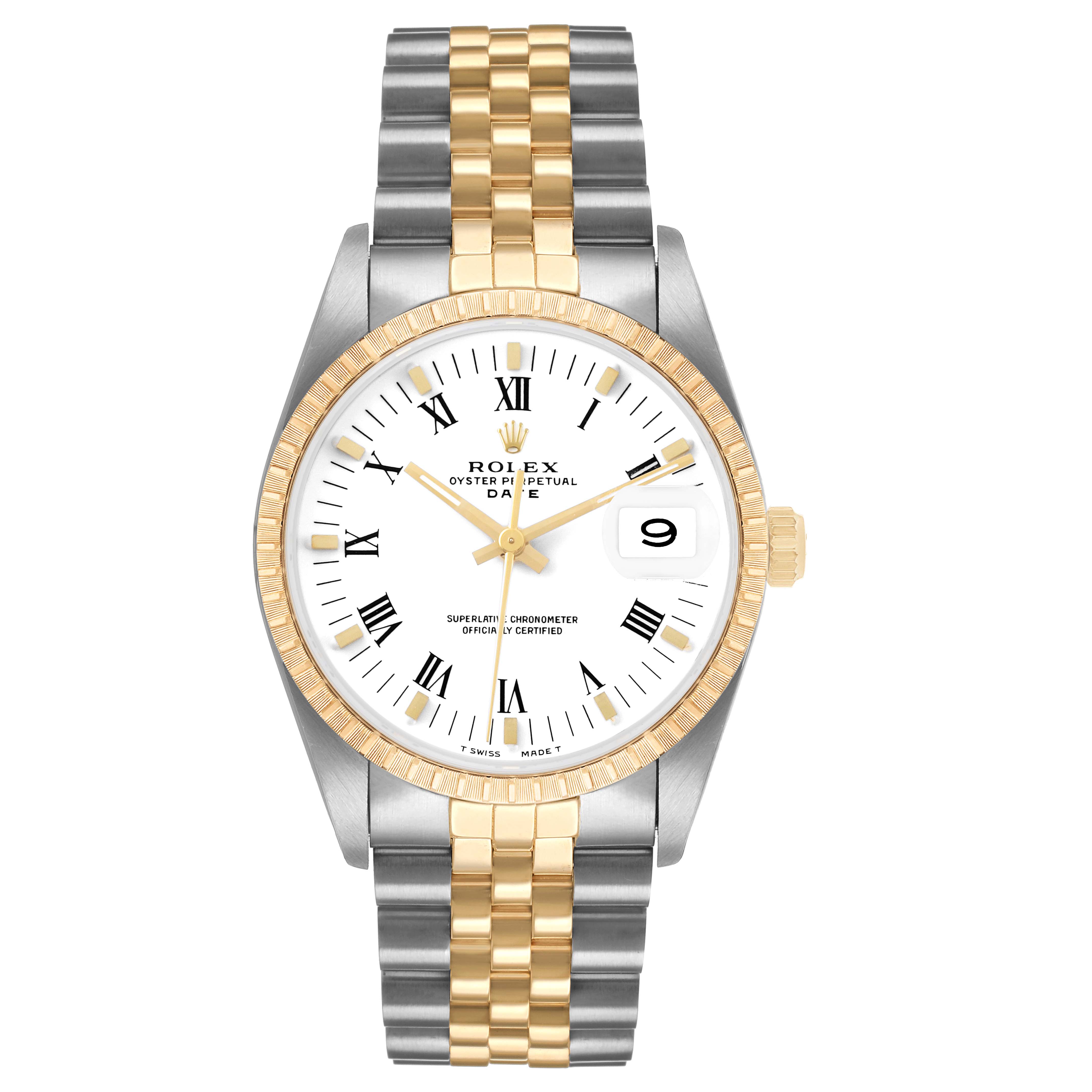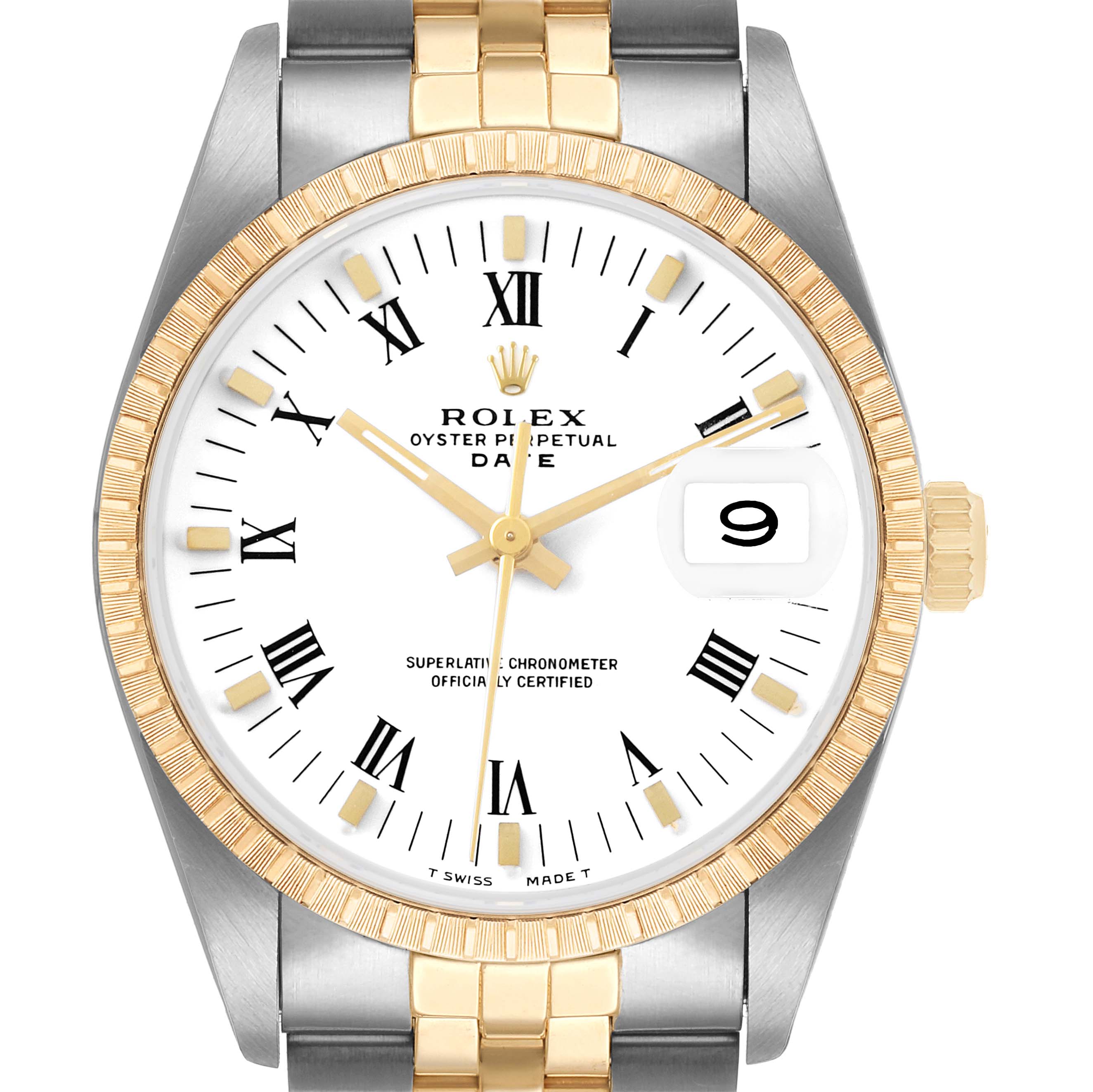 Rolex Date Steel Yellow Gold White Diamond Dial Mens Watch 15223. Officially certified chronometer self-winding movement with quickset date function. Stainless steel and 18K yellow gold oyster case 34.0 mm in diameter. Rolex logo on the crown. 18K yellow gold engine turned bezel. Scratch resistant sapphire crystal with a cyclops magnifier. White dial with black Roman numeral hour markers accented with original Rolex factory diamond. Yellow gold baton hands. Date window at the 3 o'clock aperture. Stainless steel and 18K yellow gold jubilee bracelet with a fold-over clasp. Fits a 7" wrist.
