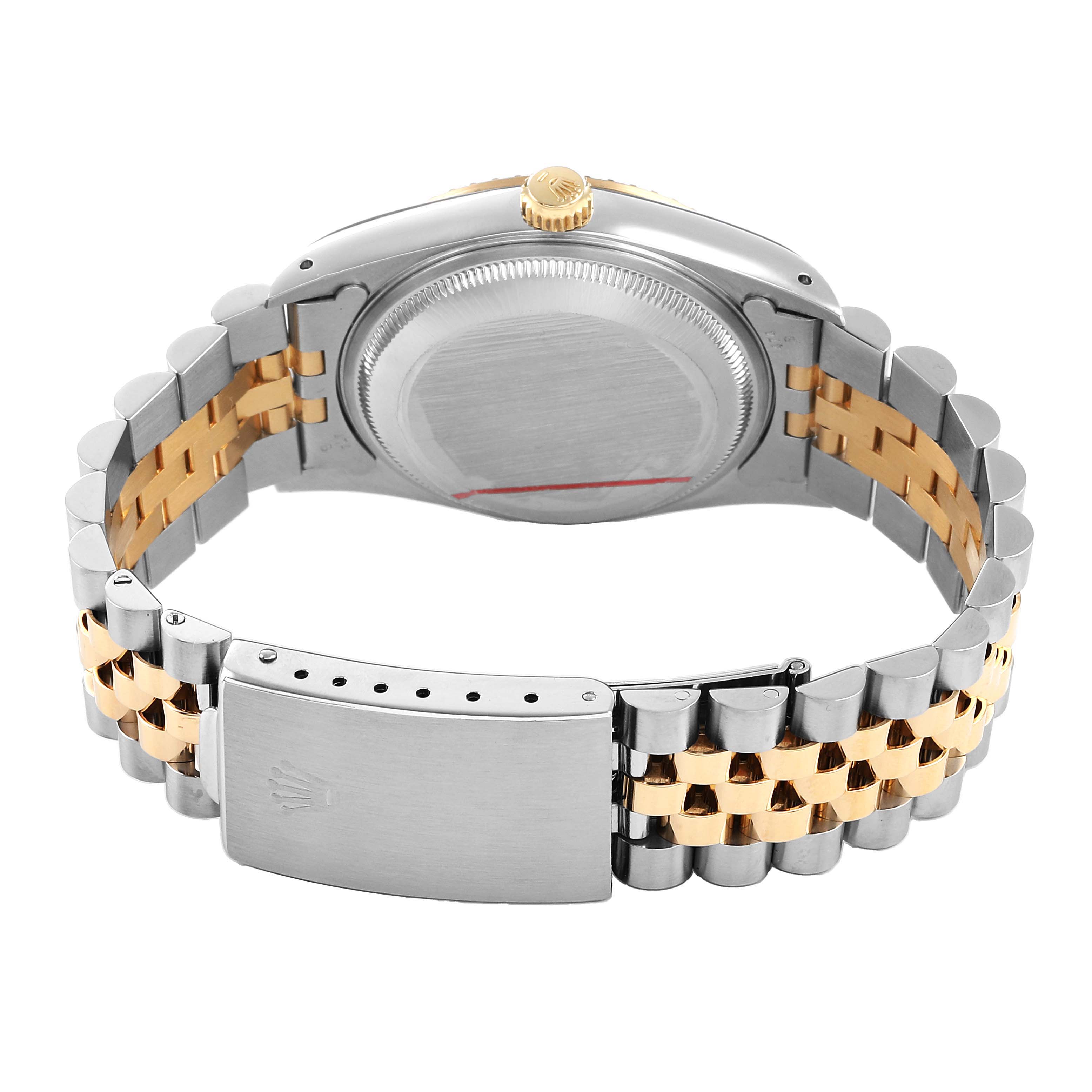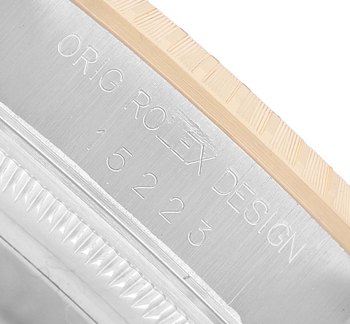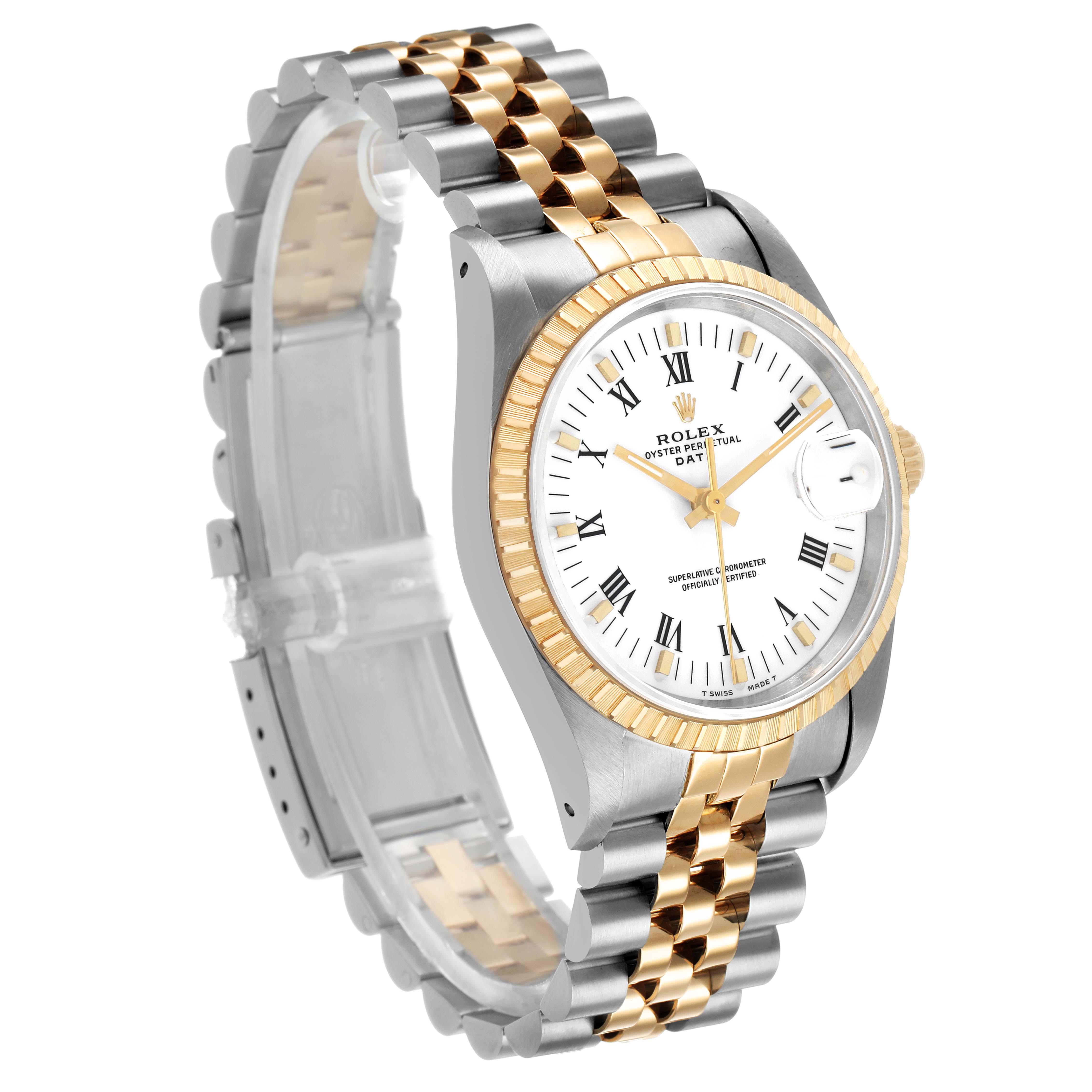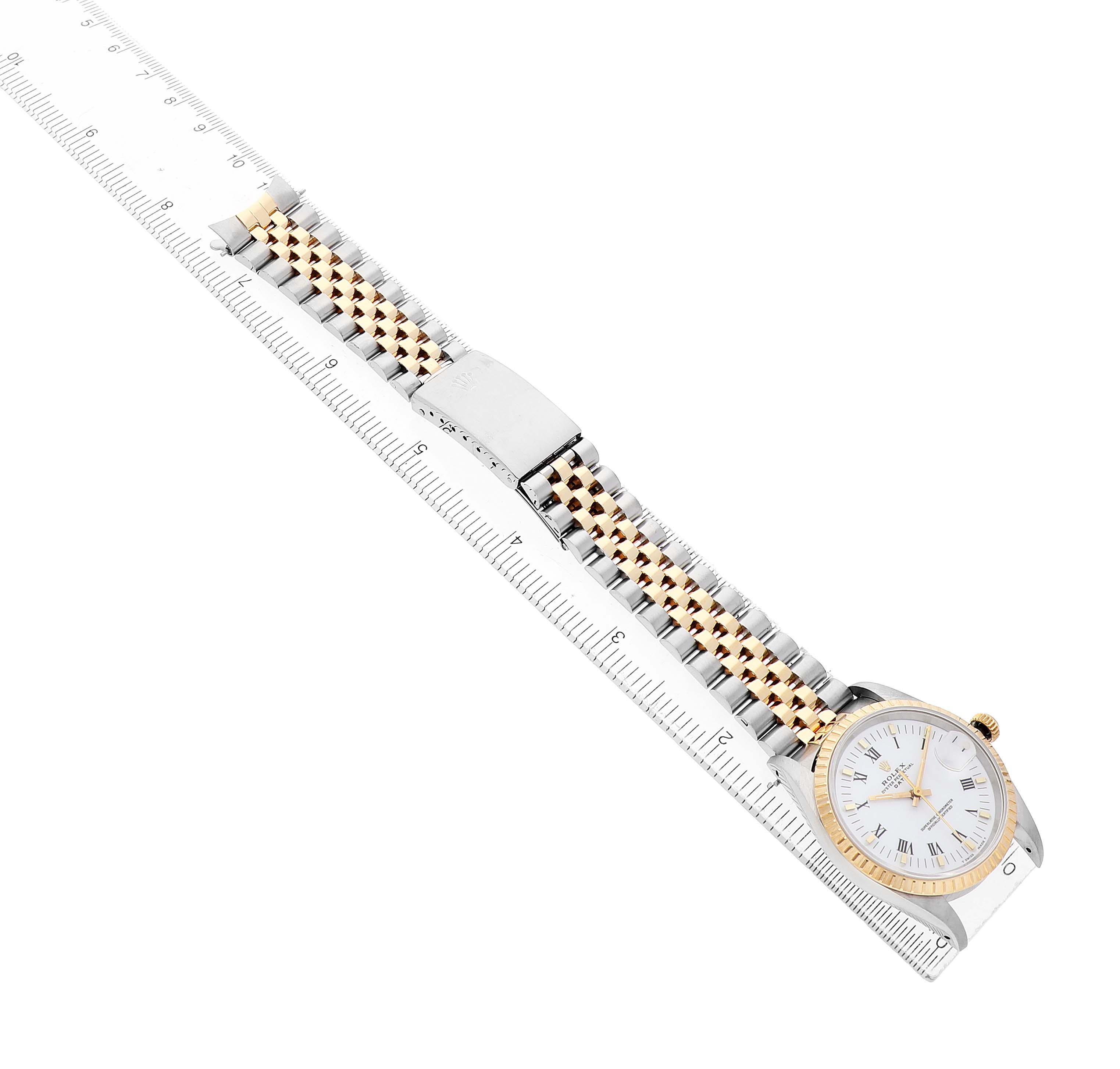 Rolex Date Steel Yellow Gold White Diamond Dial Mens Watch 15223. Officially certified chronometer self-winding movement with quickset date function. Stainless steel and 18K yellow gold oyster case 34.0 mm in diameter. Rolex logo on the crown. 18K yellow gold engine turned bezel. Scratch resistant sapphire crystal with a cyclops magnifier. White dial with black Roman numeral hour markers accented with original Rolex factory diamond. Yellow gold baton hands. Date window at the 3 o'clock aperture. Stainless steel and 18K yellow gold jubilee bracelet with a fold-over clasp. Fits a 7" wrist.
