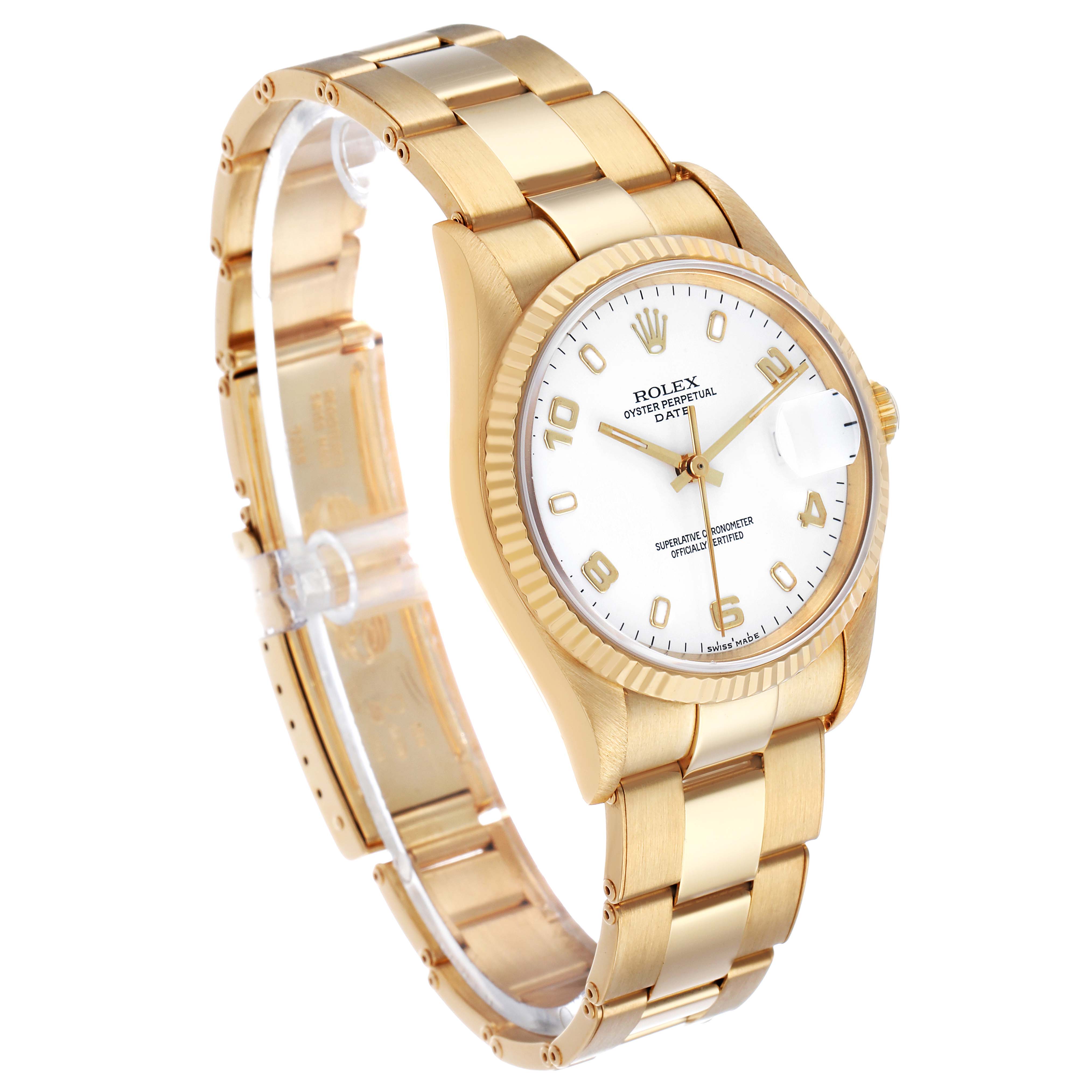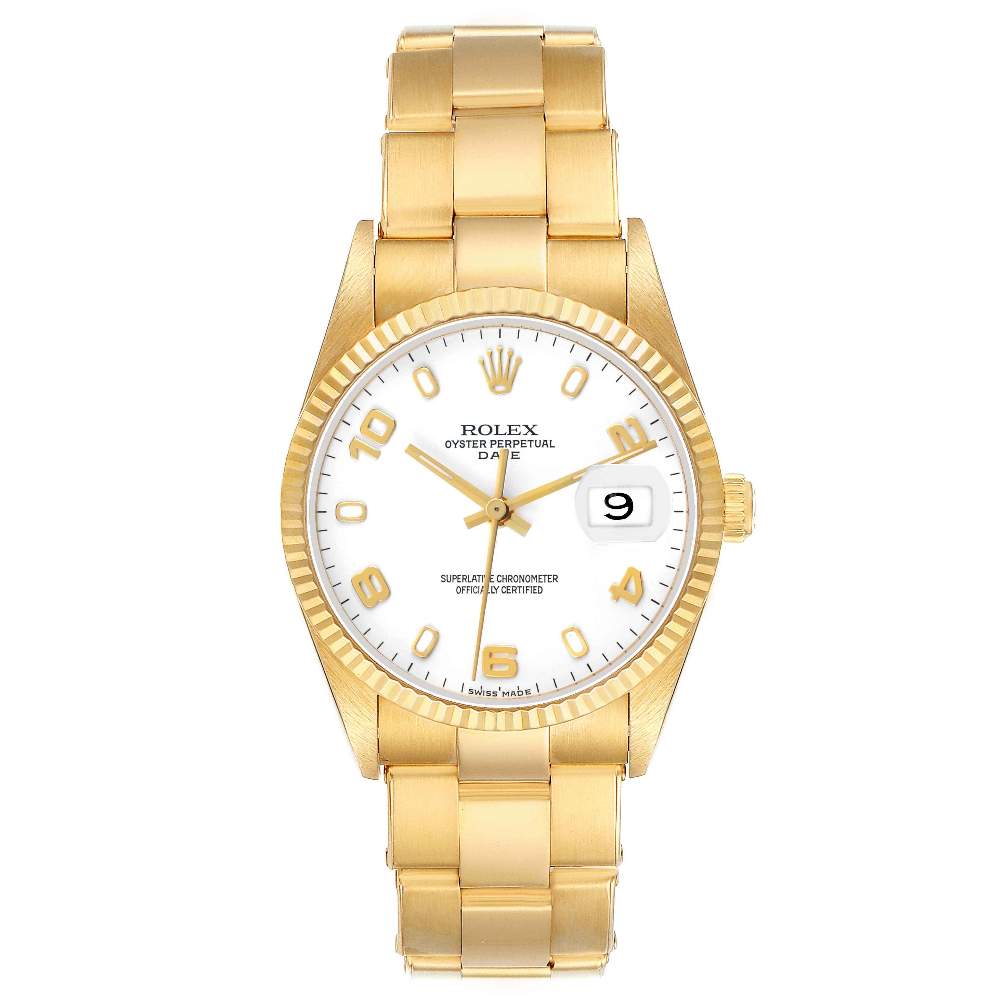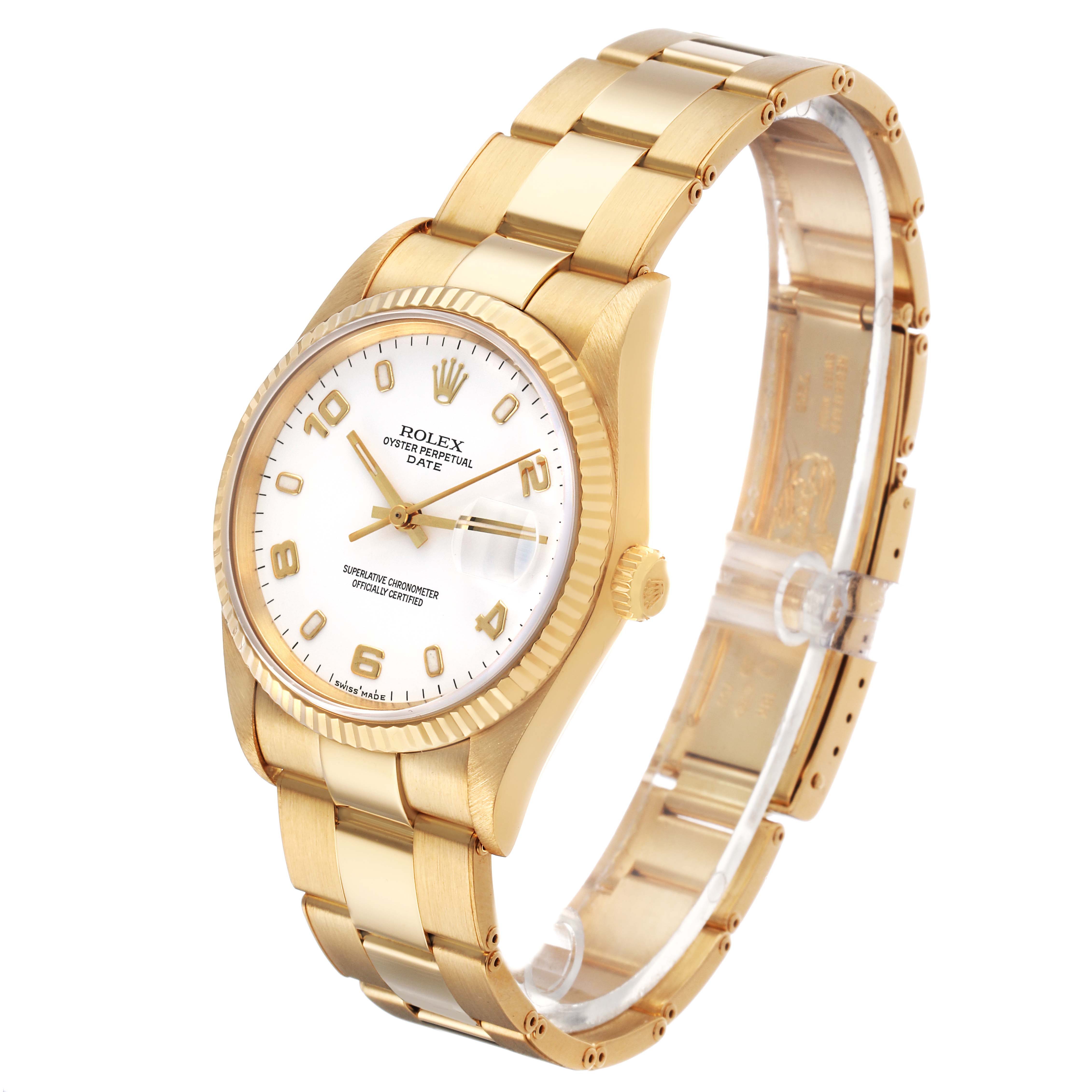 Rolex Date White Dial Yellow Gold Mens Watch 15238 Box Papers. Officially certified chronometer self-winding movement. 18k yellow gold case 34.0 mm in diameter. Rolex logo on a yellow gold crown. 18k yellow gold fluted bezel. Scratch resistant sapphire crystal with cyclops magnifier. White dial with arabic numeral and index hour markers. Yellow gold baton hands. Date window at 3 o'clock aperture. 18k yellow gold oyster bracelet with a fold-over clasp. Fits an 7 3/4'' wrist.